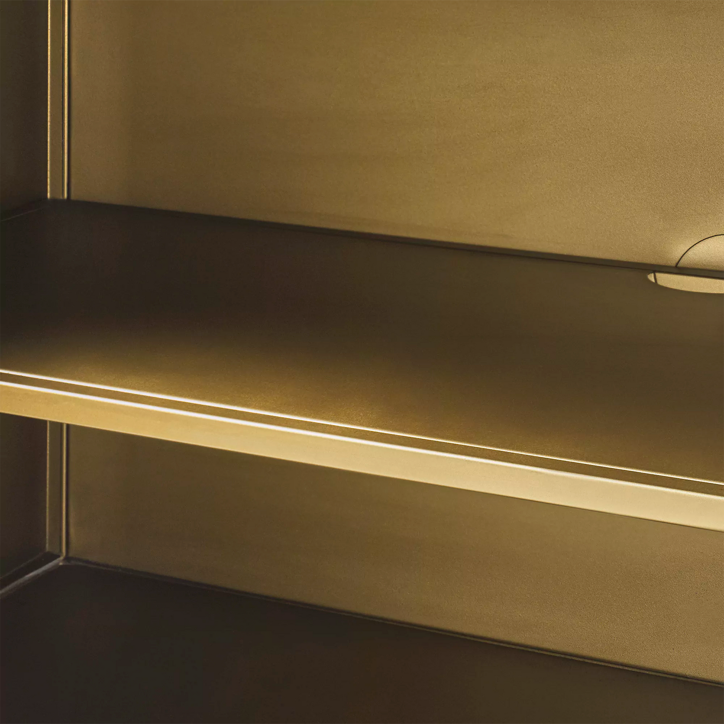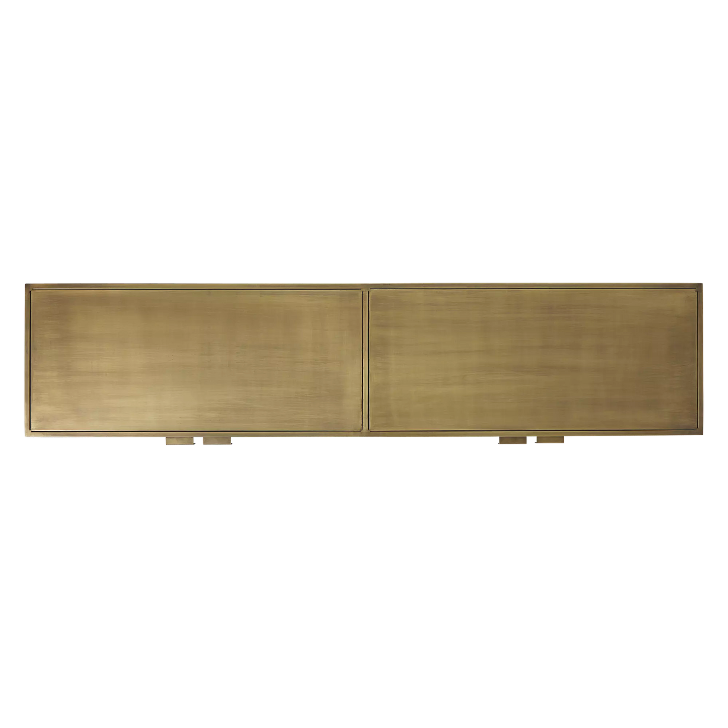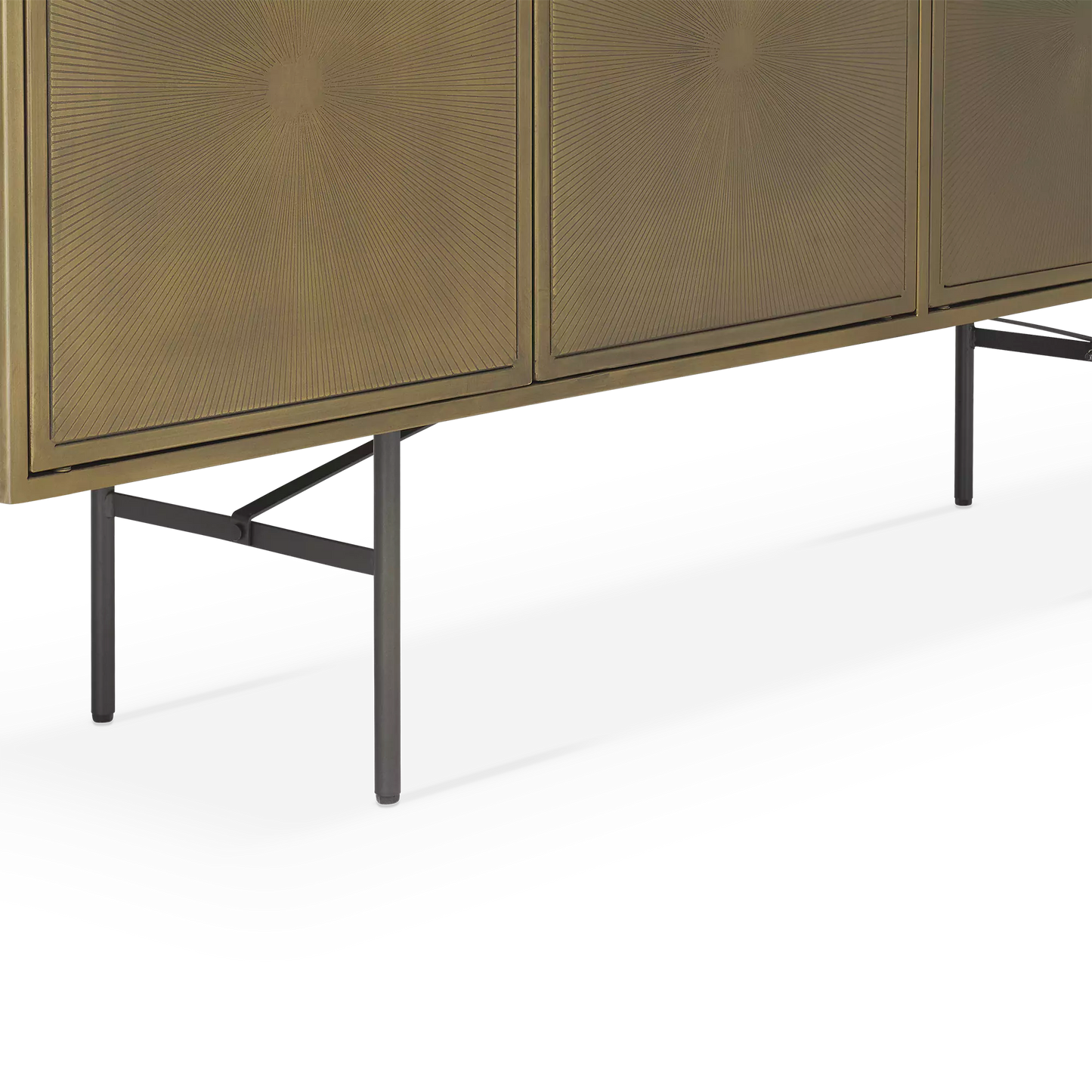 Made of antique brass, the Sunburst sideboard evokes the glamour of Hollywood Regency style. Its raw metal legs give it an industrial touch and broadens its styling potential. It’s divided into two compartments, each with a shelf to help optimize your storage space.