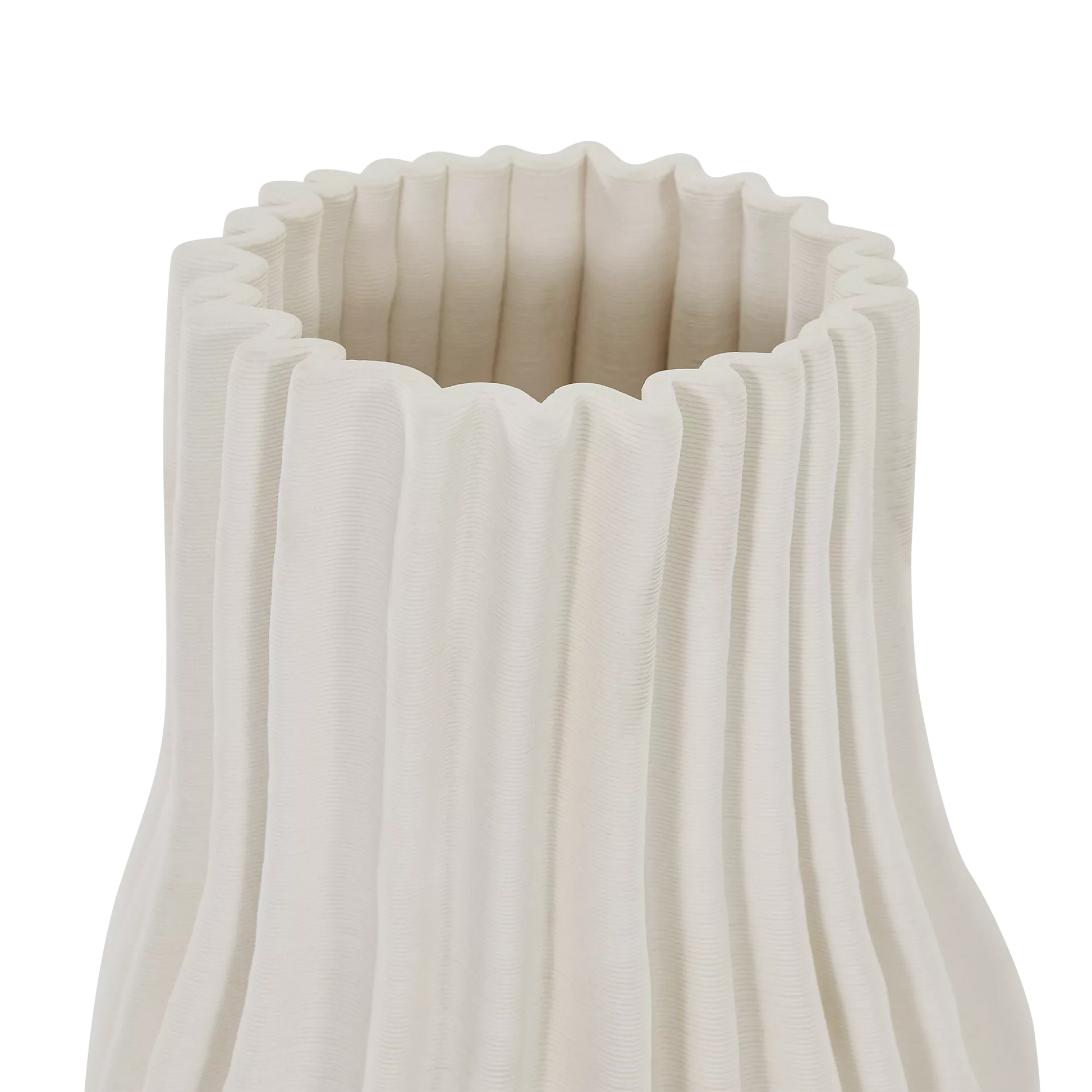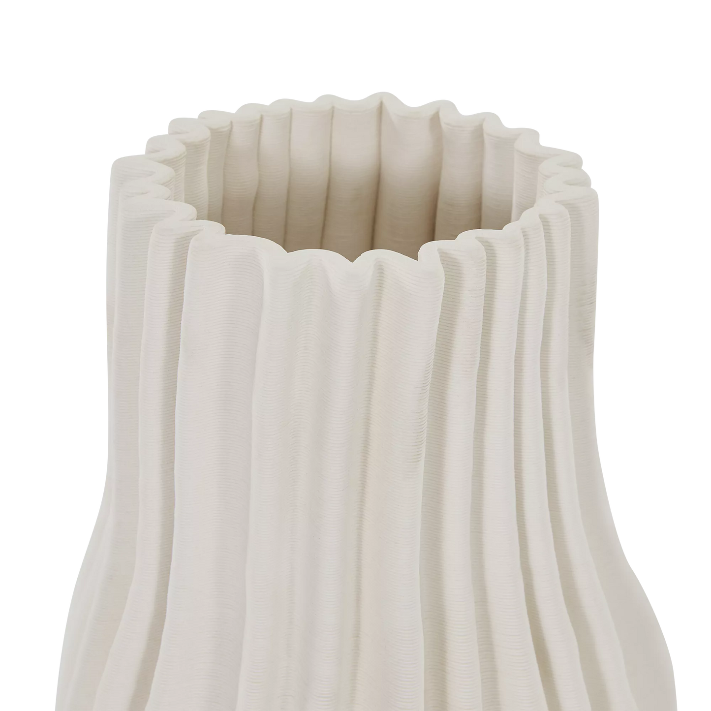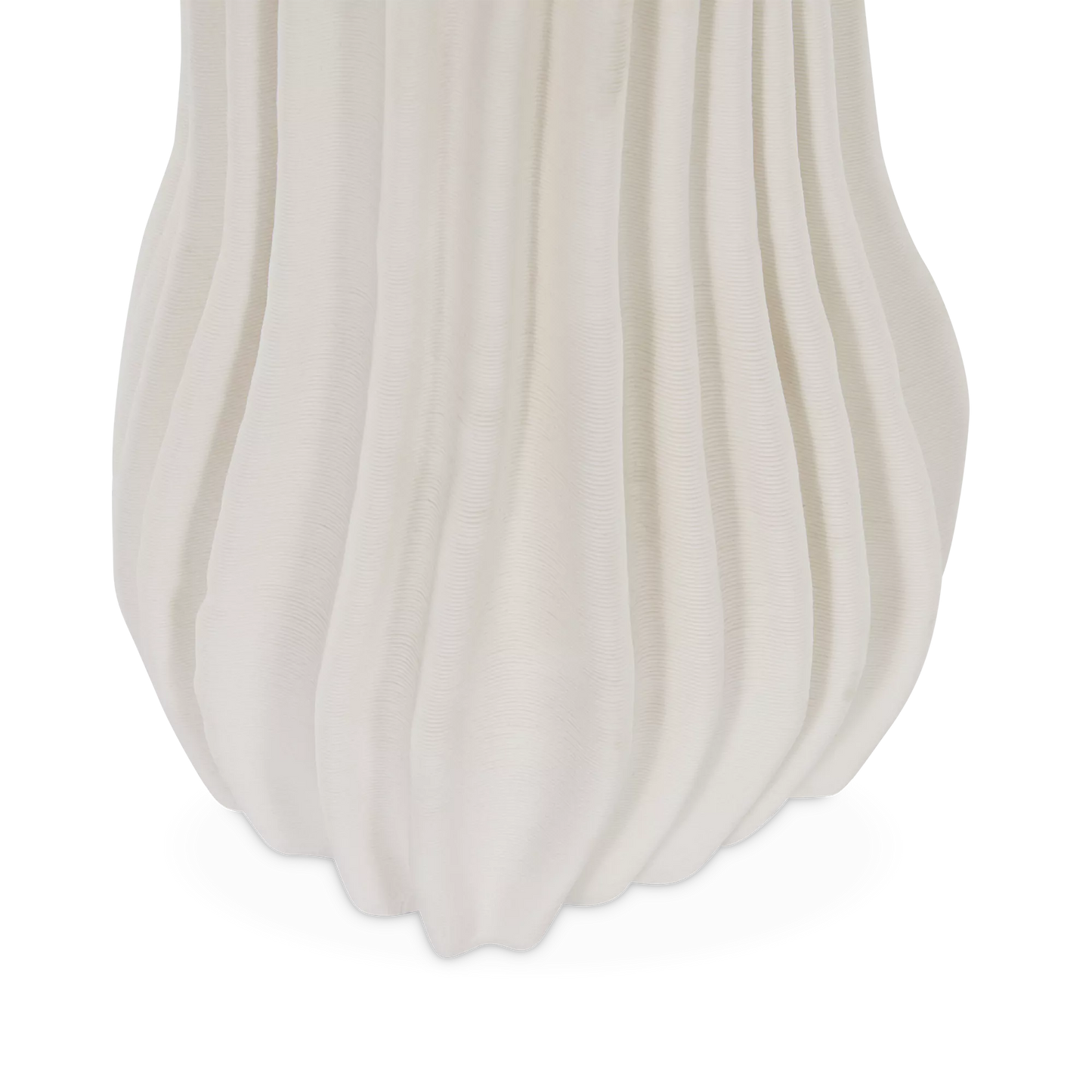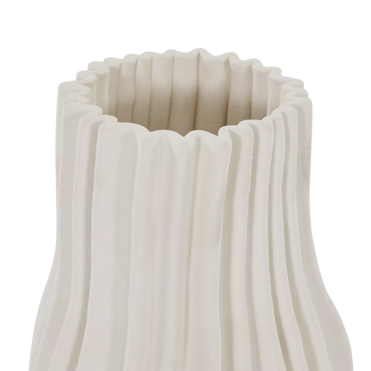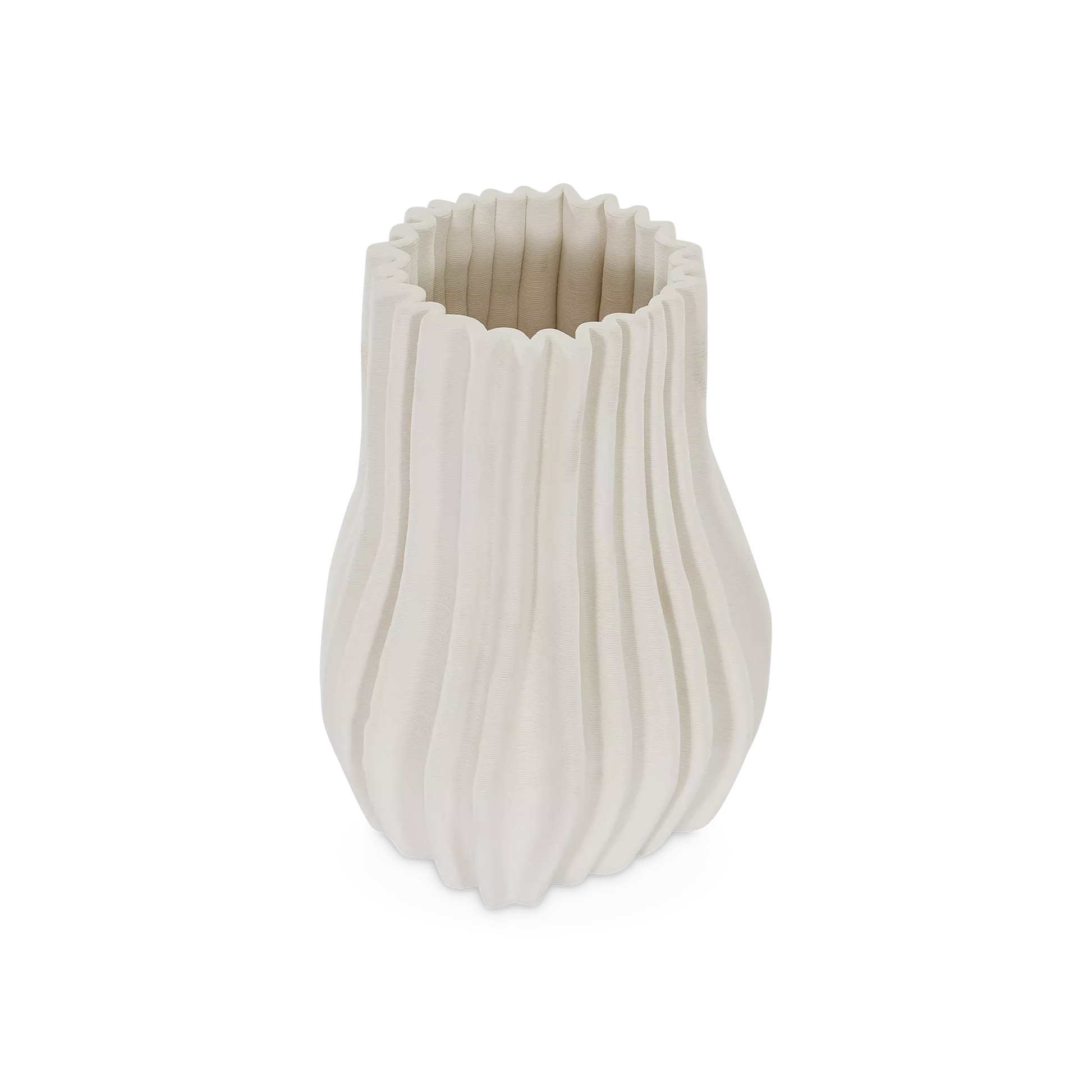 The Antolia vase showcases the sculptural possibilities of 3D printing with its pleated, organic form and matte ivory finish. Available in both a small and large size, it can stand beautifully on its own or styled together as a striking pair to add texture and dimension to any surface.