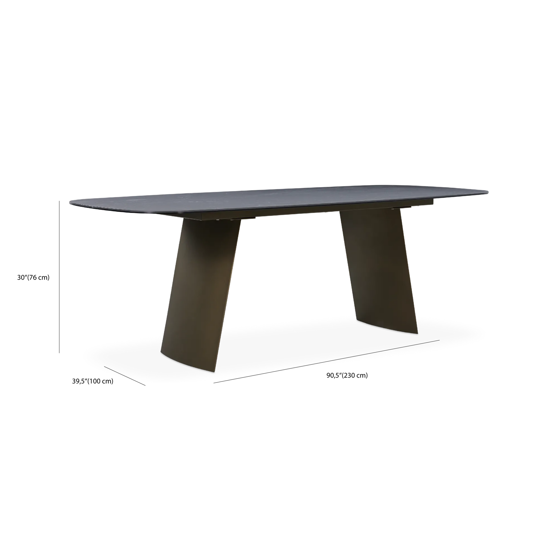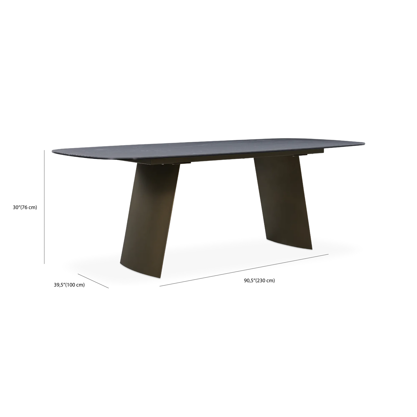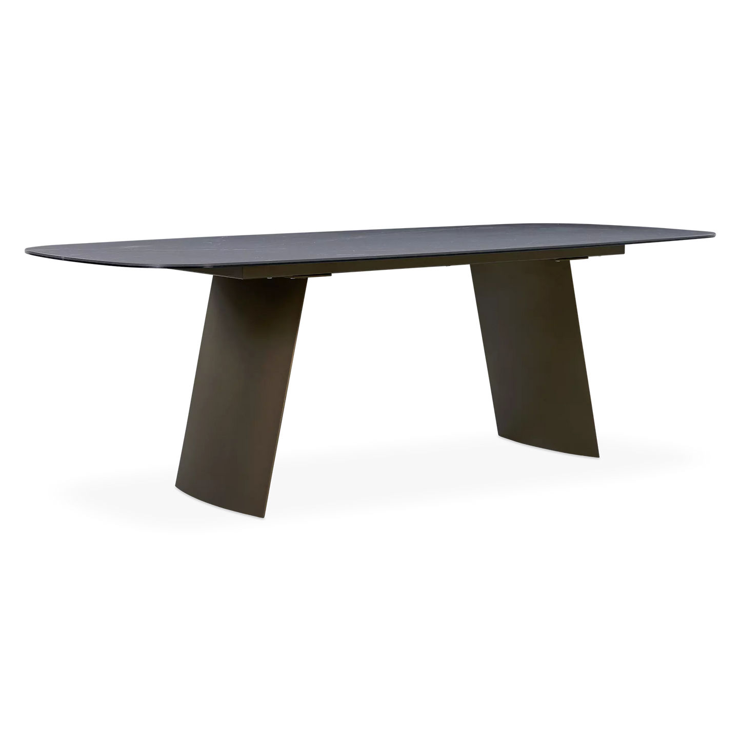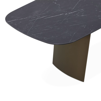 Discover the avant-garde design of the Arrow table. Its ceramic top, resistant to impact, heat and scratches, sits on a metal base with two solid, subtle curved legs. Its barrel shape, like a rectangular with curved edges, renders it an elegant addition that will energize any minimalist-style space.