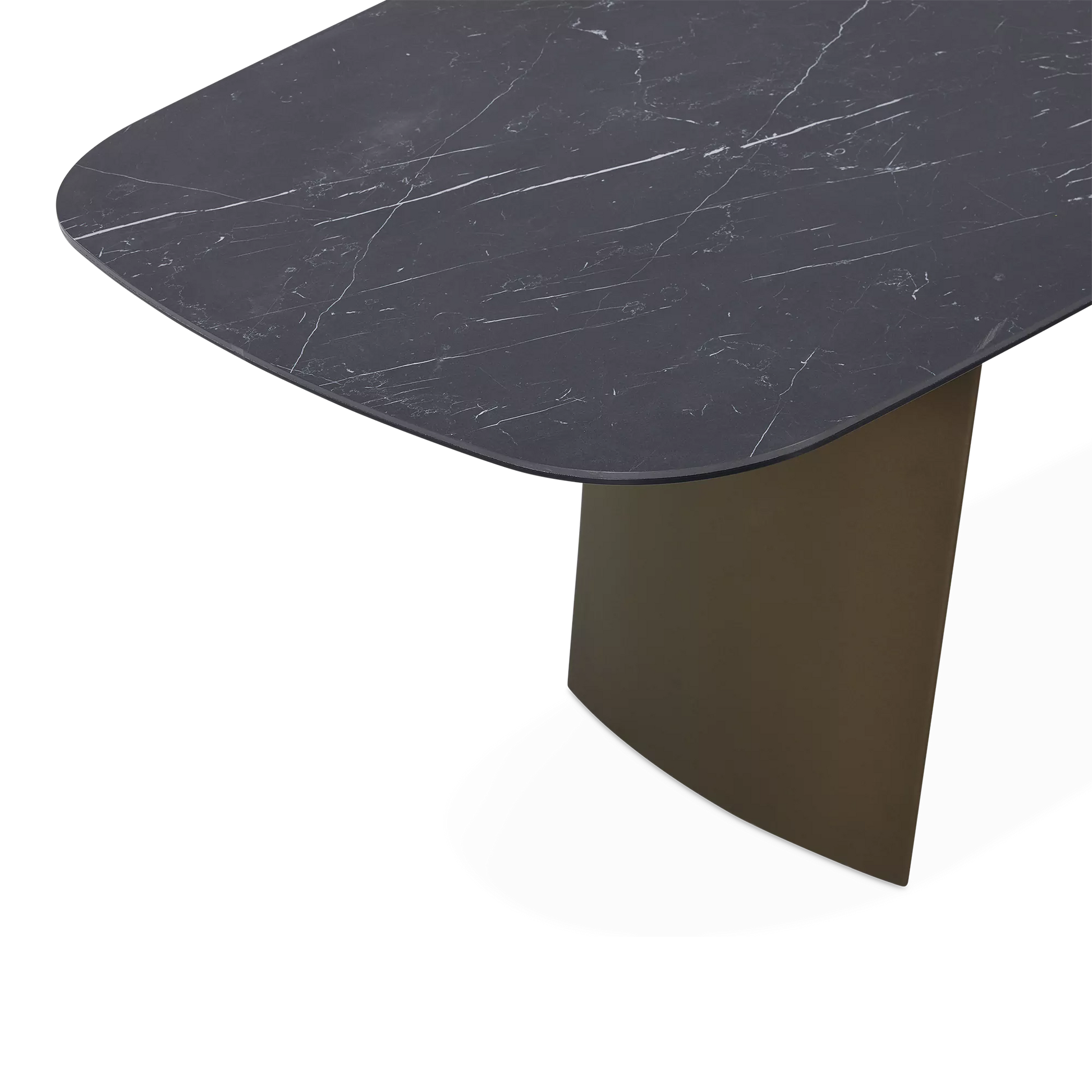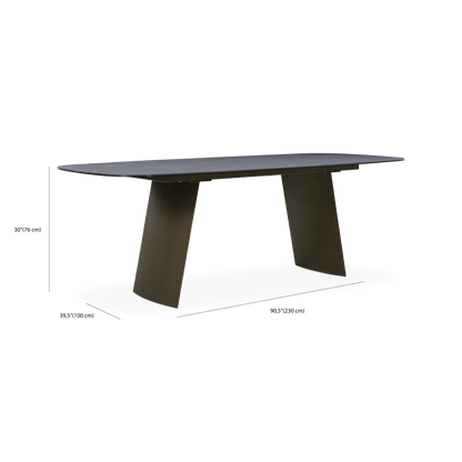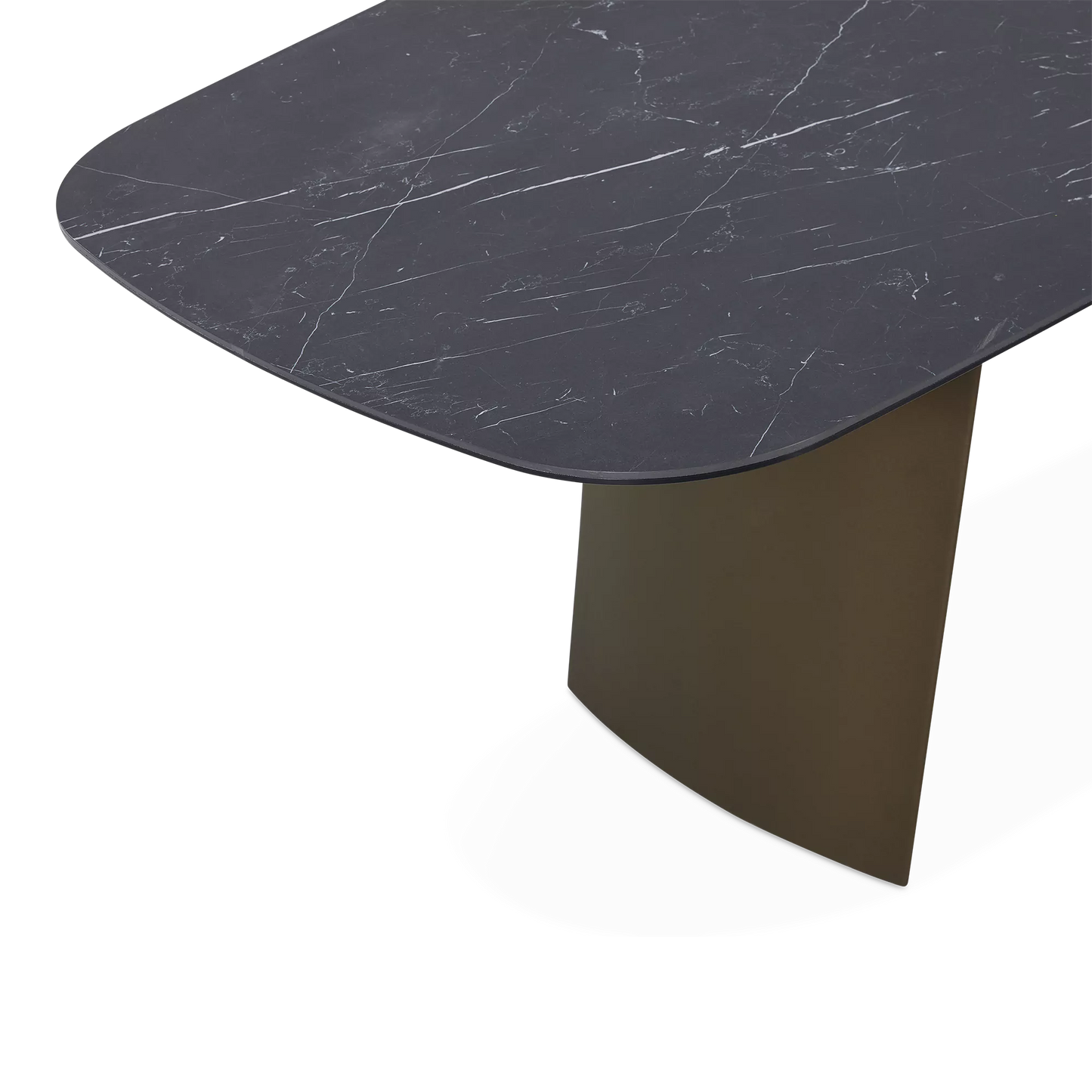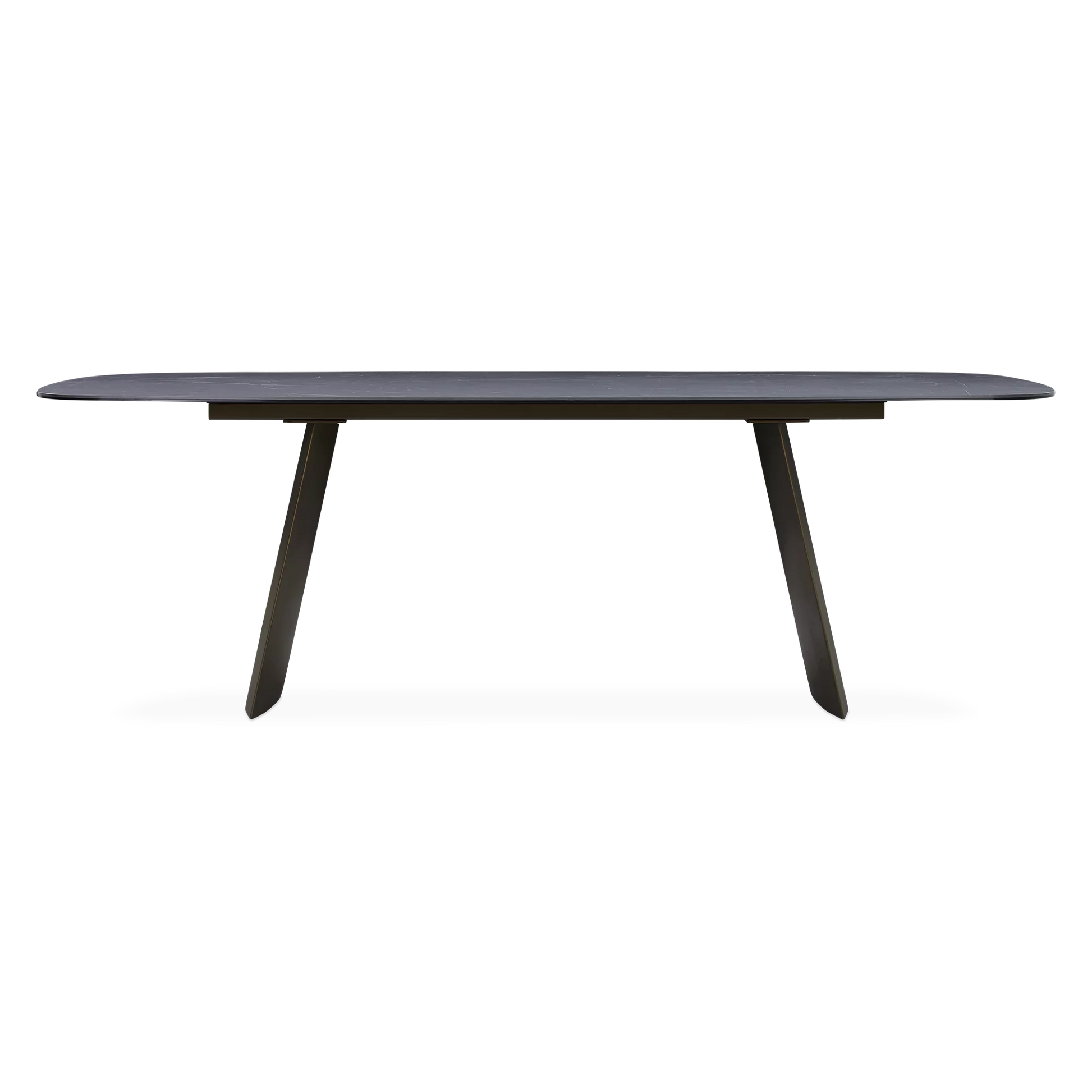 Discover the avant-garde design of the Arrow table. Its ceramic top, resistant to impact, heat and scratches, sits on a metal base with two solid, subtle curved legs. Its barrel shape, like a rectangular with curved edges, renders it an elegant addition that will energize any minimalist-style space.