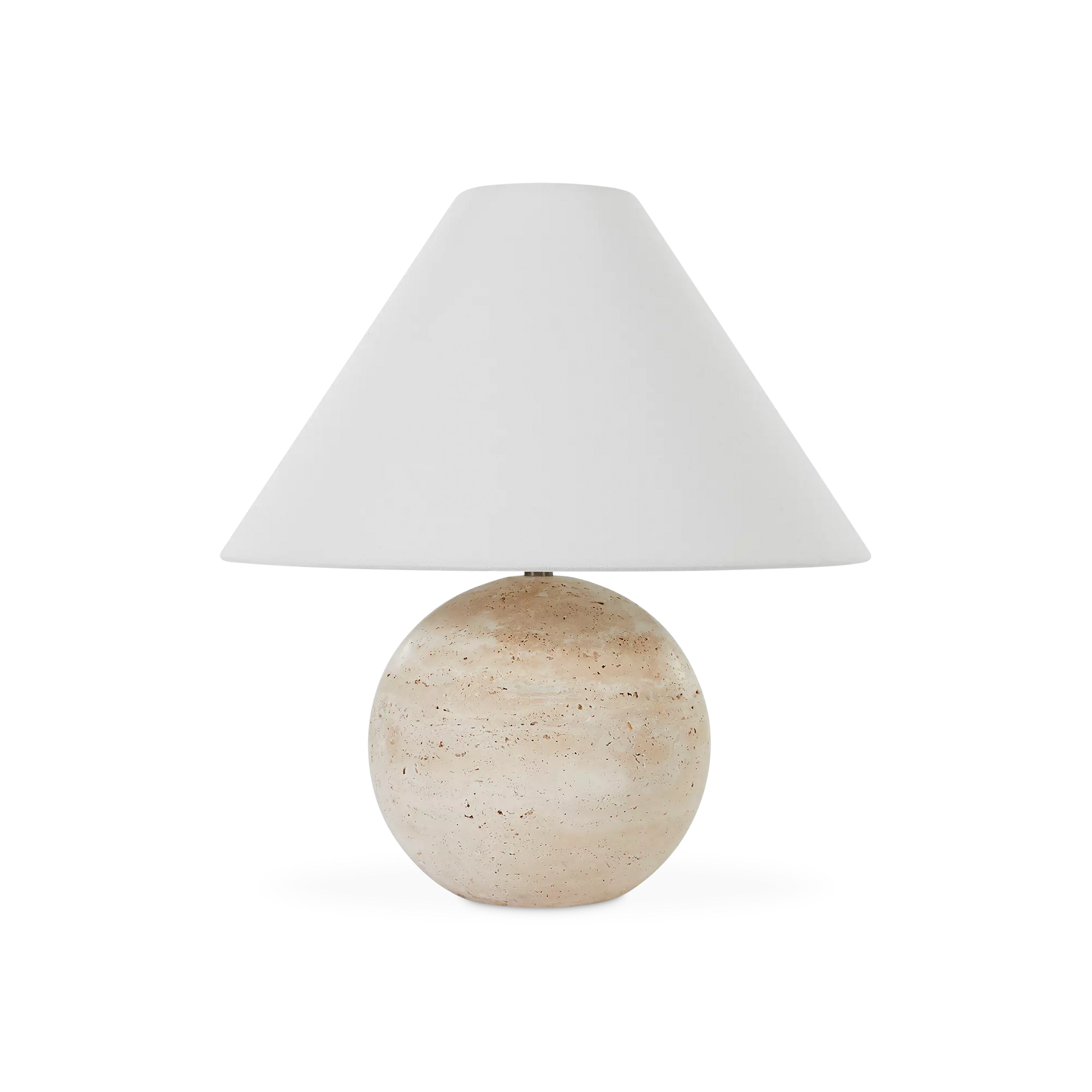 The Assen lamp entices with its polished travertine base and conical lampshade in cream-toned linen. Equipped with a dimmer and timeless design, it diffuses a soft light to enhance the atmosphere of any bedroom or living space. A chic choice that can be styled alone or in a pair to elevate a contemporary or classic interior.