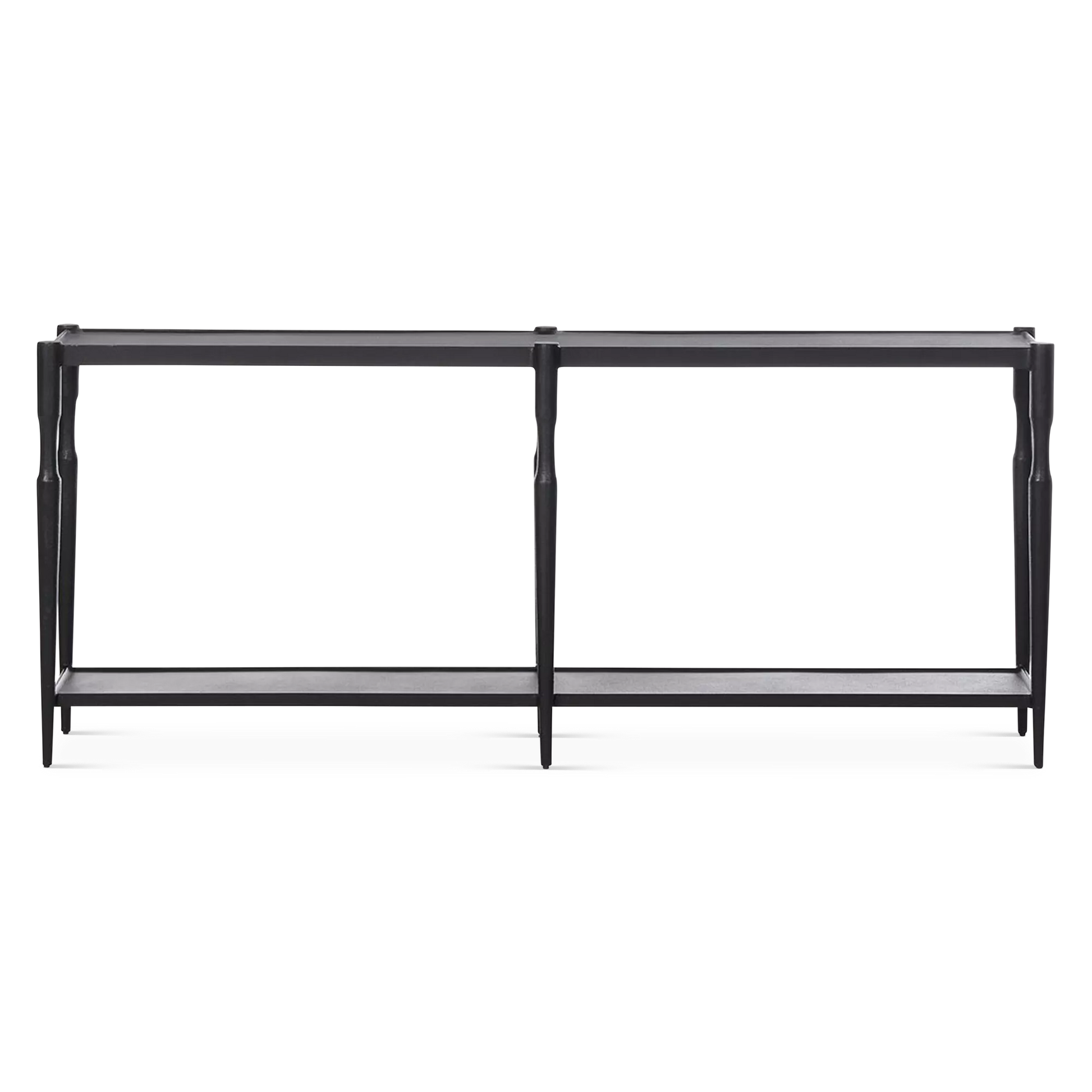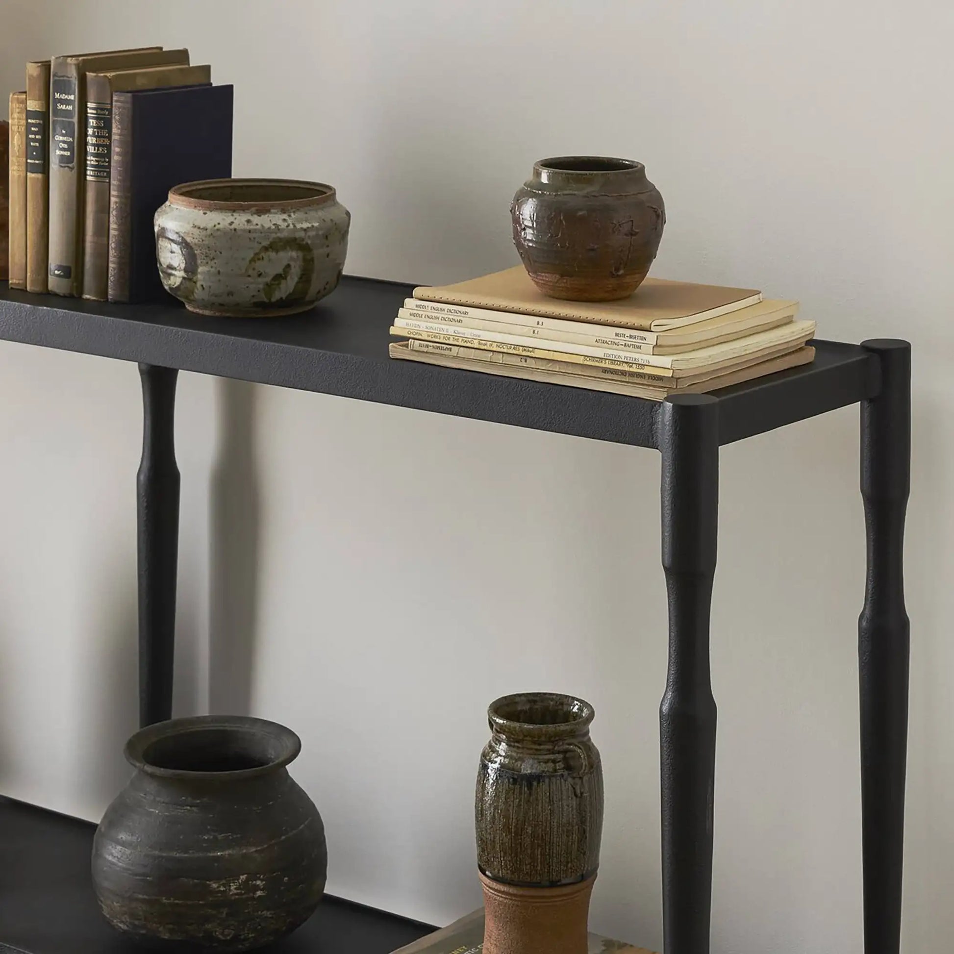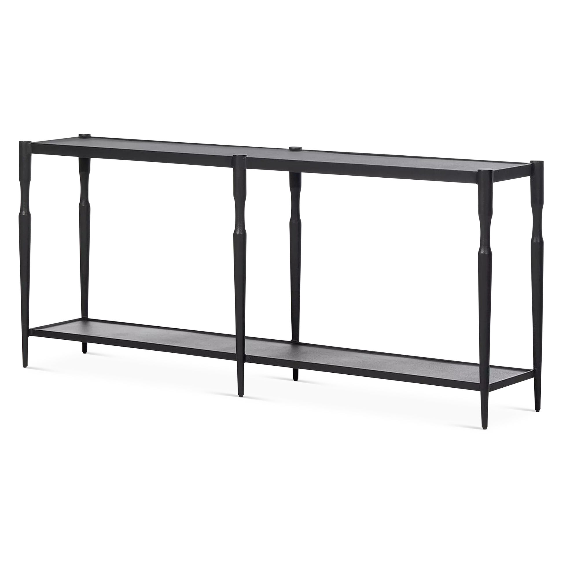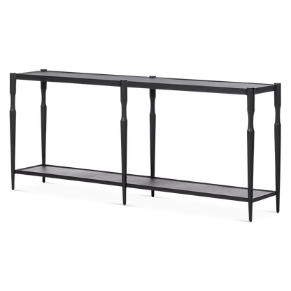 The Augusta console table brings sculptural simplicity to everyday function. Textured cast iron legs, subtly turned for a refined silhouette, support a slim, tray-style top that keeps items neatly contained. A lower open shelf adds extra space for storage or display, making the piece as useful as it is sleek. Finished in a classic black that complements any interior, this console table blends effortlessly into modern, traditional and collected spaces alike. A design collaboration by Amber Lewis and Four Hands