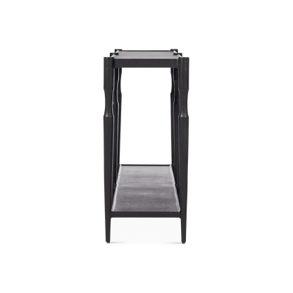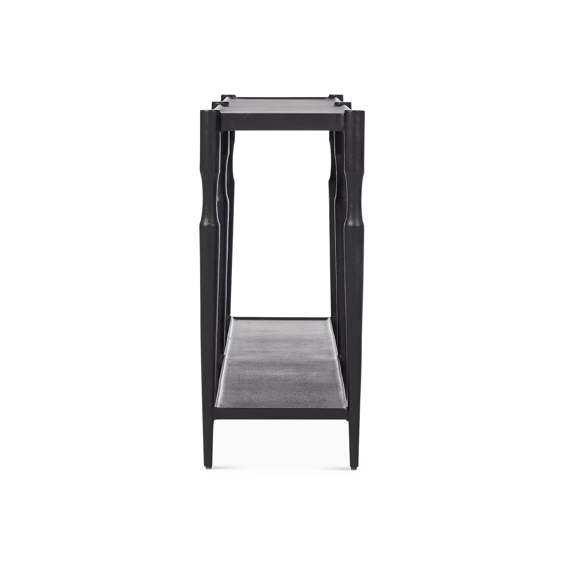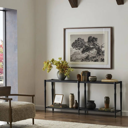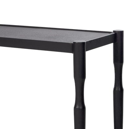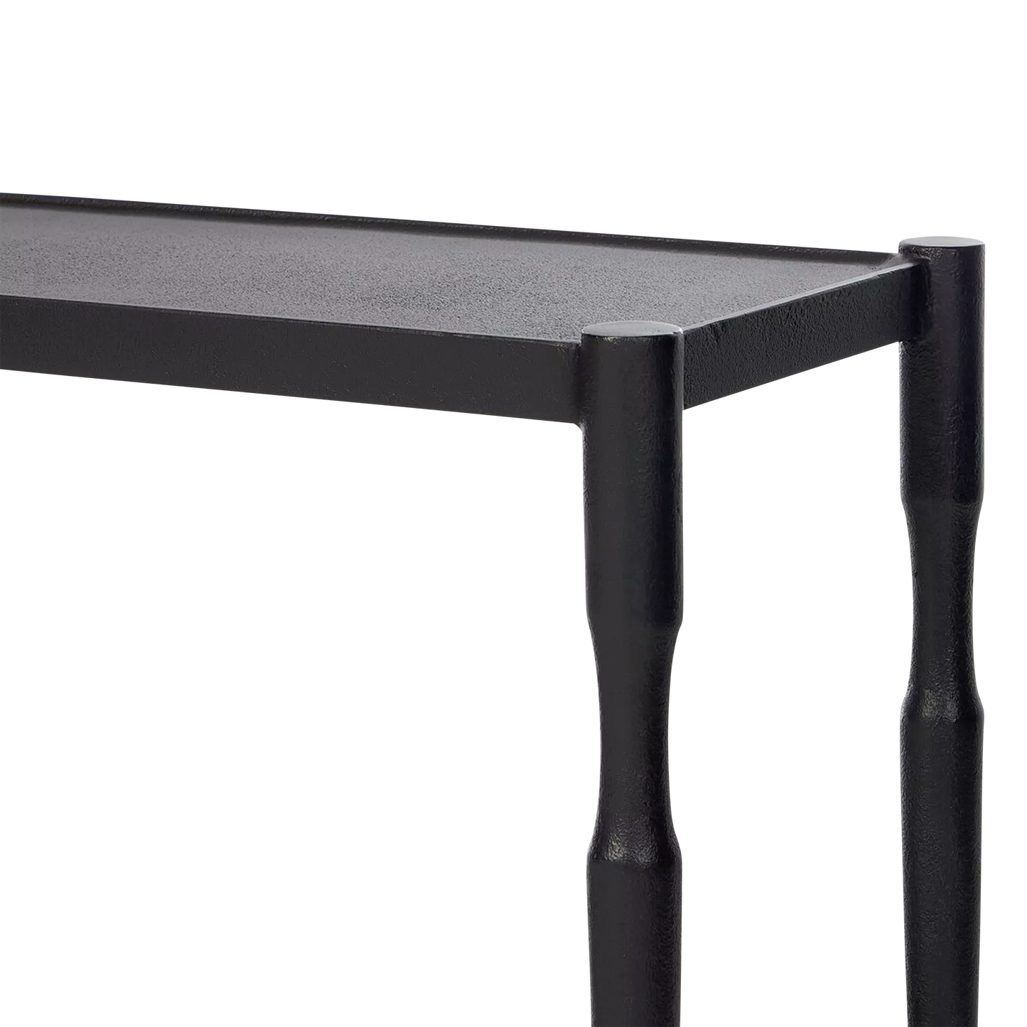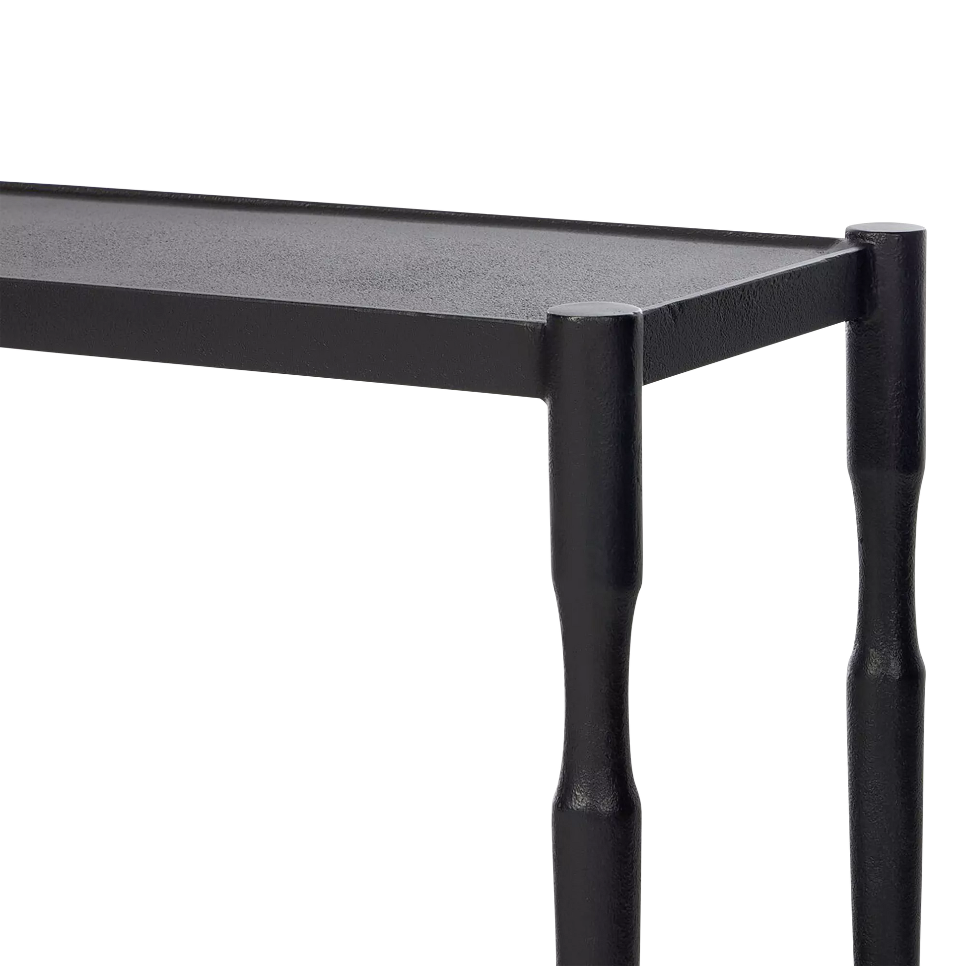 The Augusta console table brings sculptural simplicity to everyday function. Textured cast iron legs, subtly turned for a refined silhouette, support a slim, tray-style top that keeps items neatly contained. A lower open shelf adds extra space for storage or display, making the piece as useful as it is sleek. Finished in a classic black that complements any interior, this console table blends effortlessly into modern, traditional and collected spaces alike. A design collaboration by Amber Lewis and Four Hands