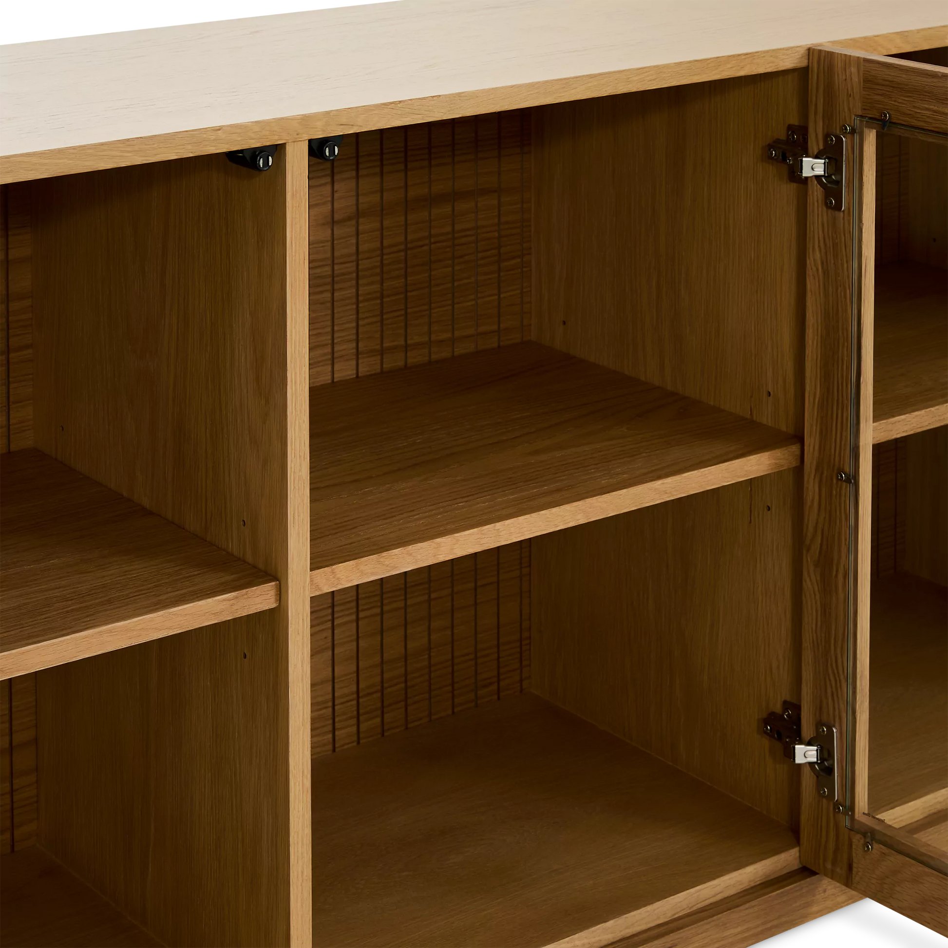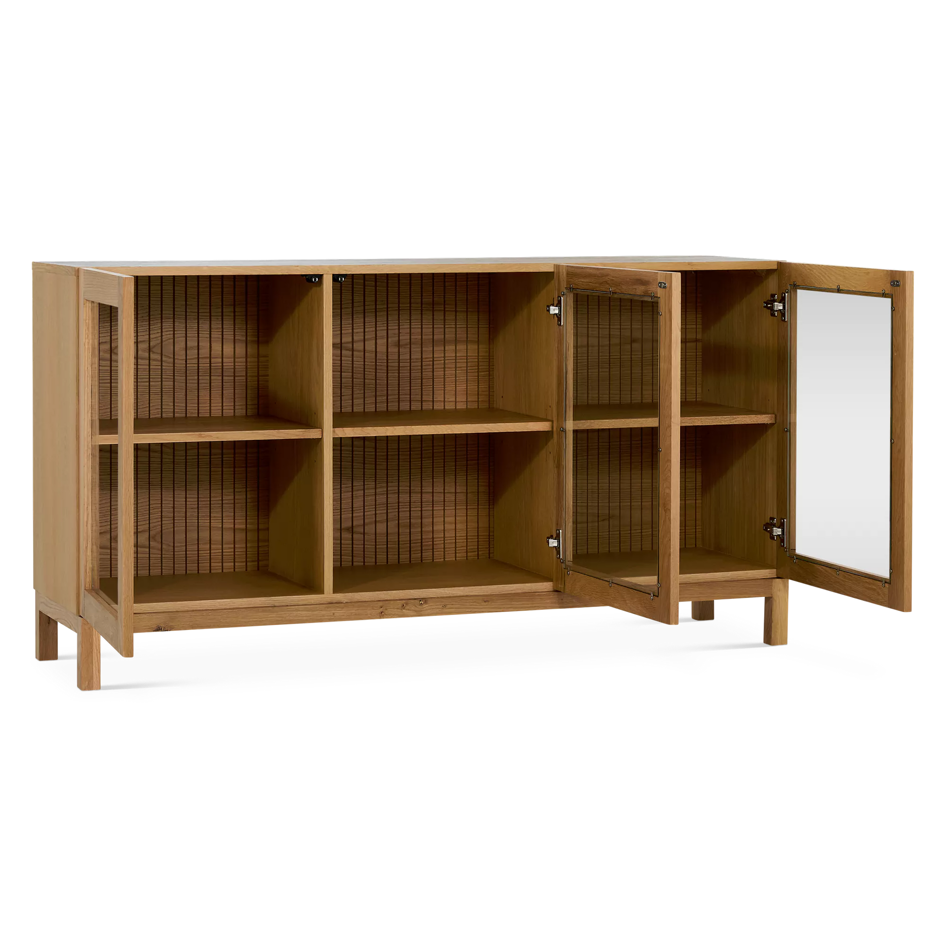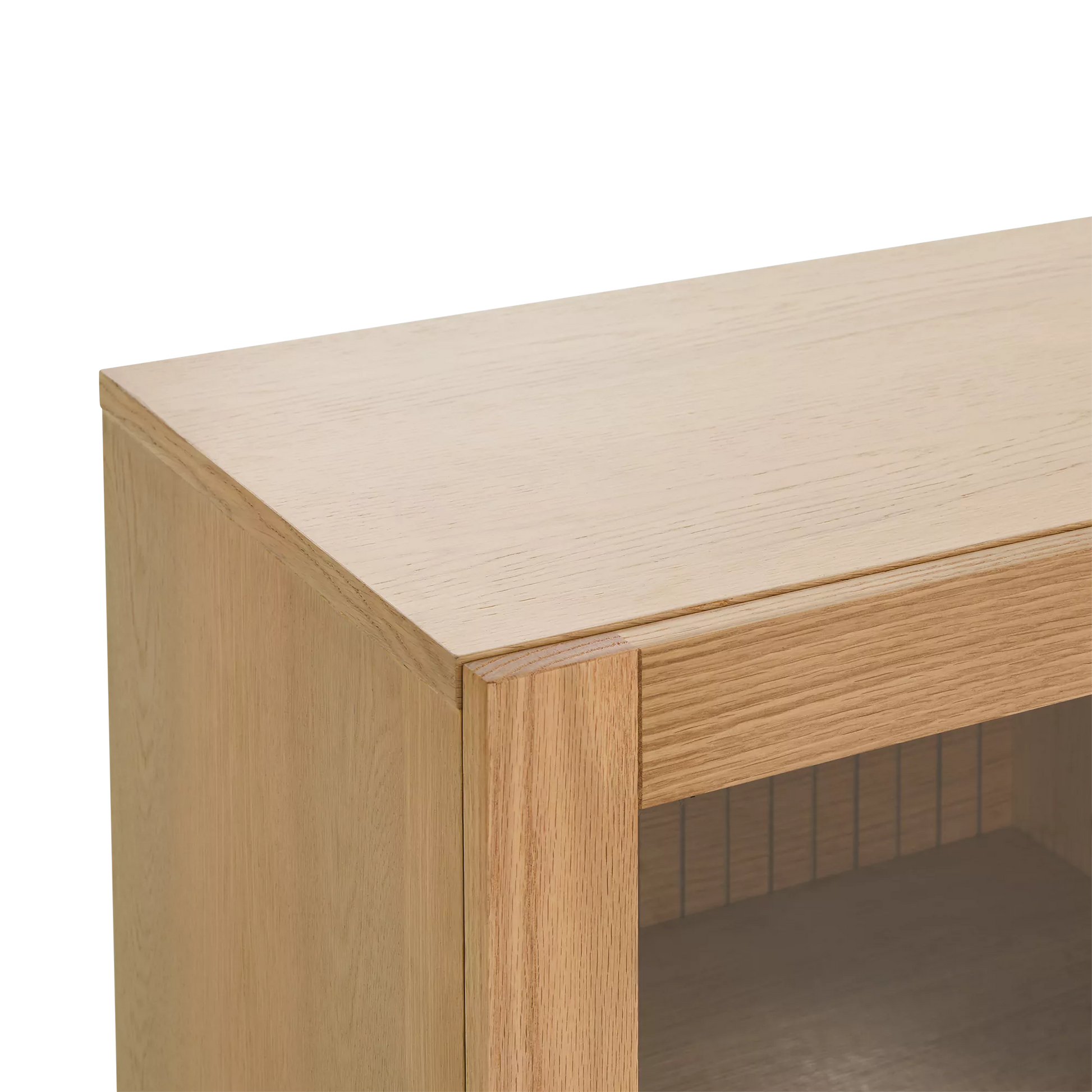 The Bernard sideboard keeps things simple with its clean lines and streamlined silhouette. Its natural oak veneer brings warmth to any space, while its glass doors offer a peek at your dinnerware or favourite decorative accessories. Timeless, practical and effortlessly elegant, it’s a versatile piece that fits into any dining room with ease.