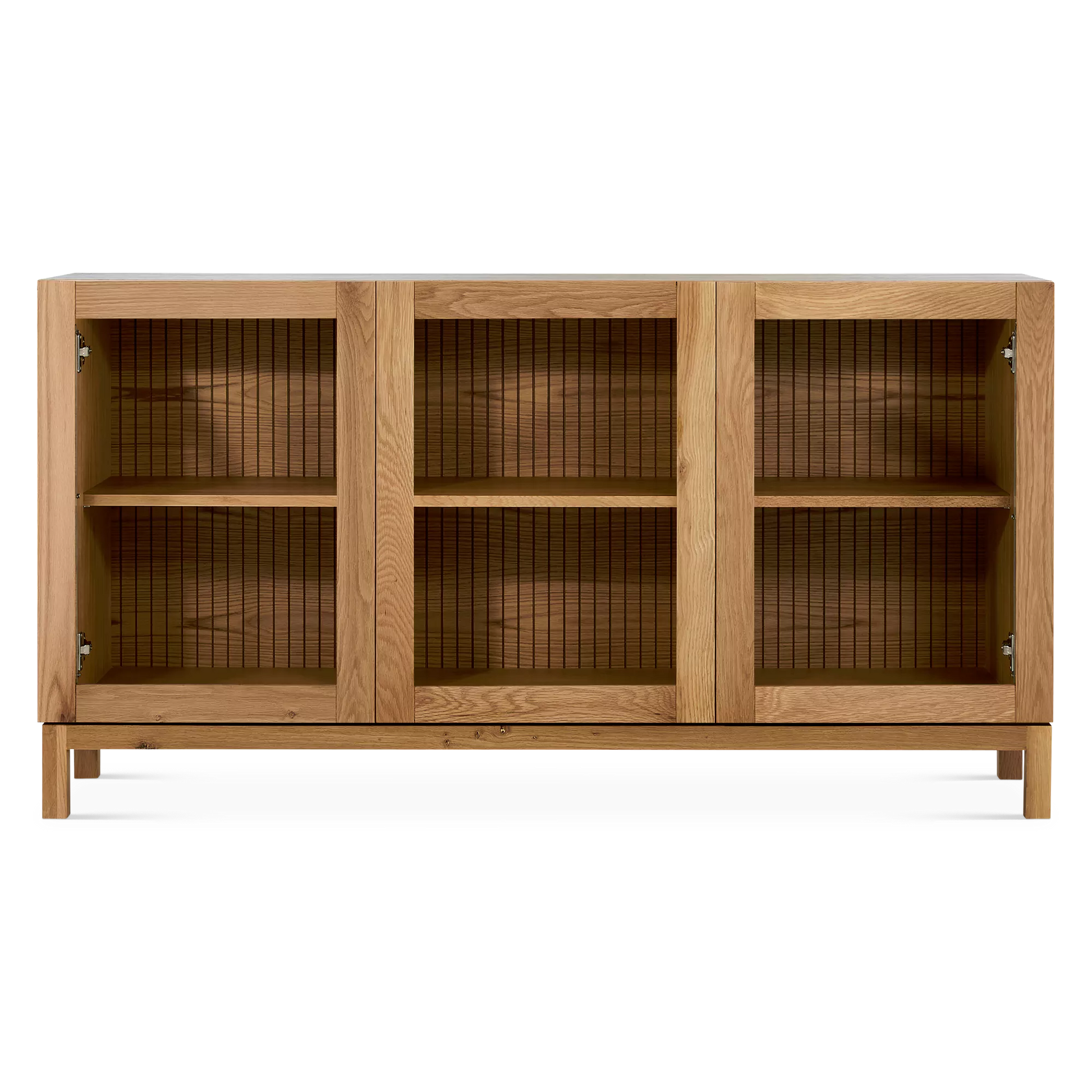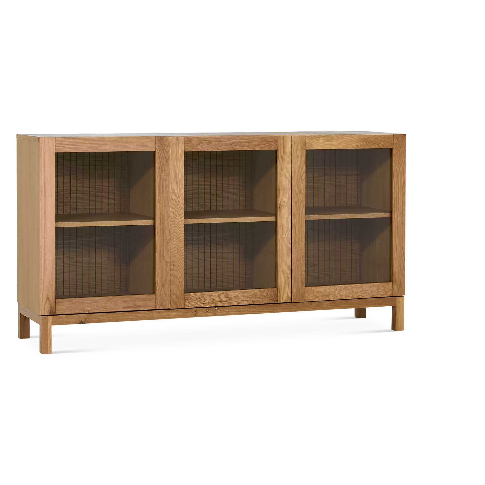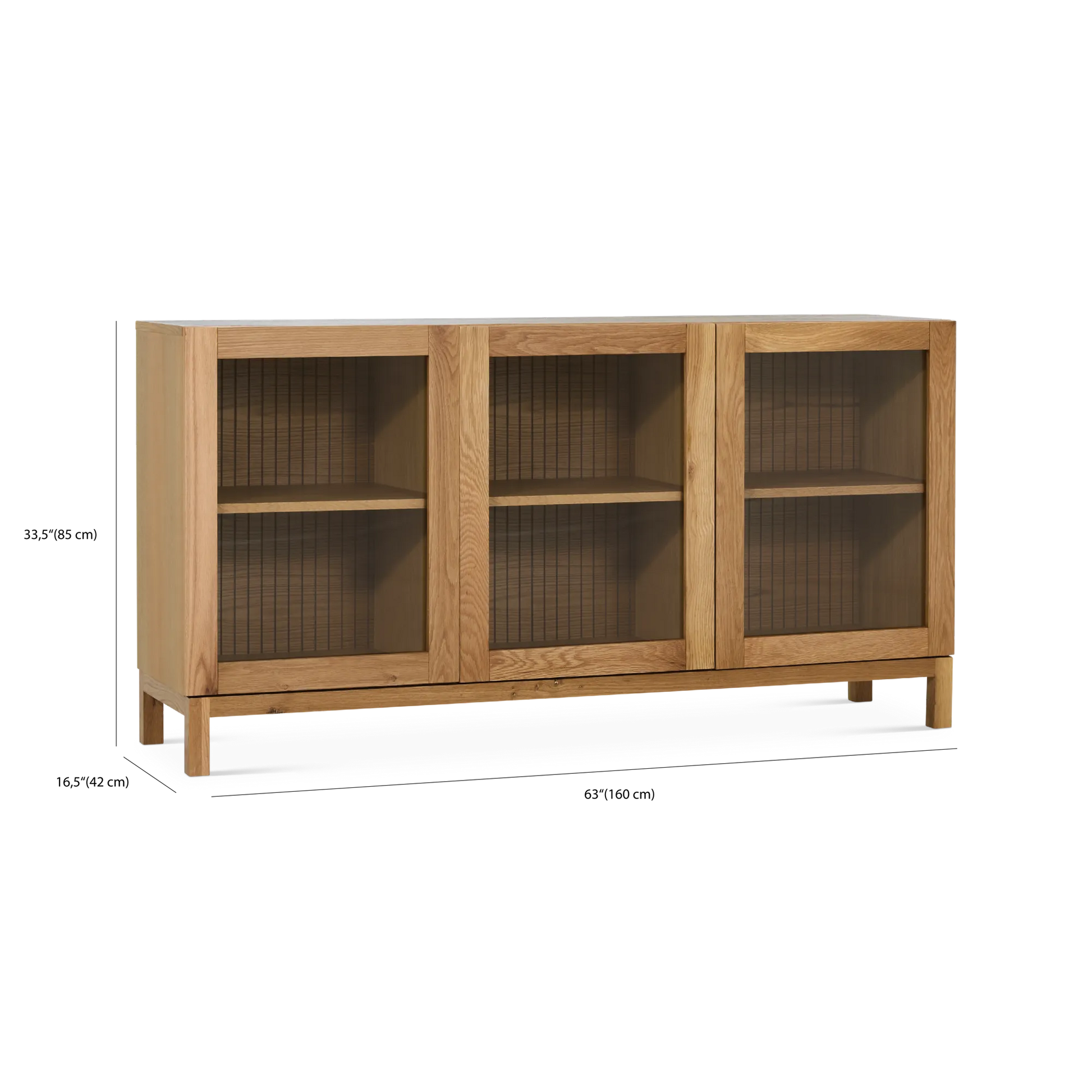 The Bernard sideboard keeps things simple with its clean lines and streamlined silhouette. Its natural oak veneer brings warmth to any space, while its glass doors offer a peek at your dinnerware or favourite decorative accessories. Timeless, practical and effortlessly elegant, it’s a versatile piece that fits into any dining room with ease.