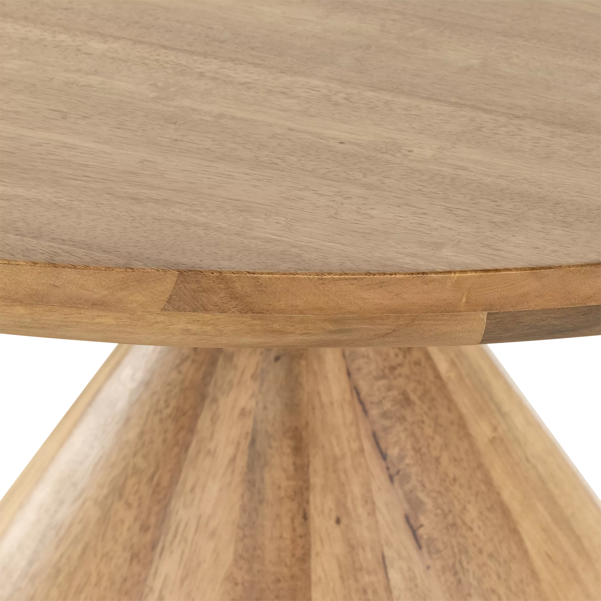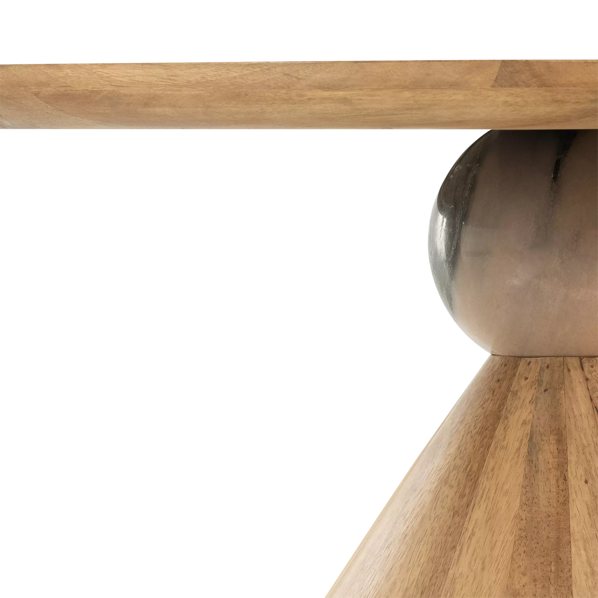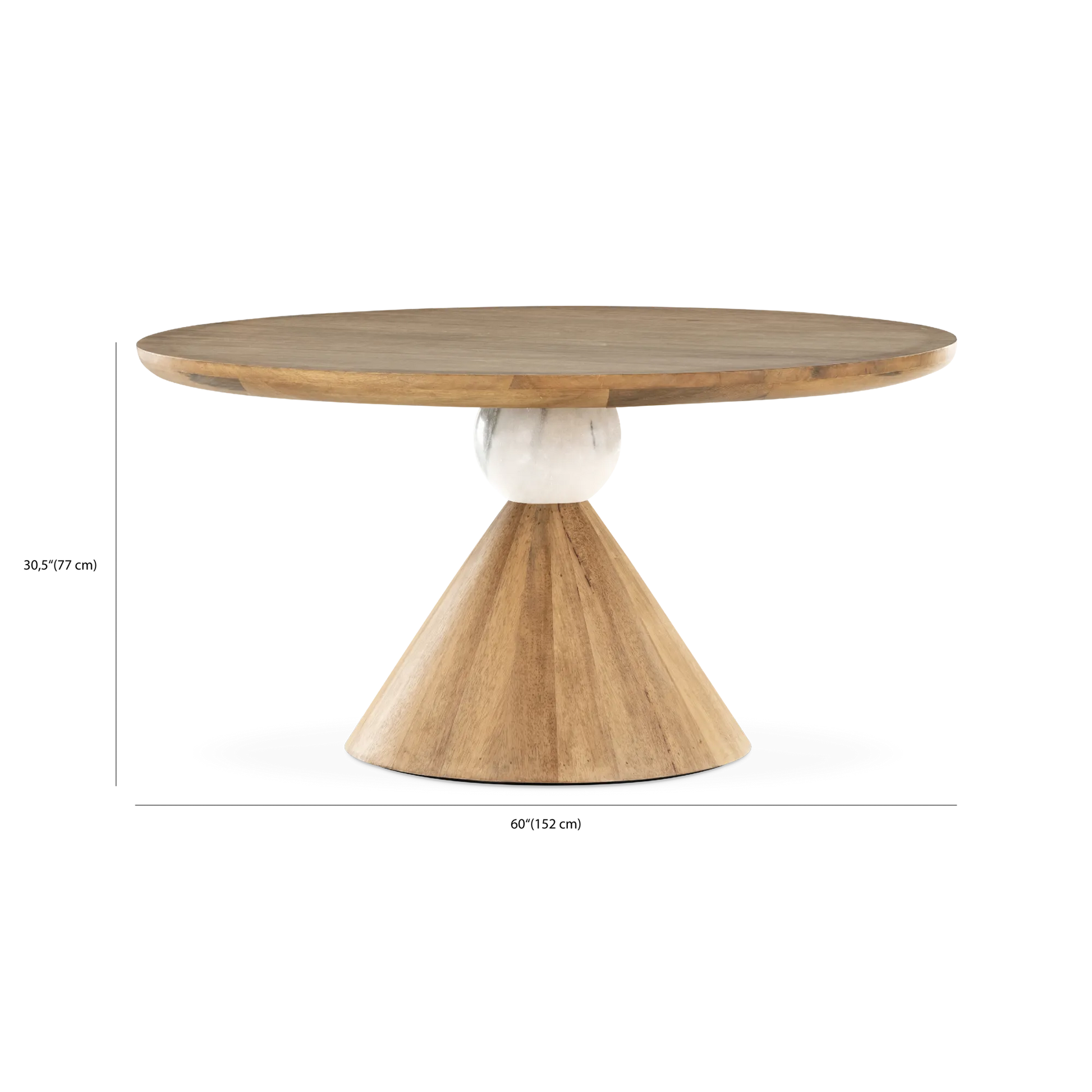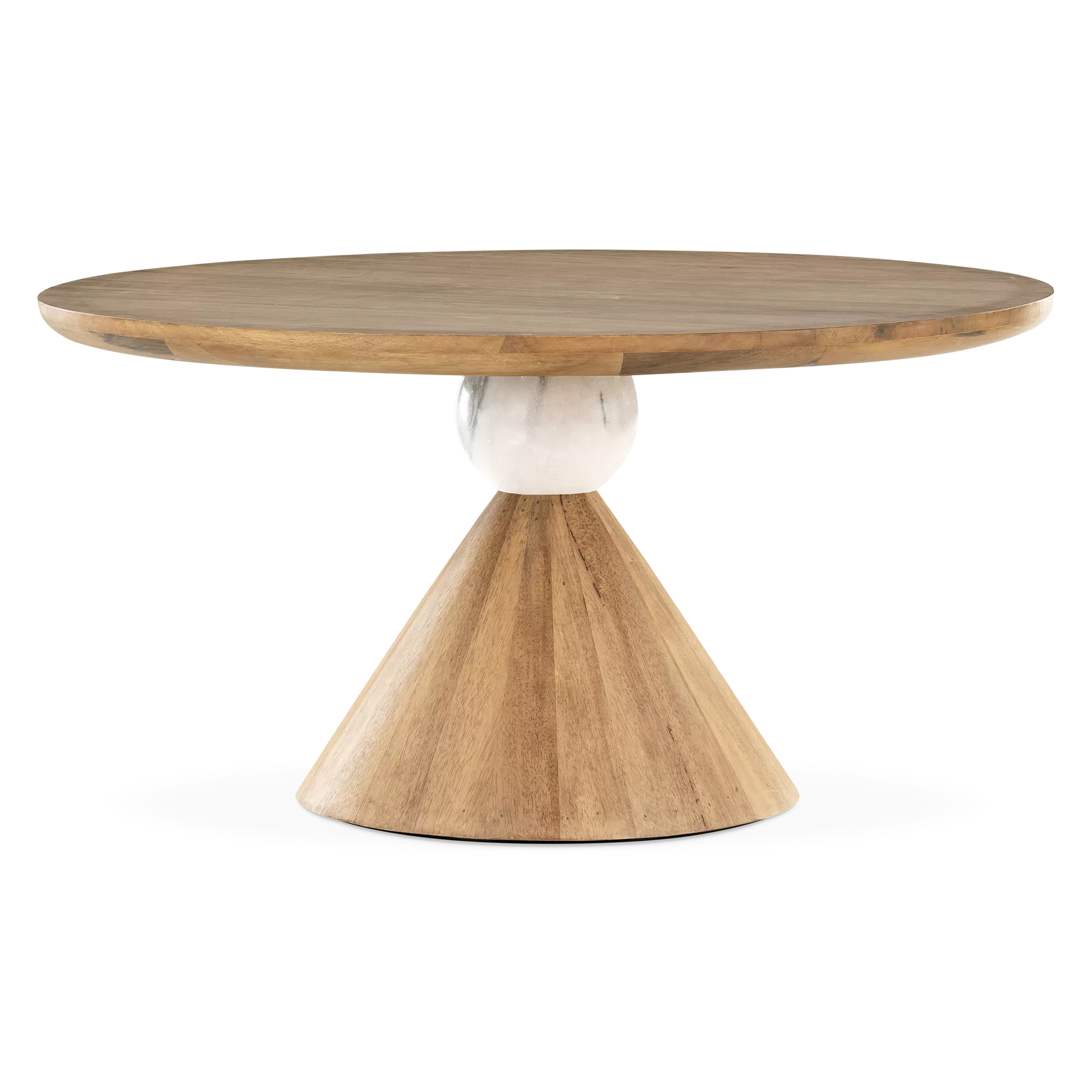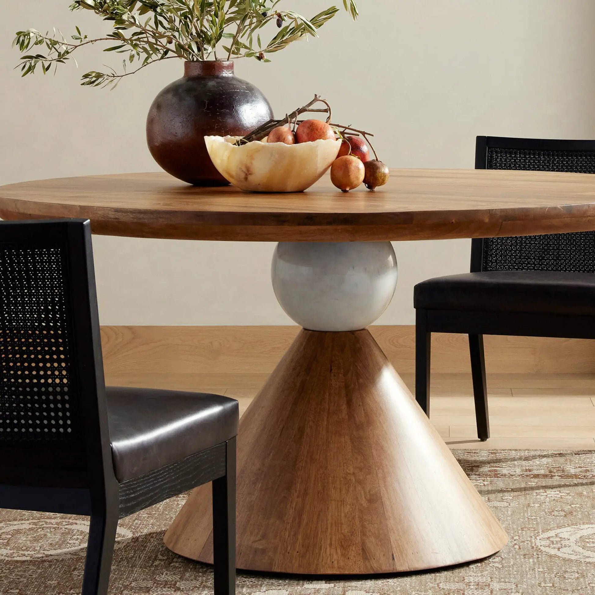 Inspired by Italian design, the Bibianna table features a conical, rubberwood base with a smoked honey finish and a round top separated by a marble sphere. It’s designed to accommodate up to six guests with ease, while adding sculptural elegance to any dining room.