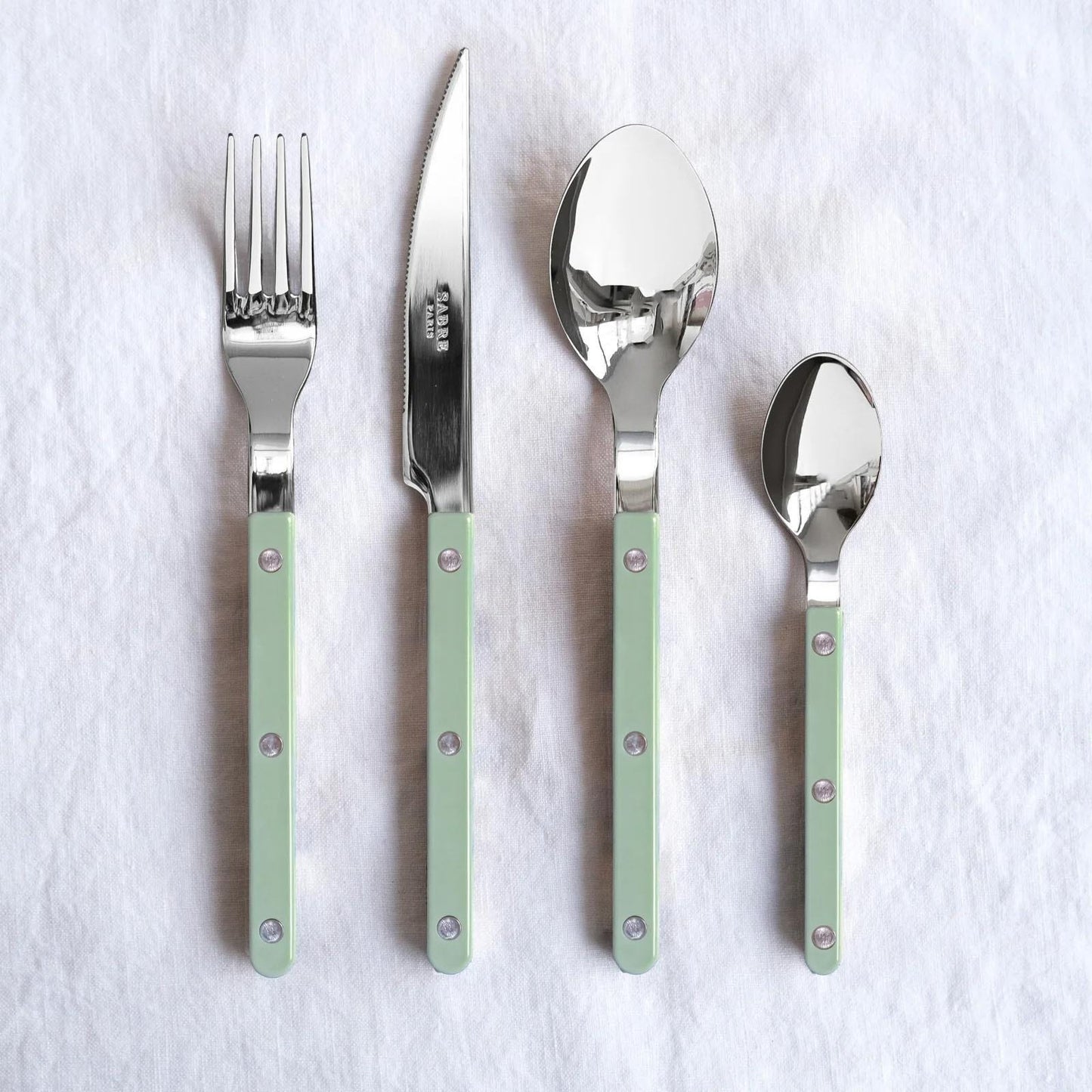 The Bistrot collection by Sabre Paris is inspired by the iconic social spaces of the French capital, such as terraces and cafés. Featuring a simple, modern design and signature rivets, these cutlery pieces come in a range of colors and finishes.