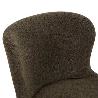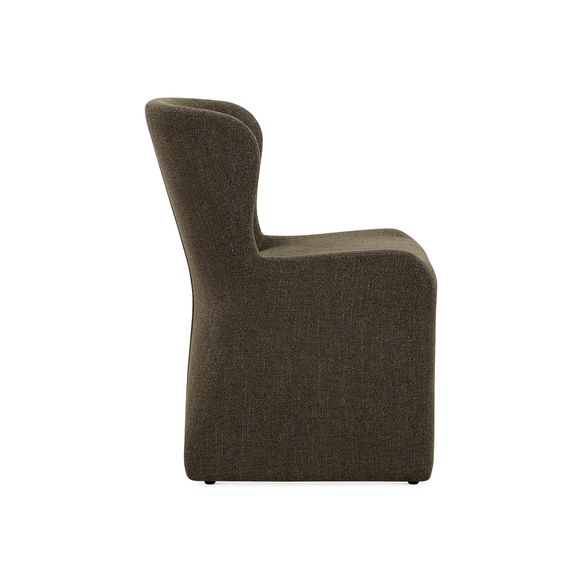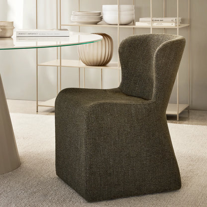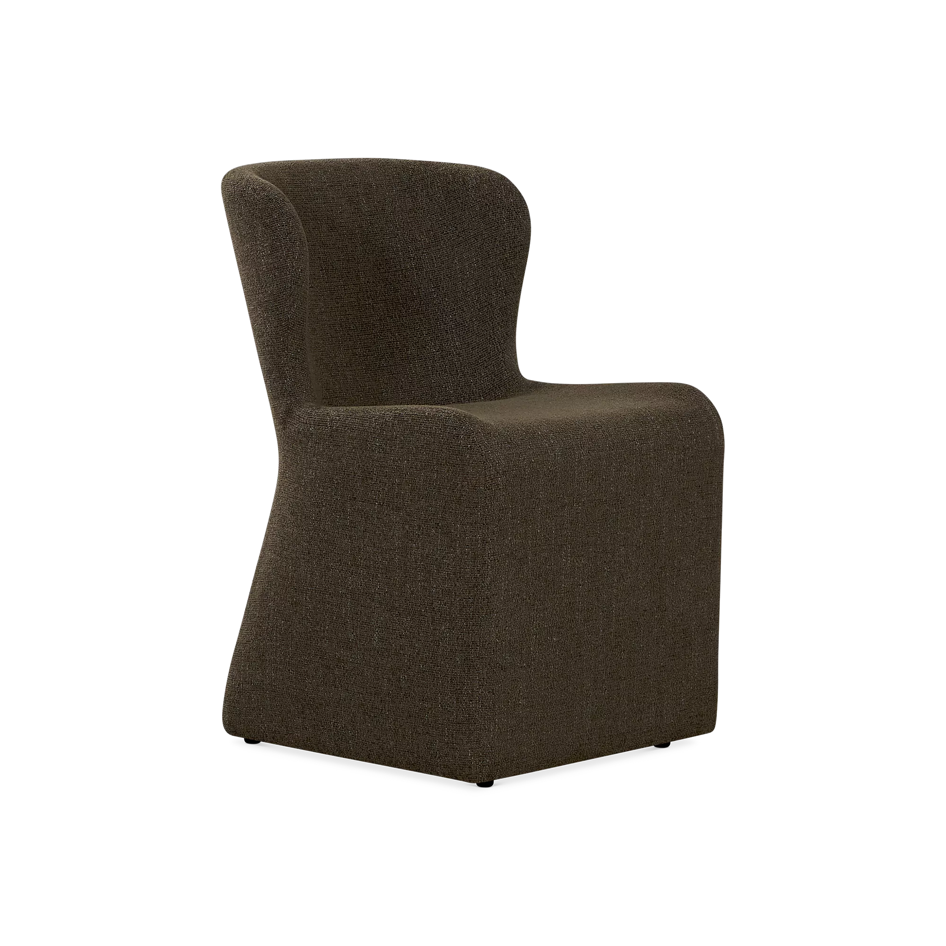 The Bound dining chair redefines modern seating with its bold, continuous silhouette. Wrapped in richly textured fabric, it balances sculptural curves with inviting comfort. A seamless, fully upholstered base grounds the design, while its curved backrest provides support for an artful yet functional complement to any dining room.