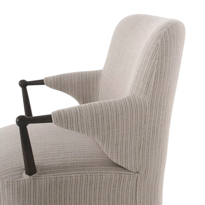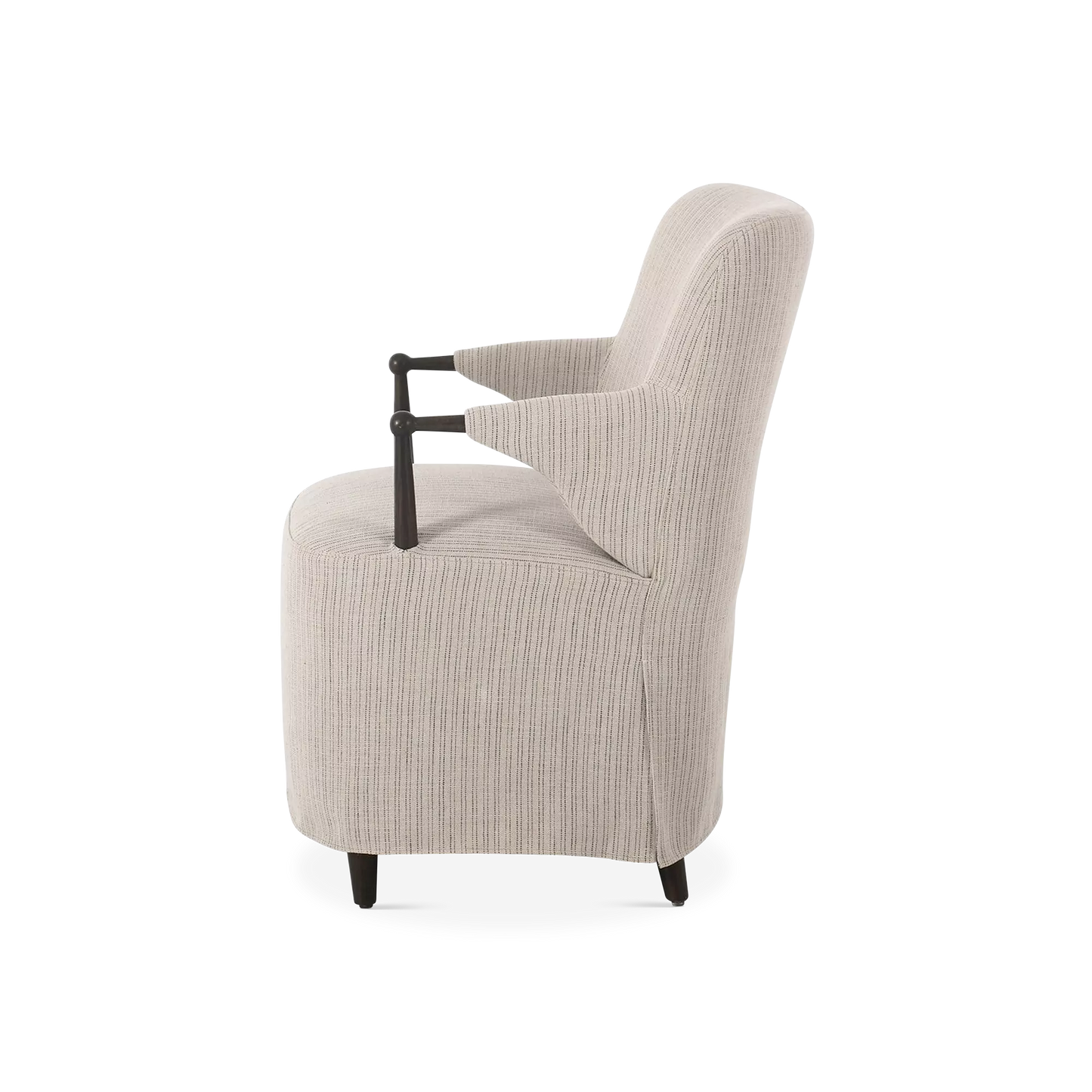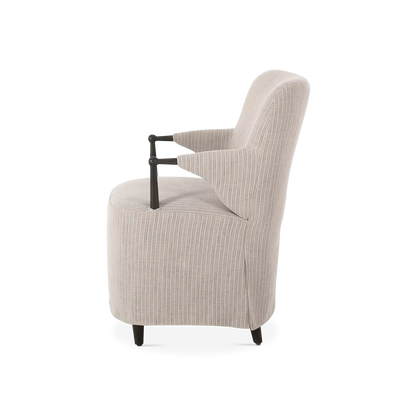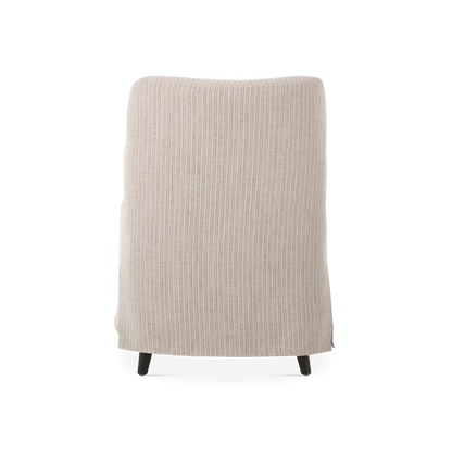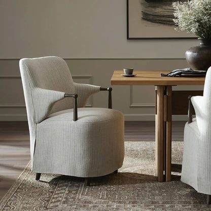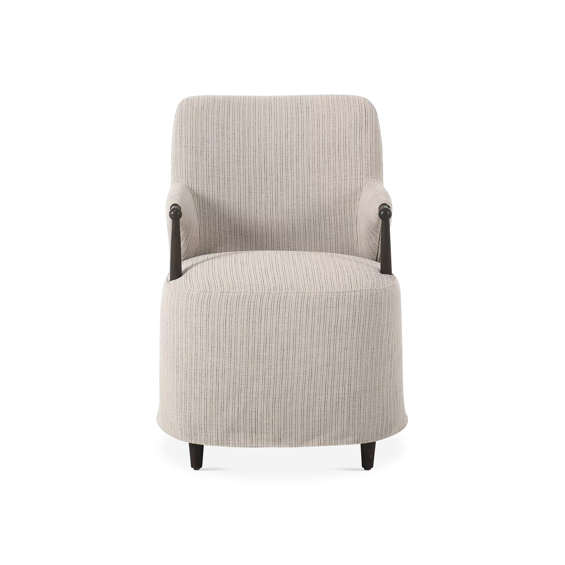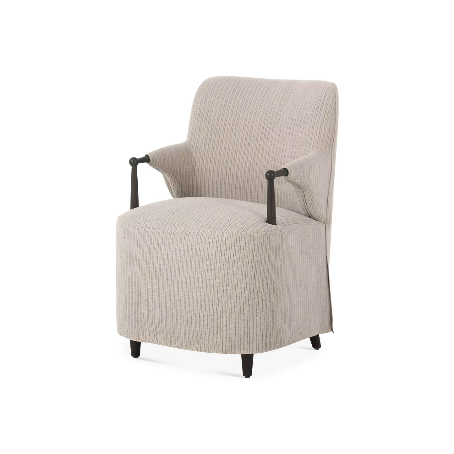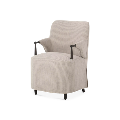 A classic dining silhouette elevated through thoughtful tailoring. The Brently chair pairs slim, sculpted oak arms with a fixed flax-linen blend slipcover in a soothing neutral tone. The slipcover extends into a soft, tailored skirt that brings ease and refinement to the form, while a supportive S-spring seat adds comfort for lingering at the table. A design collaboration by Amber Lewis and Four Hands.
