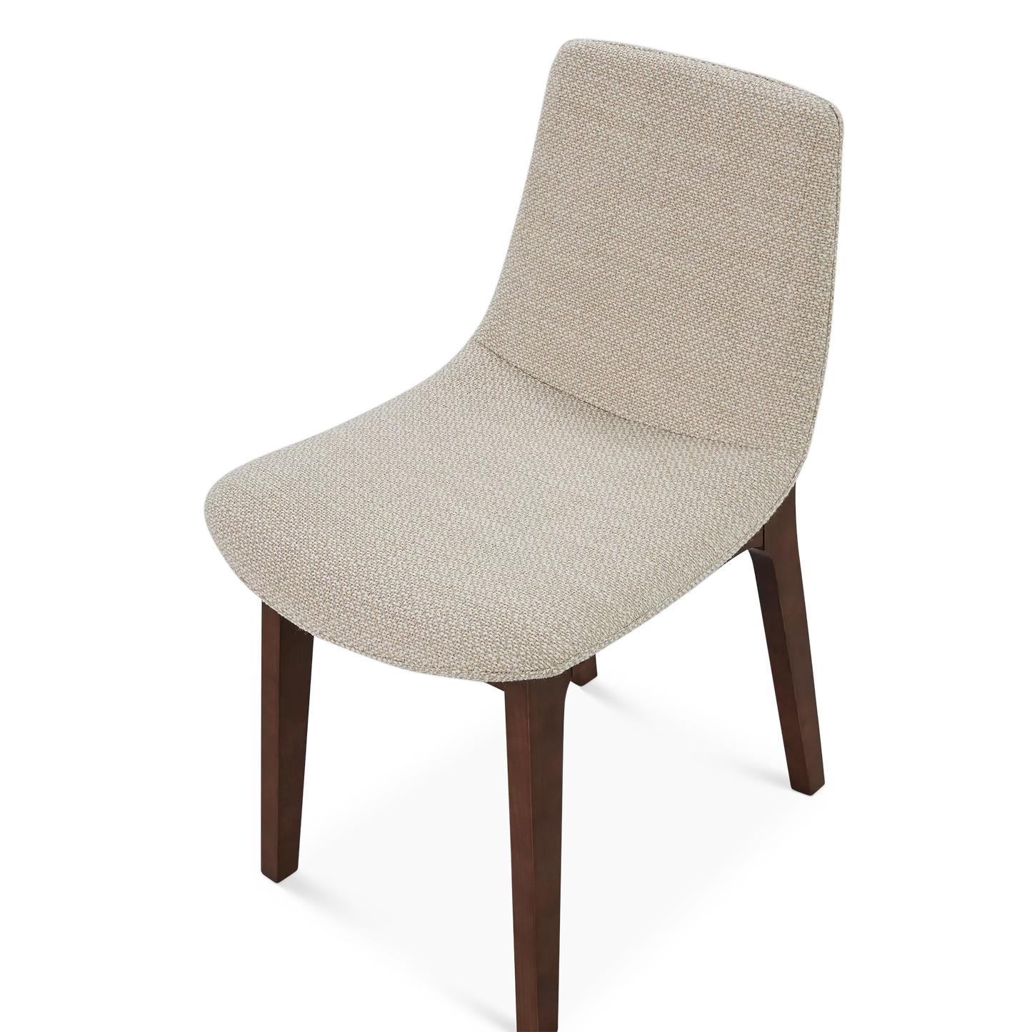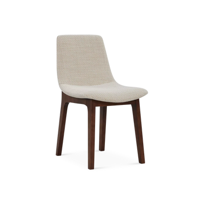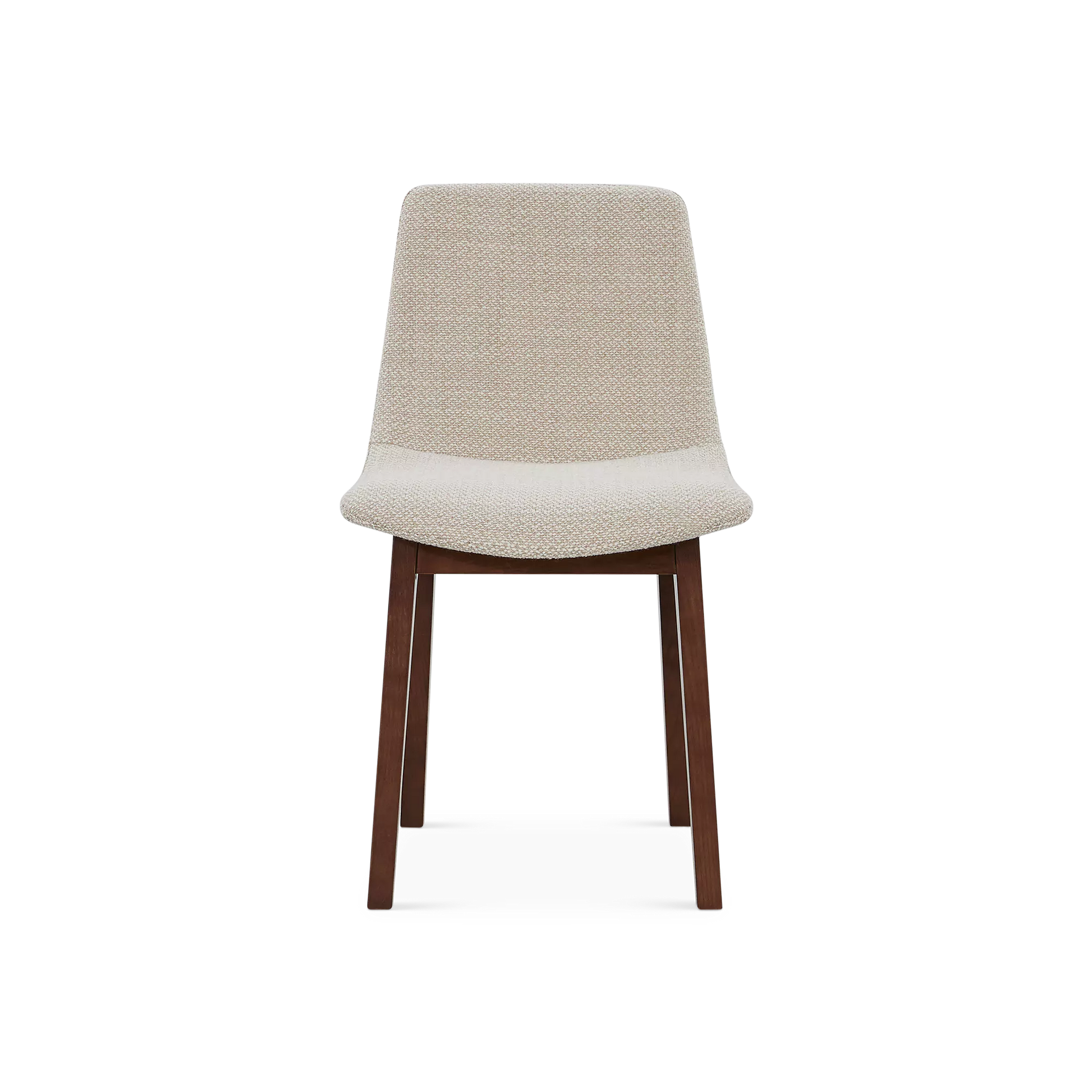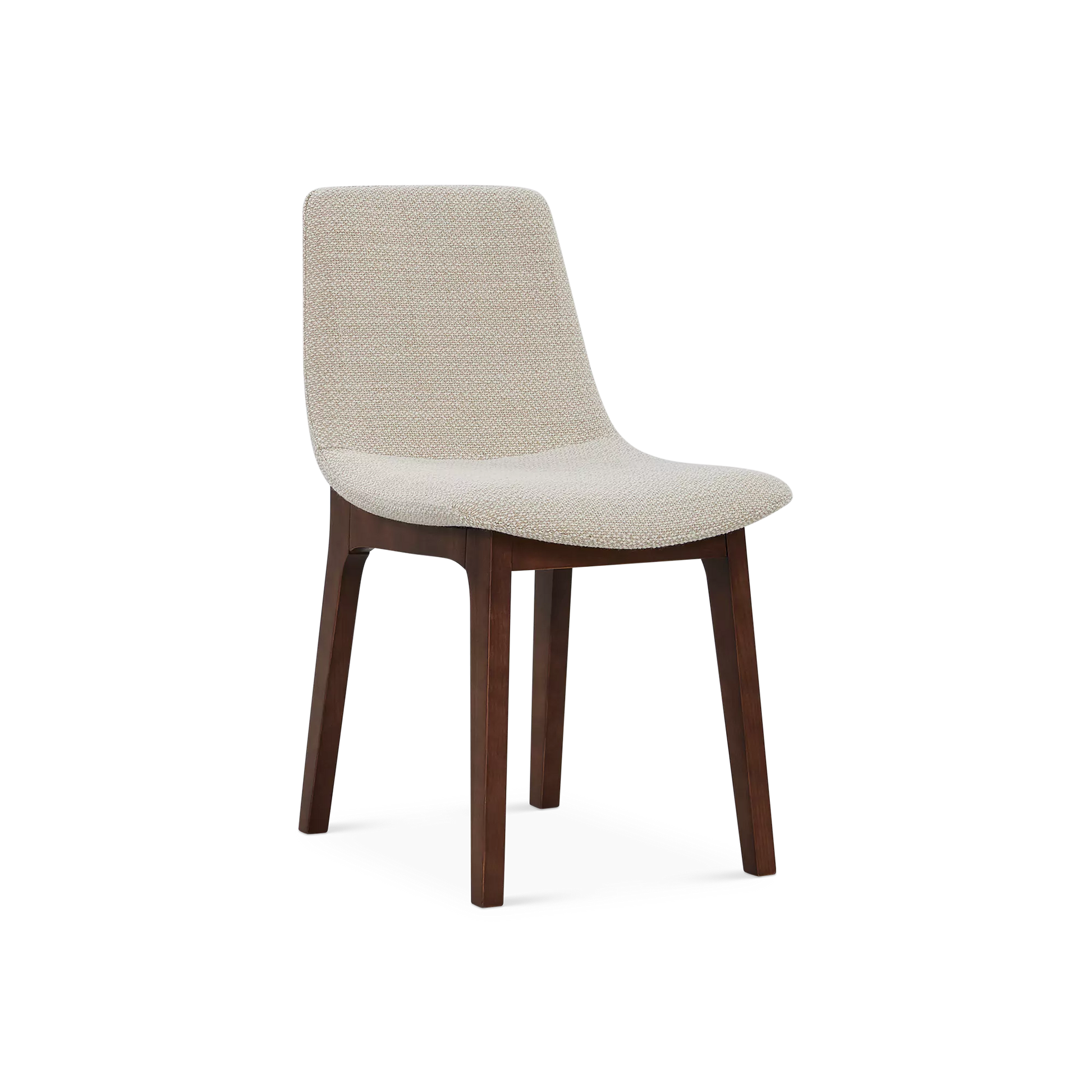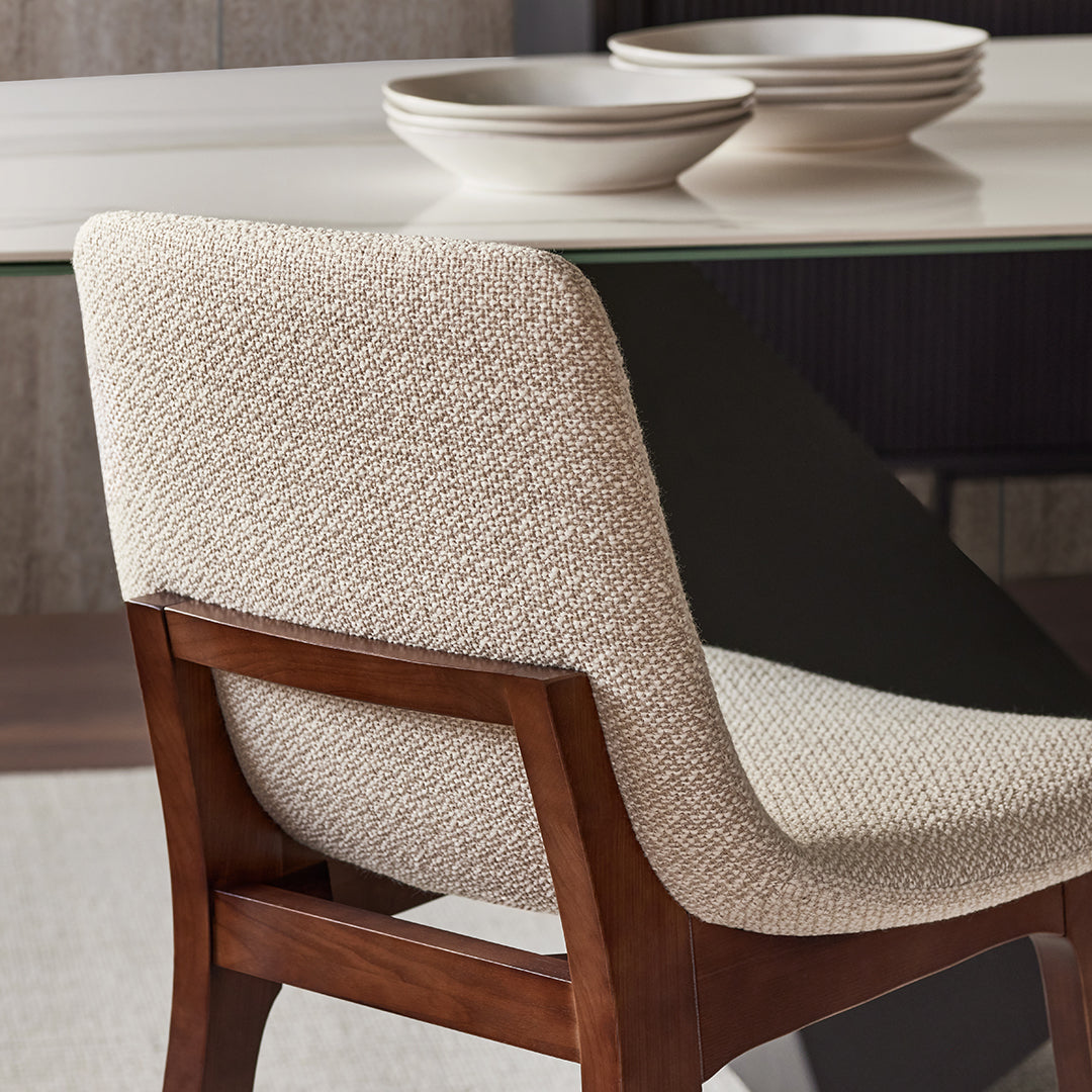 Upholstered in subtly textured fabric, equipped with a spacious, slightly curved seat and finished with straight wooden legs that extend upward to form a supportive, low-profile backrest, the Calixte chair will enhance any dining room in understated style.