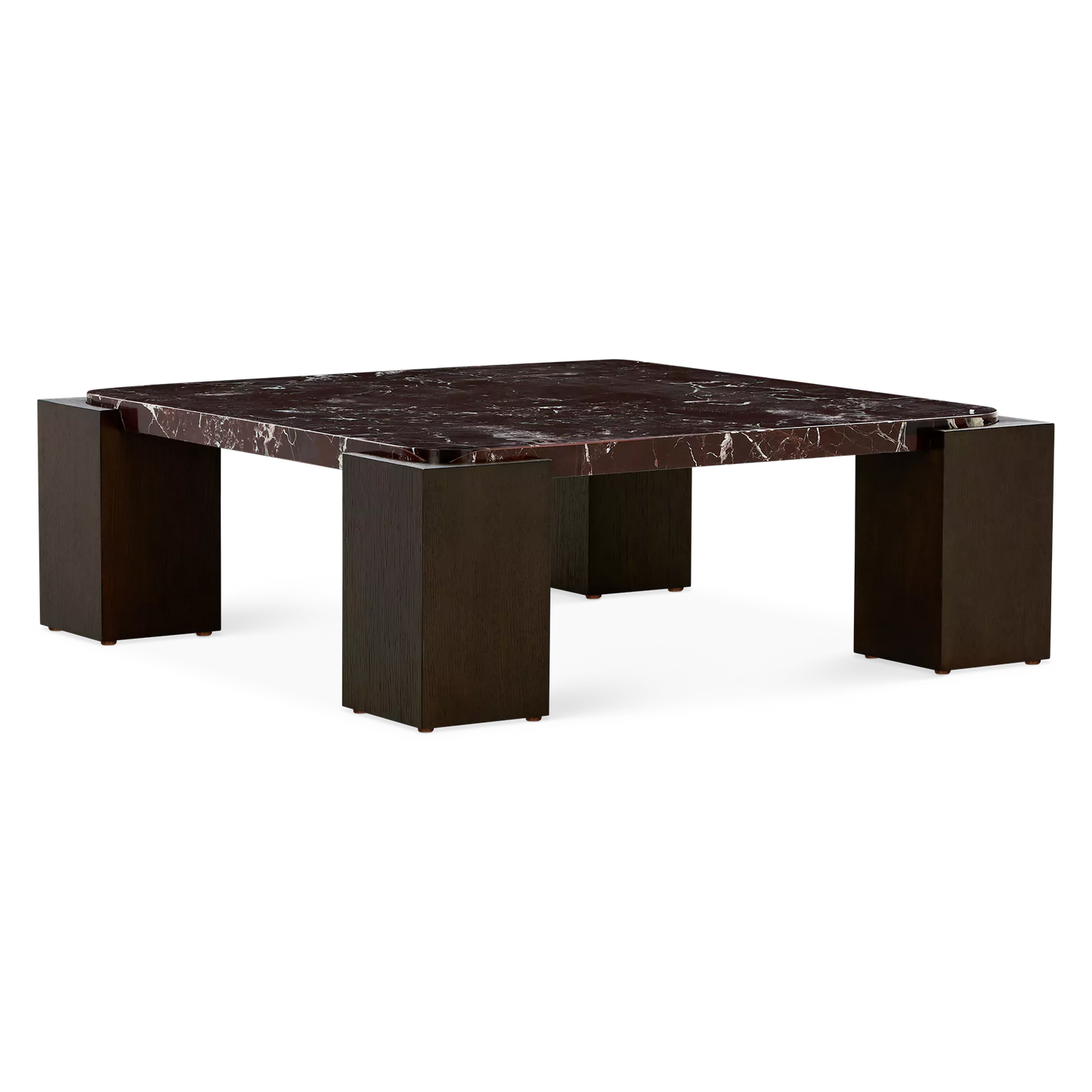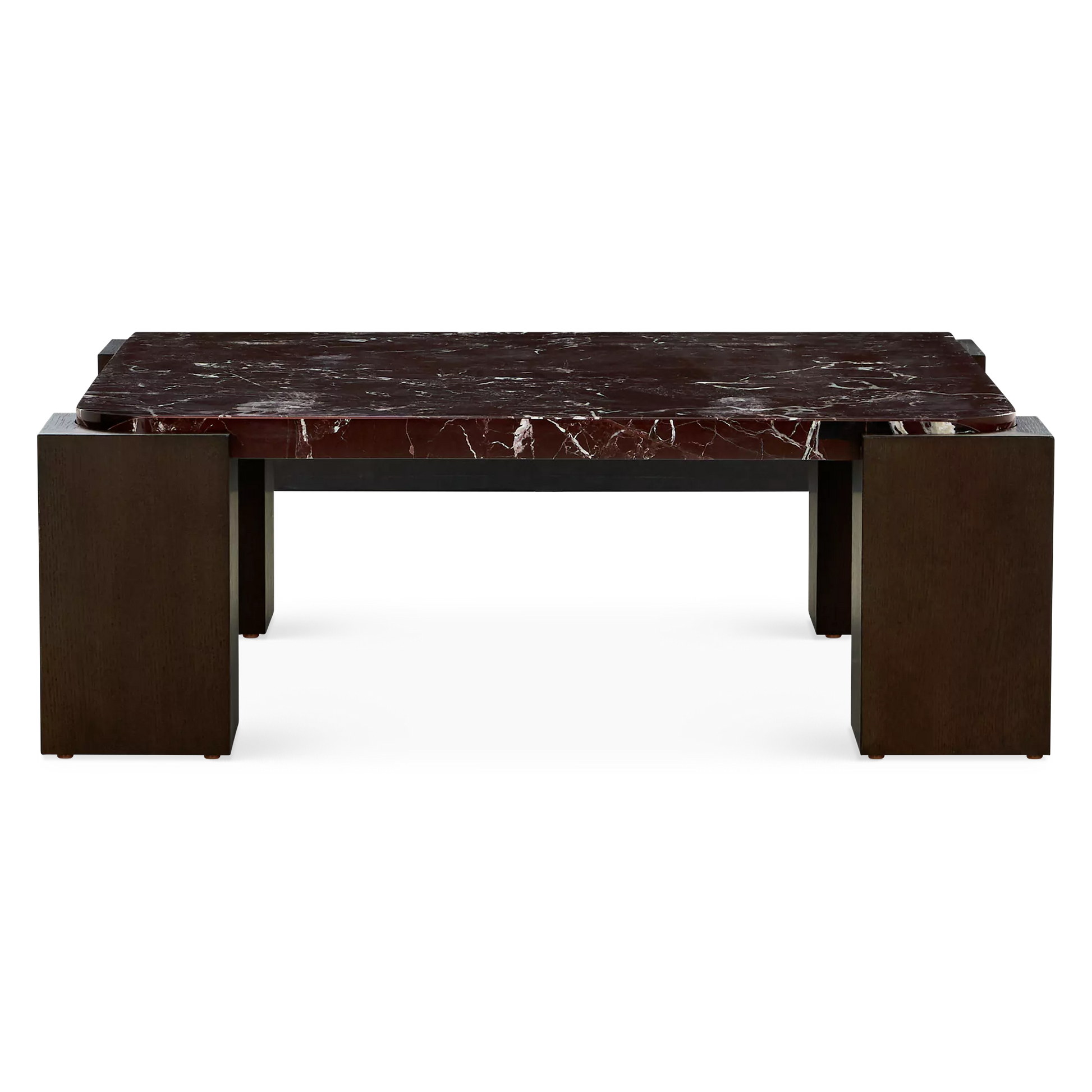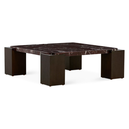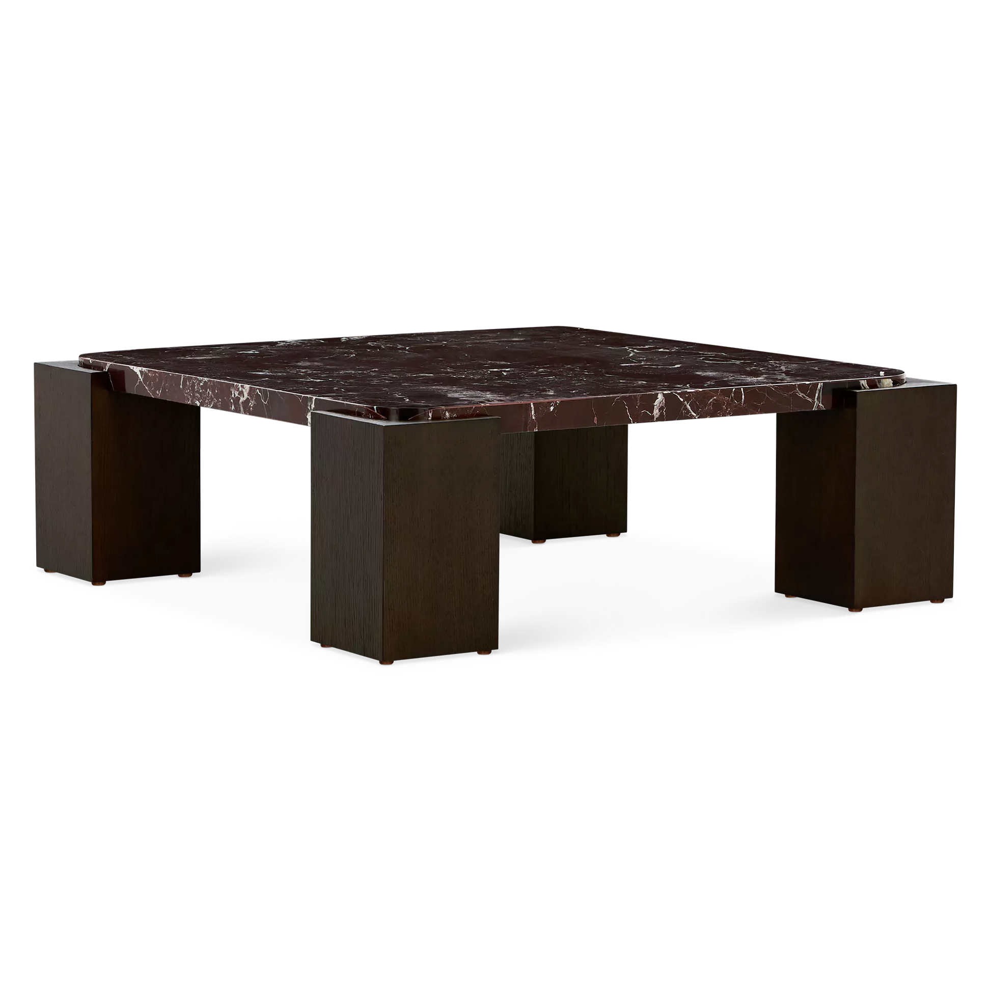 The Calla coffee table offers structure and sophistication in equal measure. Its rich burgundy marble top, with natural veining unique to each piece, rests on solid wood legs for a strong, grounded presence. Its bold geometric form and luxurious materials create a striking focal point that will anchors any living space in design-forward style.