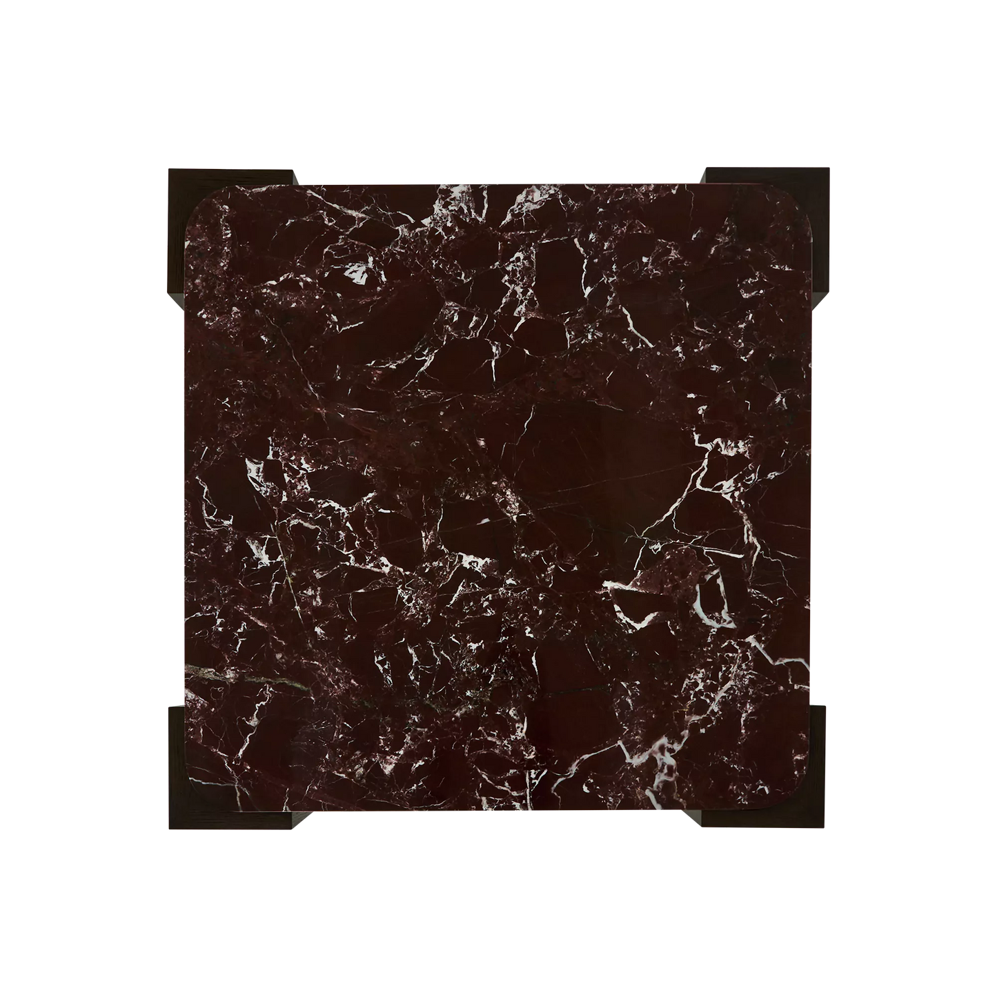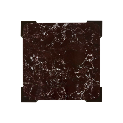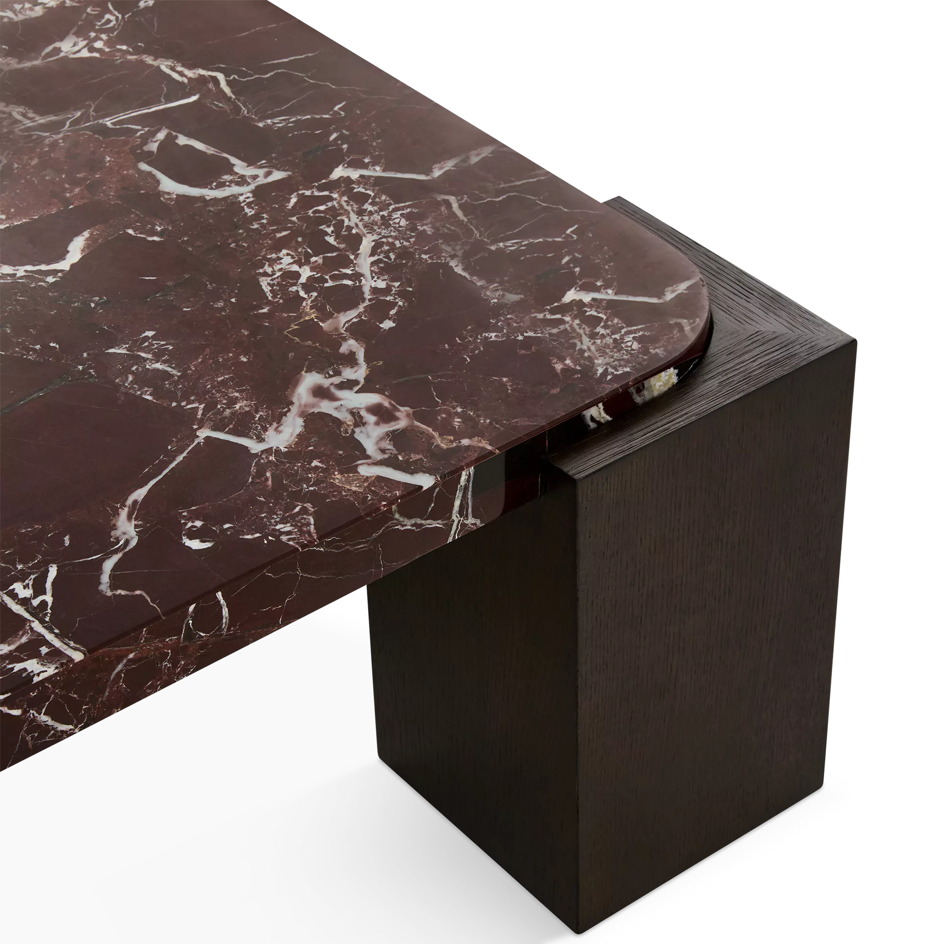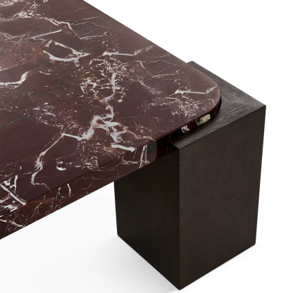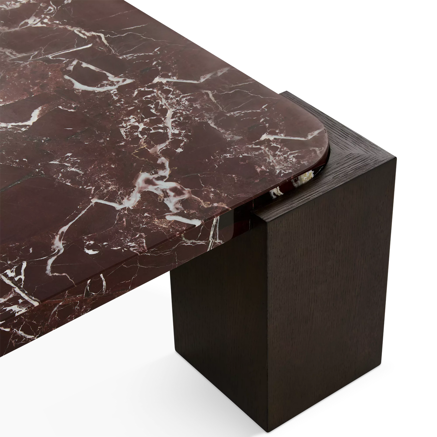 The Calla coffee table offers structure and sophistication in equal measure. Its rich burgundy marble top, with natural veining unique to each piece, rests on solid wood legs for a strong, grounded presence. Its bold geometric form and luxurious materials create a striking focal point that will anchors any living space in design-forward style.