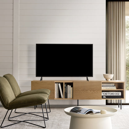 Crafted from black oak veneer with metal legs, the Cannelle TV stand impresses with its chic, minimalist look. It features a savvy combination of open and closed storage for a result that’s at once functional and elegant.