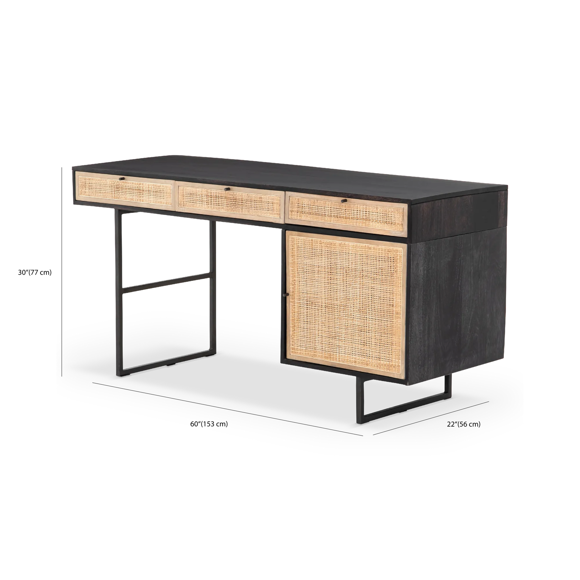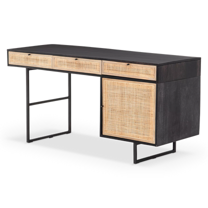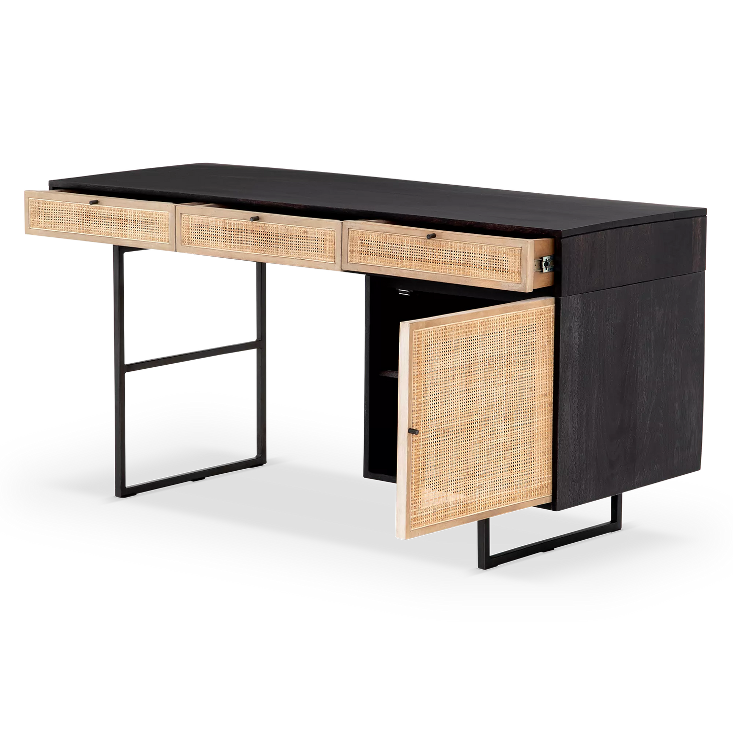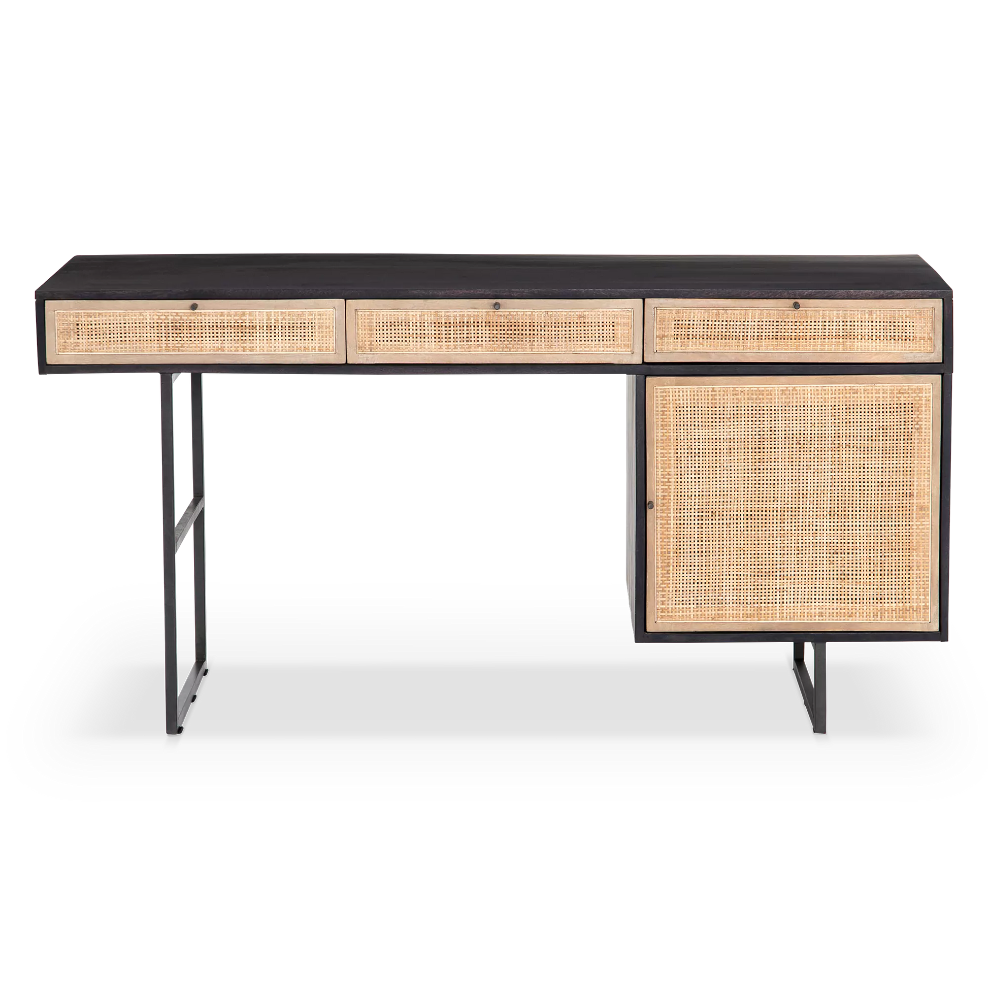 The Carmel desk is distinguished by its natural character and retro-inspired look. Encased in a mango-wood frame standing on angular iron legs, its door and three drawers stand out with their wicker facades.