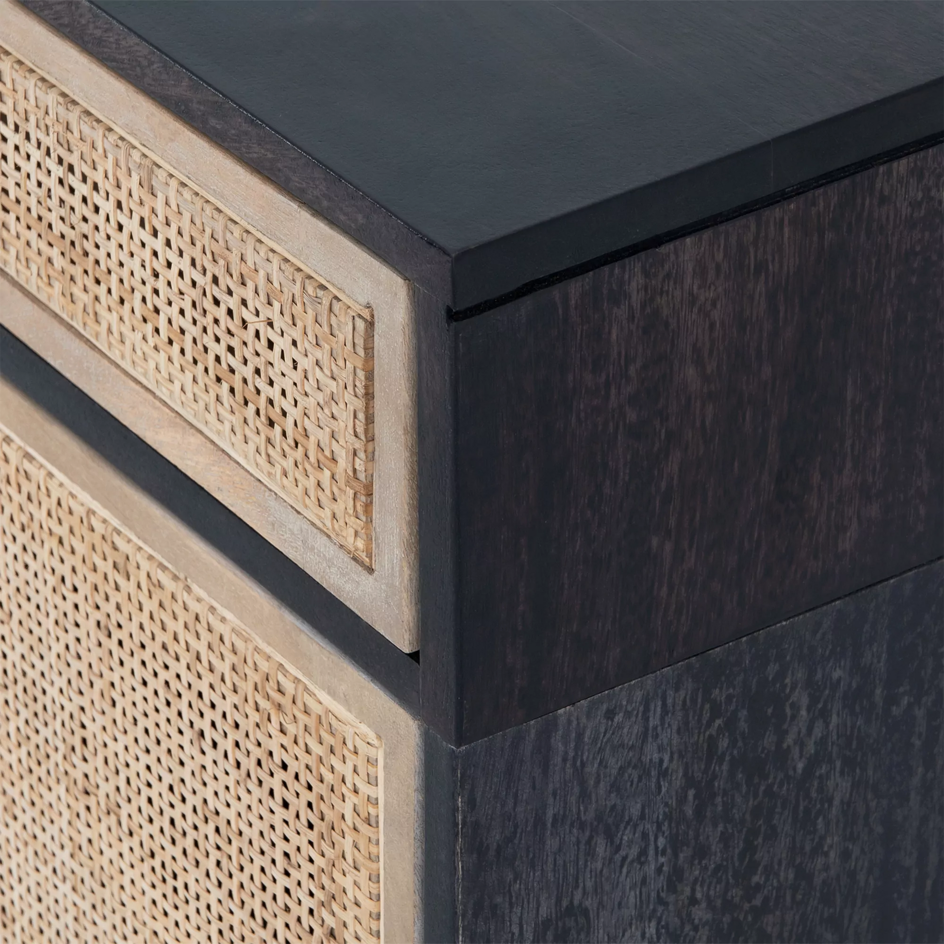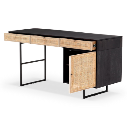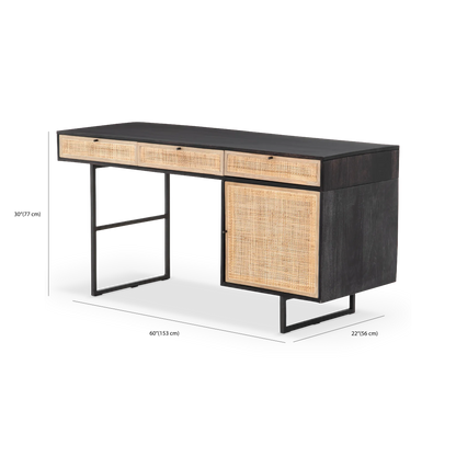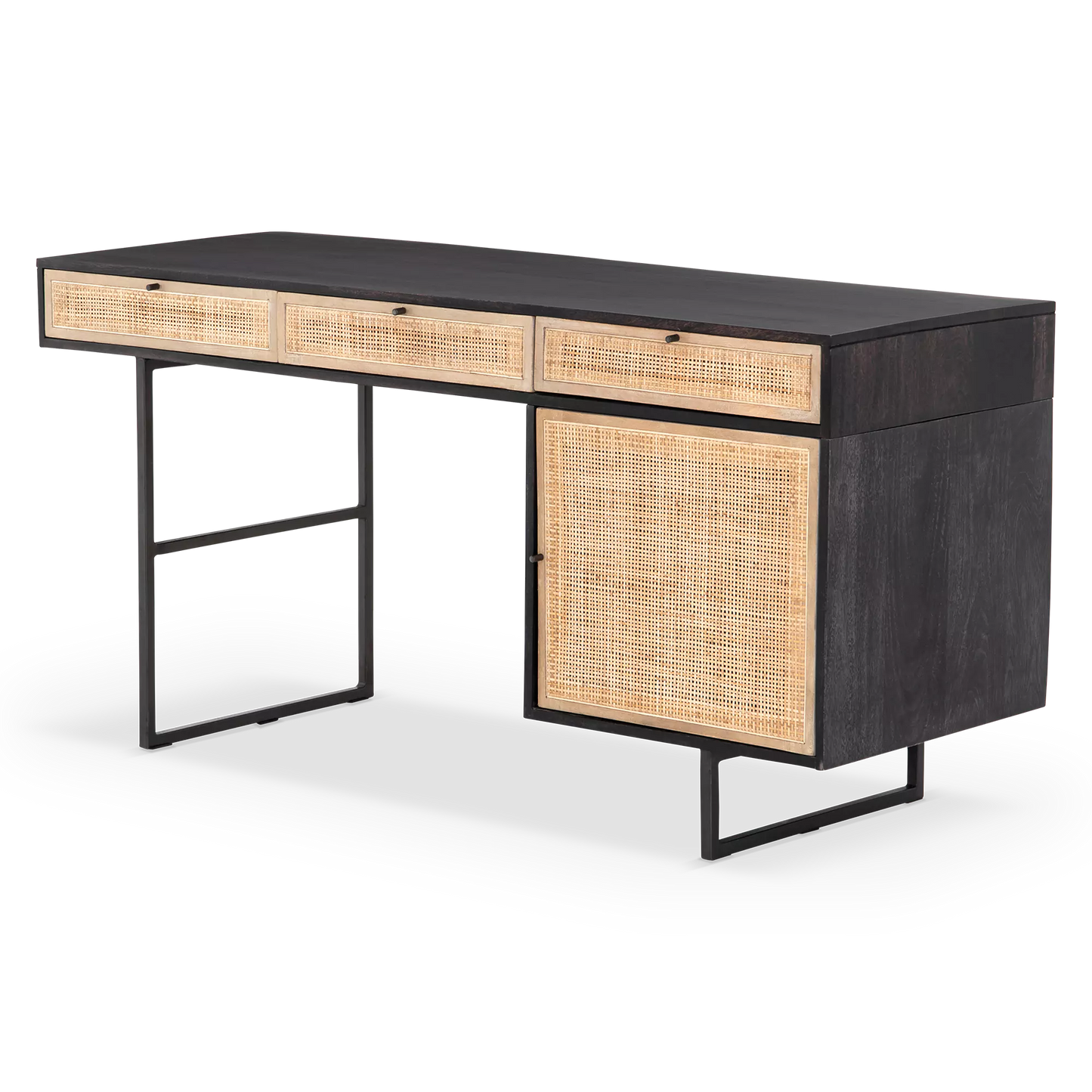 The Carmel desk is distinguished by its natural character and retro-inspired look. Encased in a mango-wood frame standing on angular iron legs, its door and three drawers stand out with their wicker facades.
