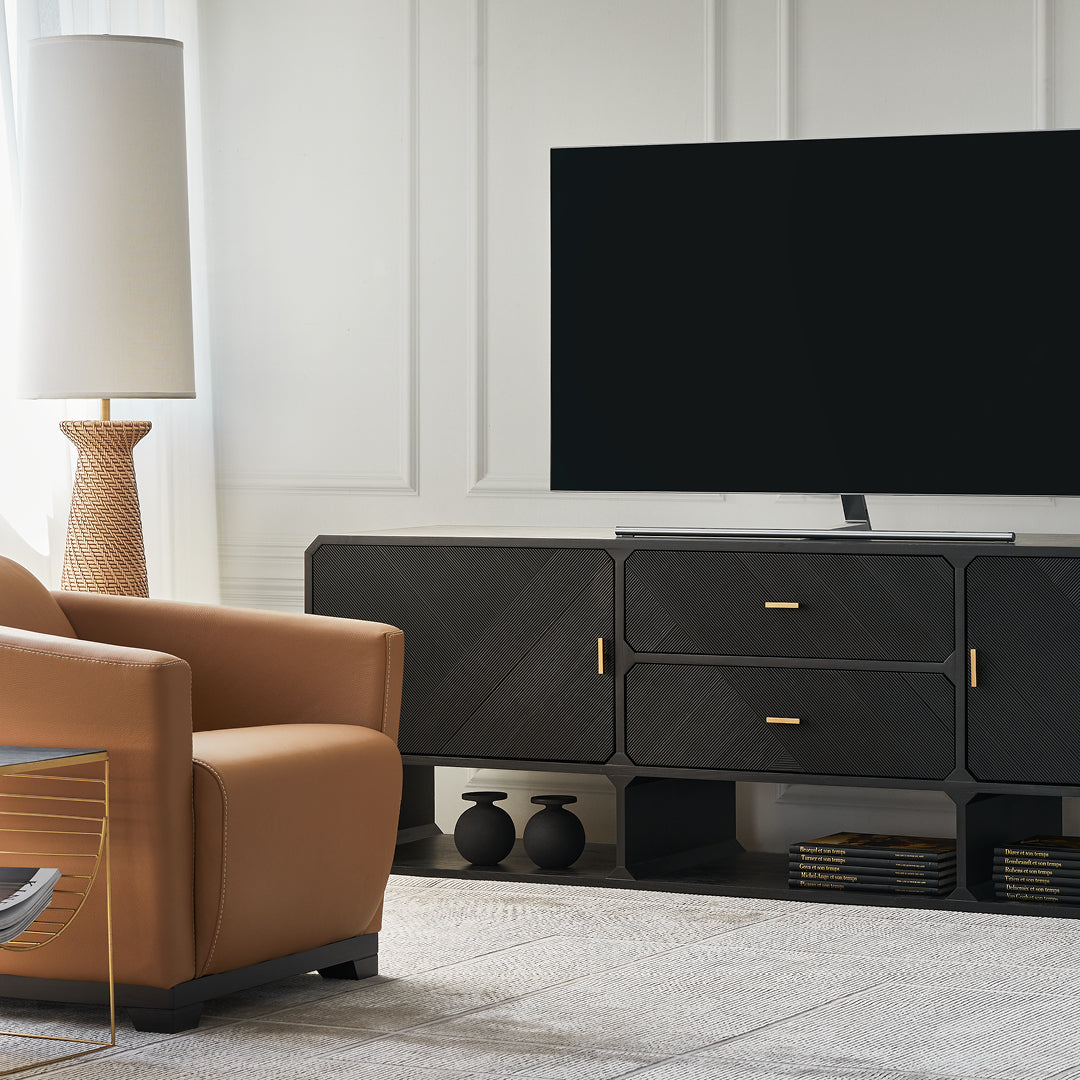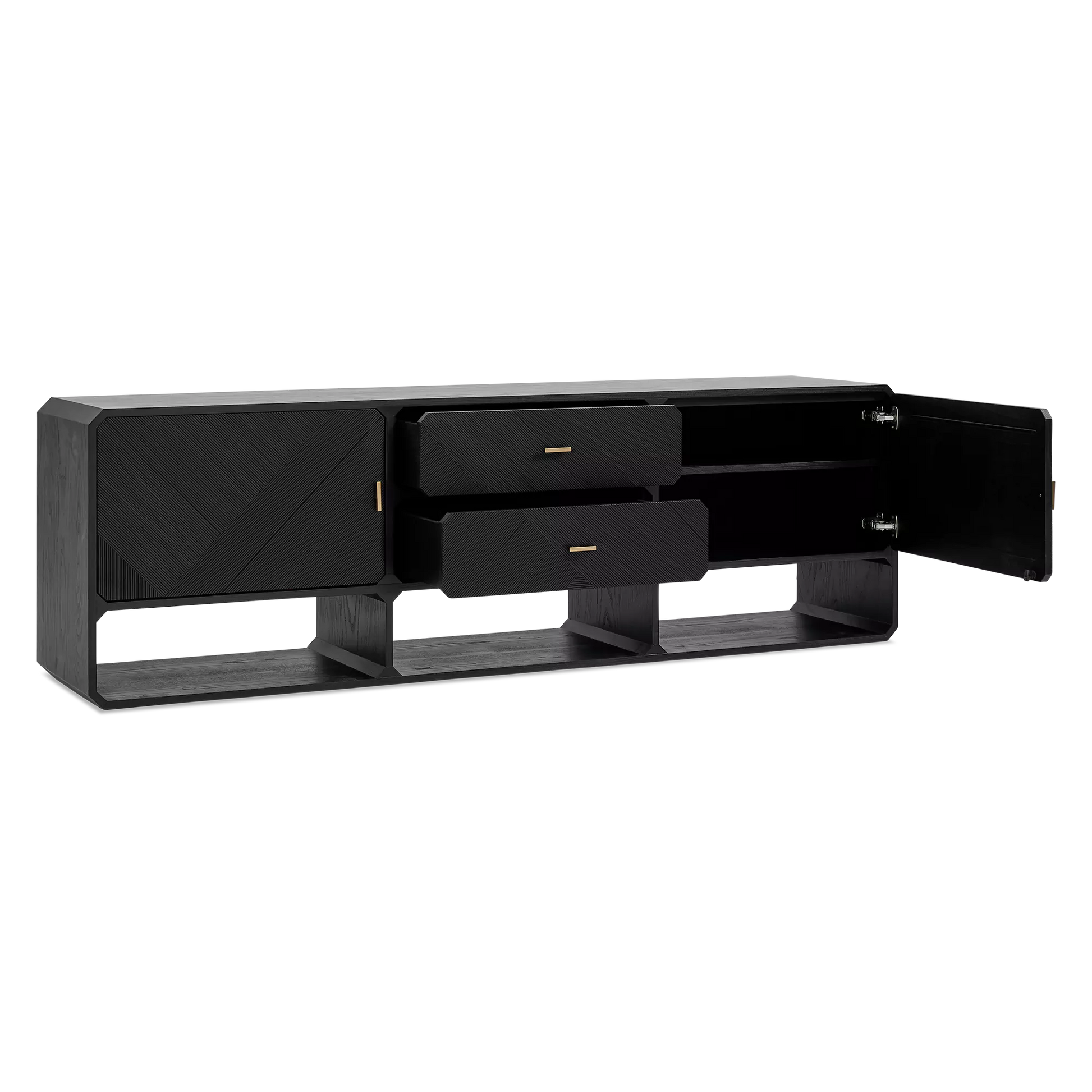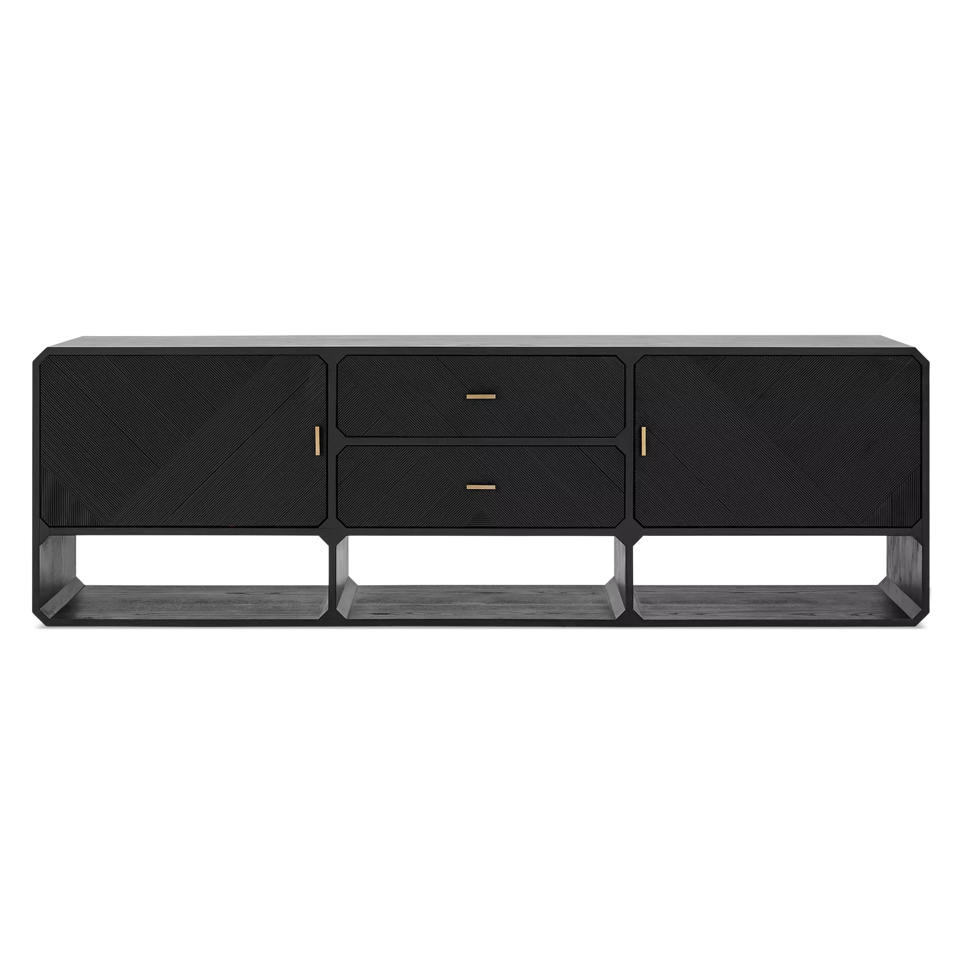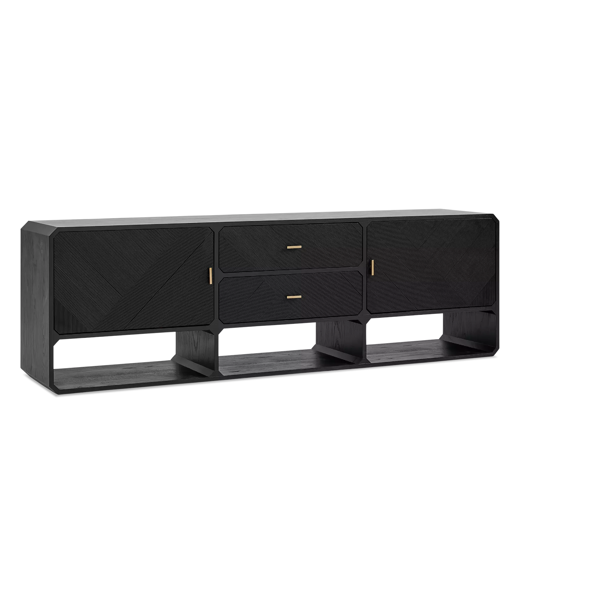 The Caspian console is elaborate in detail with its diagonally fluted pattern, chamfered edging and slender, satin brass handles. The doors on either side open to reveal hidden storage space, while three compartments on the bottom offer an open look and added space to accommodate decorative objects and books.