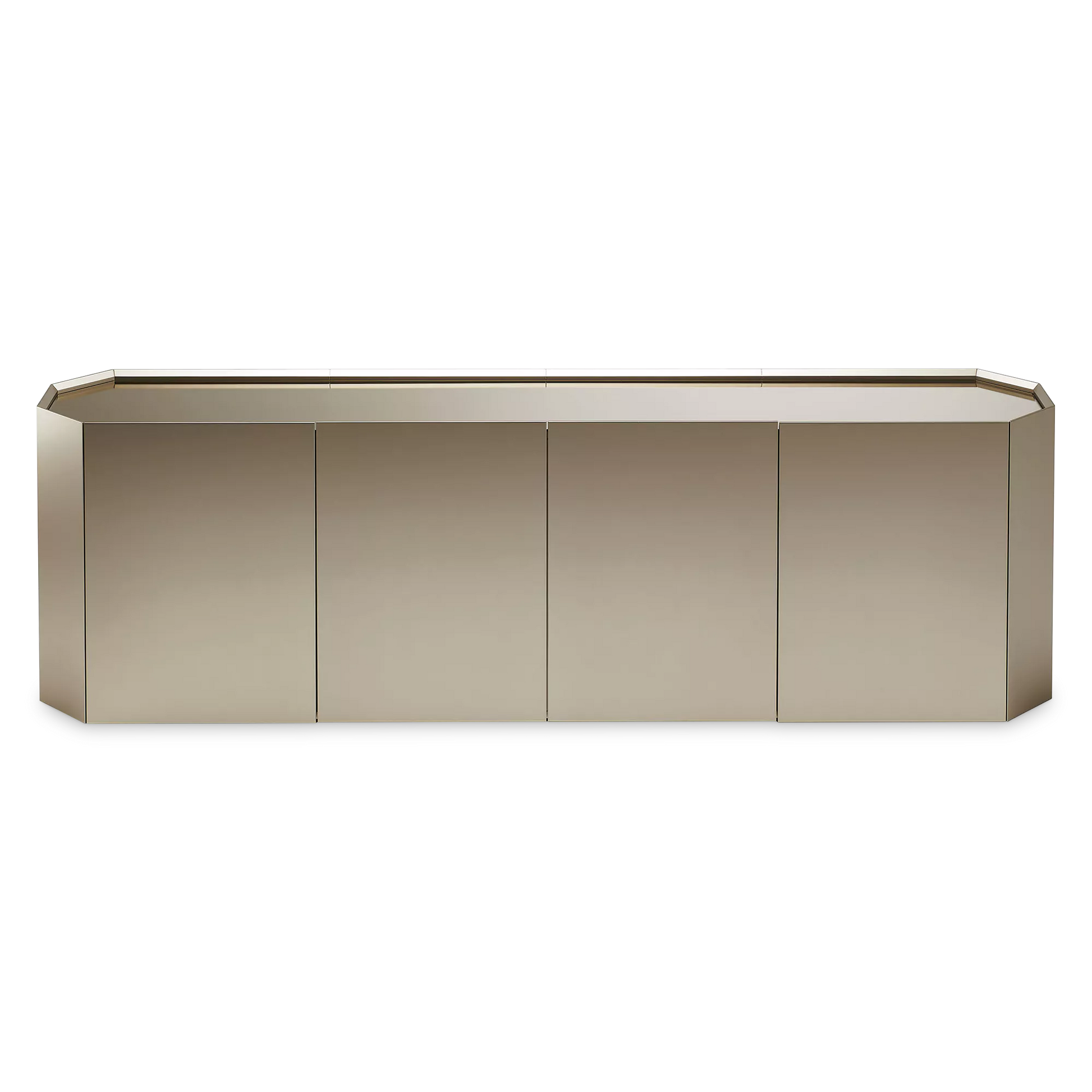 Sculptural and geometric, the Chelsea sideboard by Cattelan Italia features matte, lacquered wood frame panels that conceal glass shelving at the centre. The frame comes crowned with a top made with a choice of clear or mirrored glass.