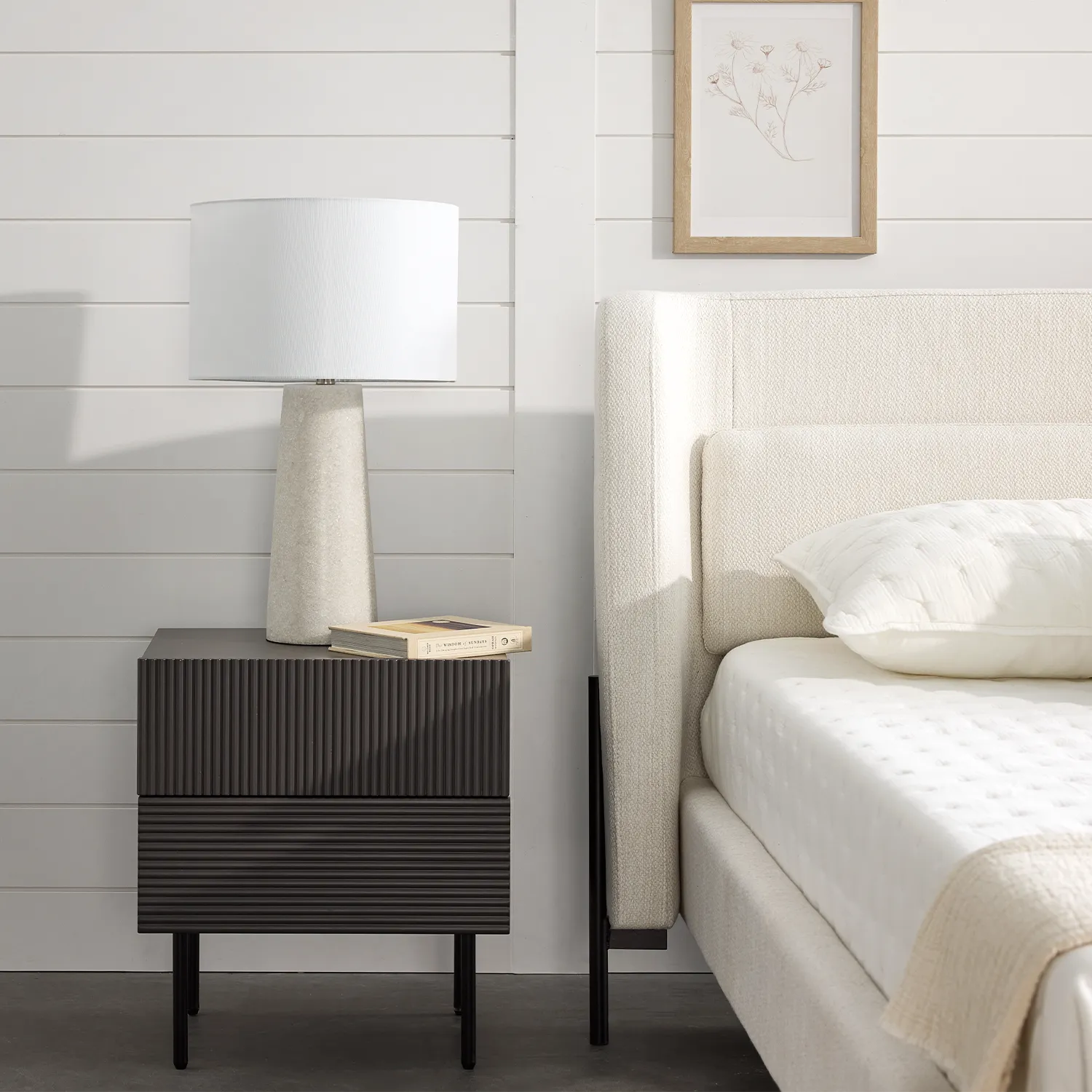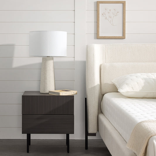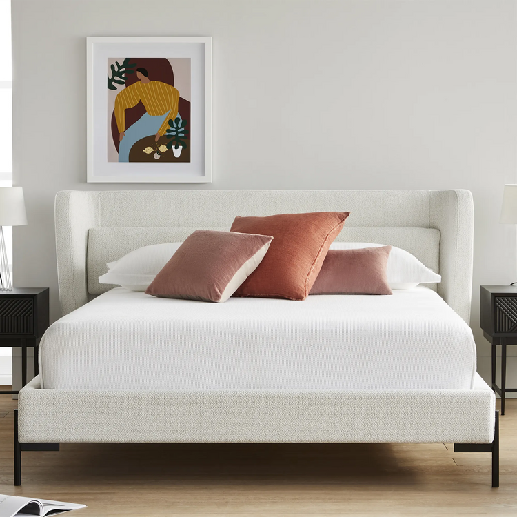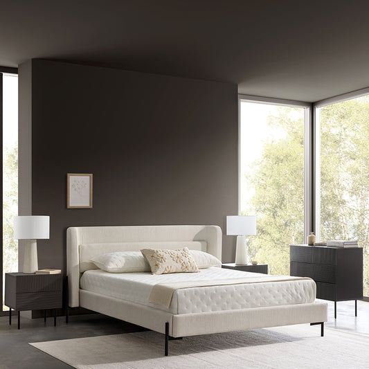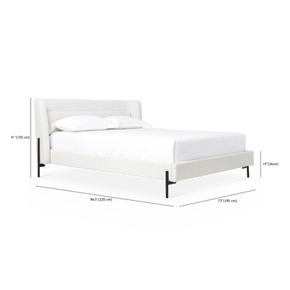Upholstered in off-white heathered fabric, the Claire bed blends into any bedroom in seamless style. It pairs well with both wooden and metal bedside tables.