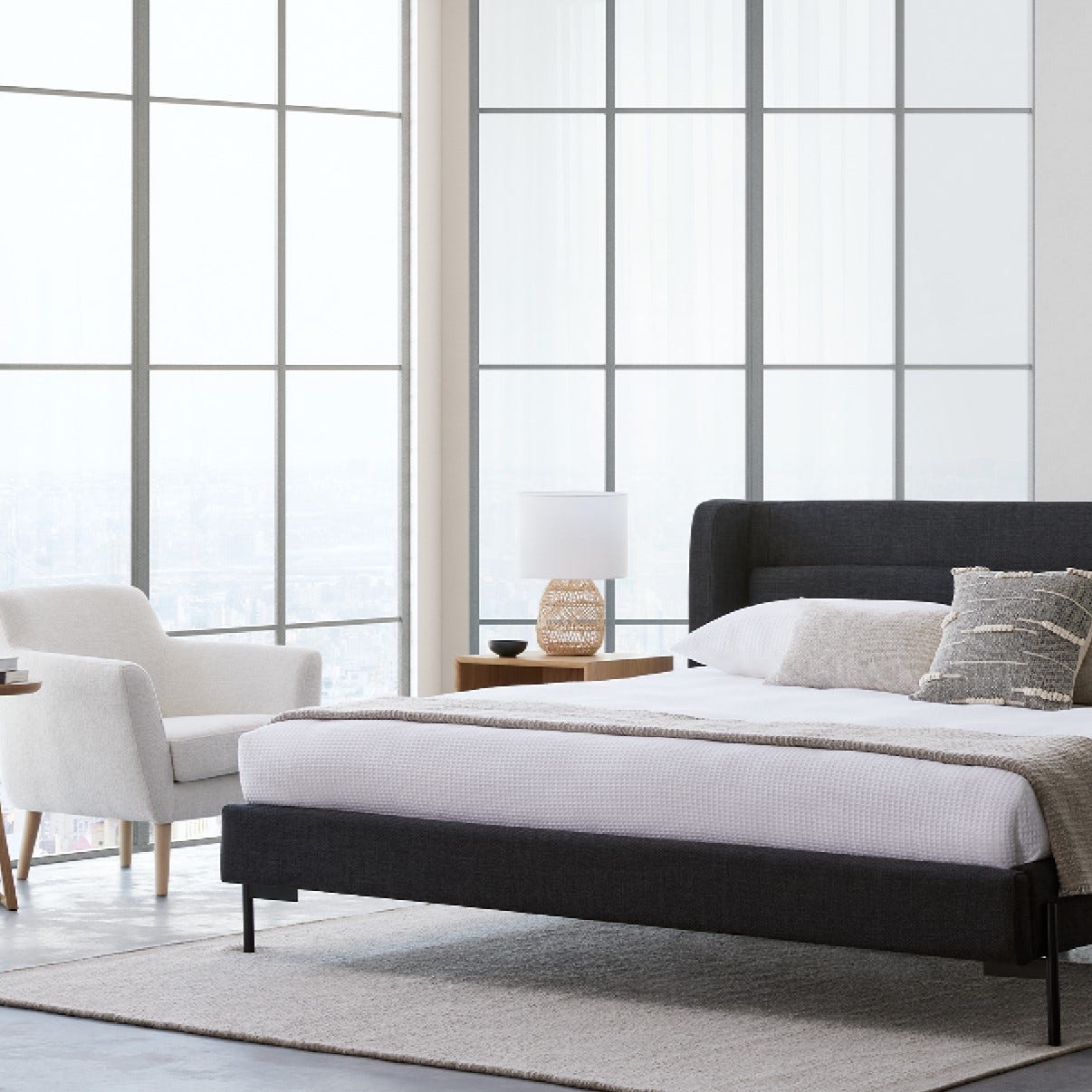 Feeling cozy? Meet the Claire bed — the definition of comfort and style. Let its softly textured, heathered headboard wrap you up after a long day, and admire its curved silhouette and slender black legs for a contemporary look.