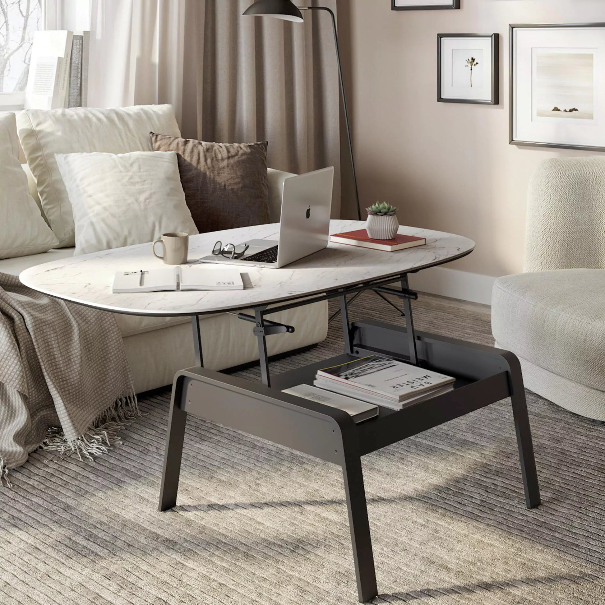 - Pneumatic lift mechanism that adjusts the tabletop to the ideal height for working or eating.