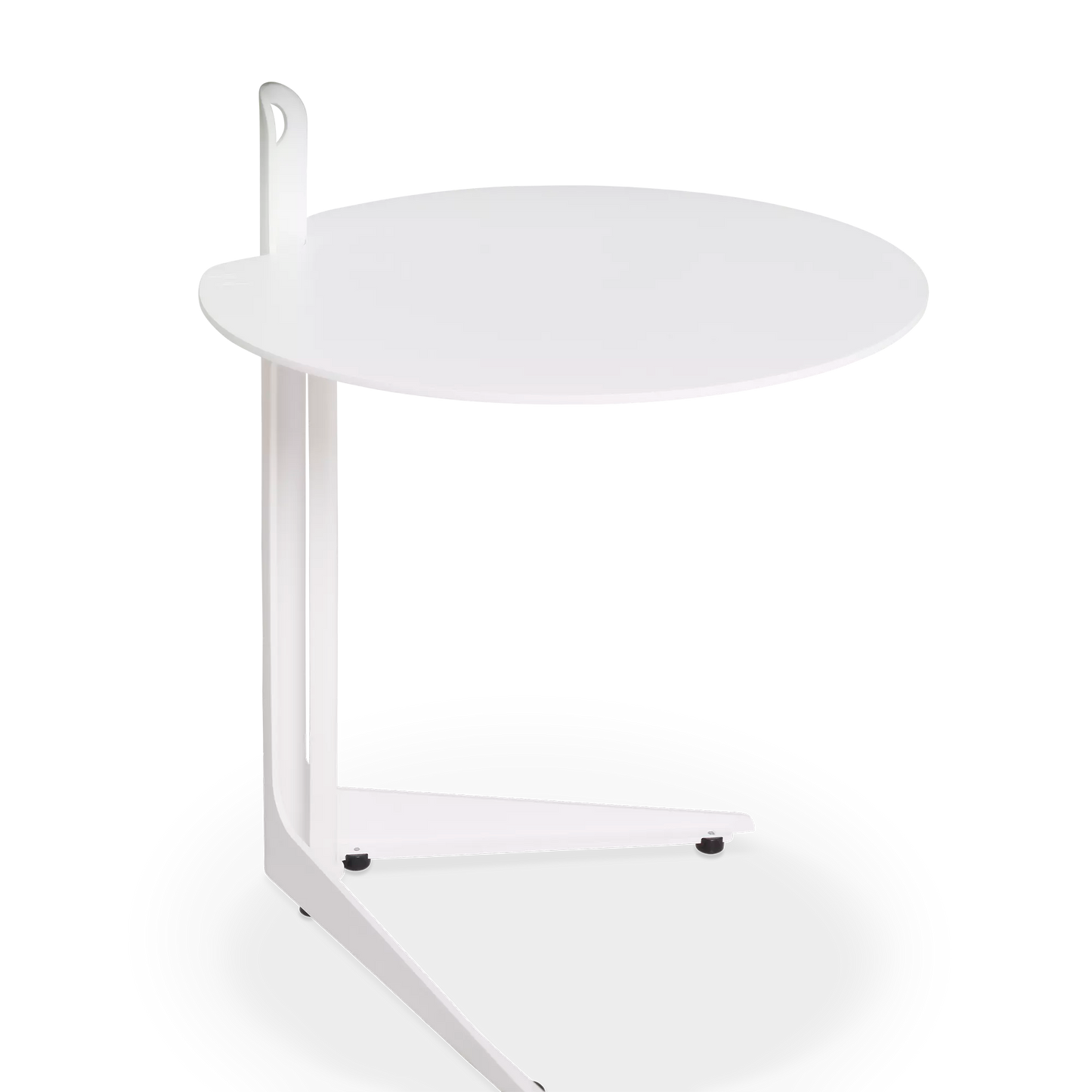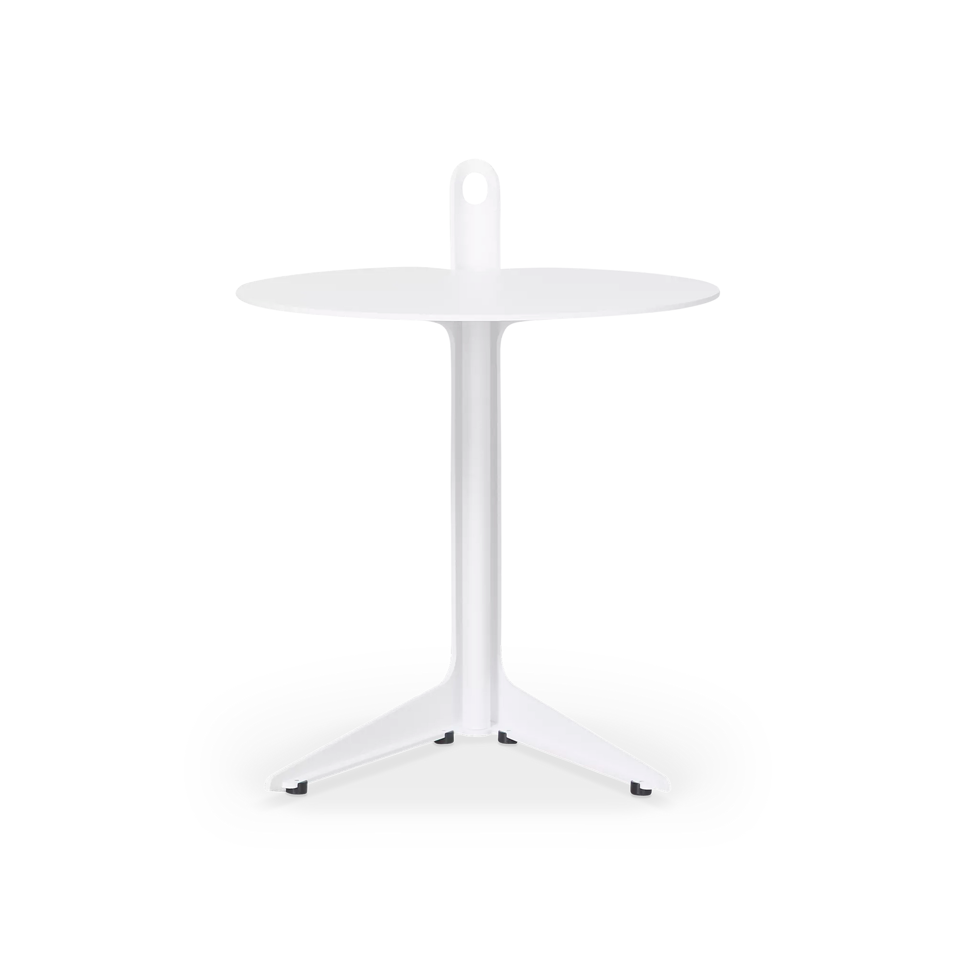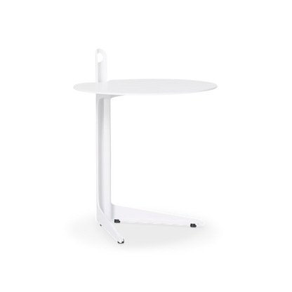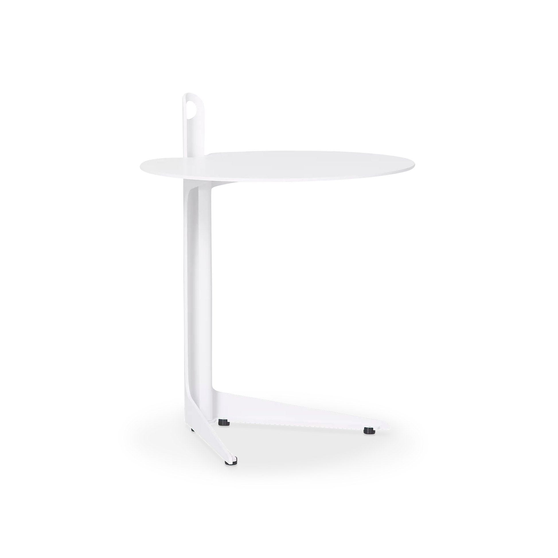 At once graphic and refined, this side table was designed by Mathias de Ferm for the Belgian manufacturer of high-end furniture Joli. Its practical V-shaped base slides easily beneath a lounge chair or low-profile sofa. Made entirely from lacquered aluminum, it is easy to maintain and available in two heights.