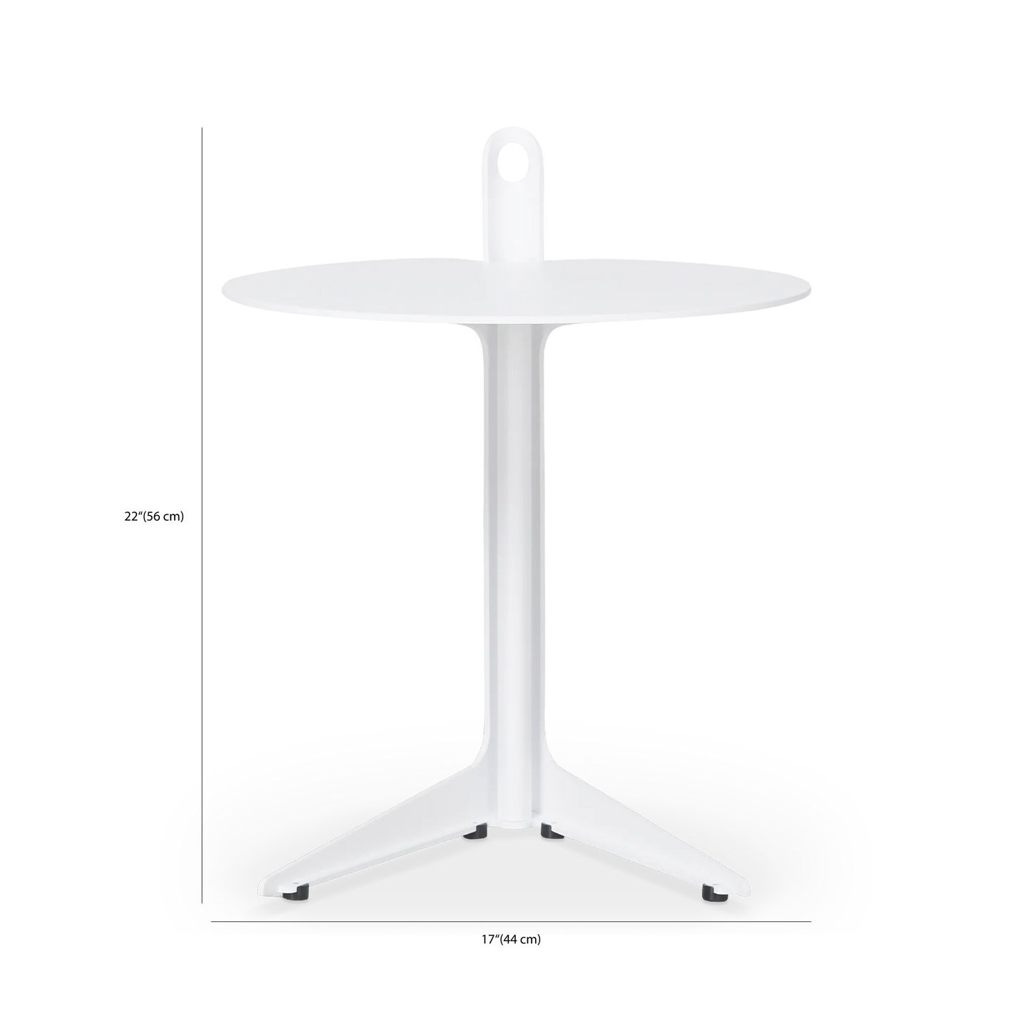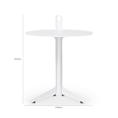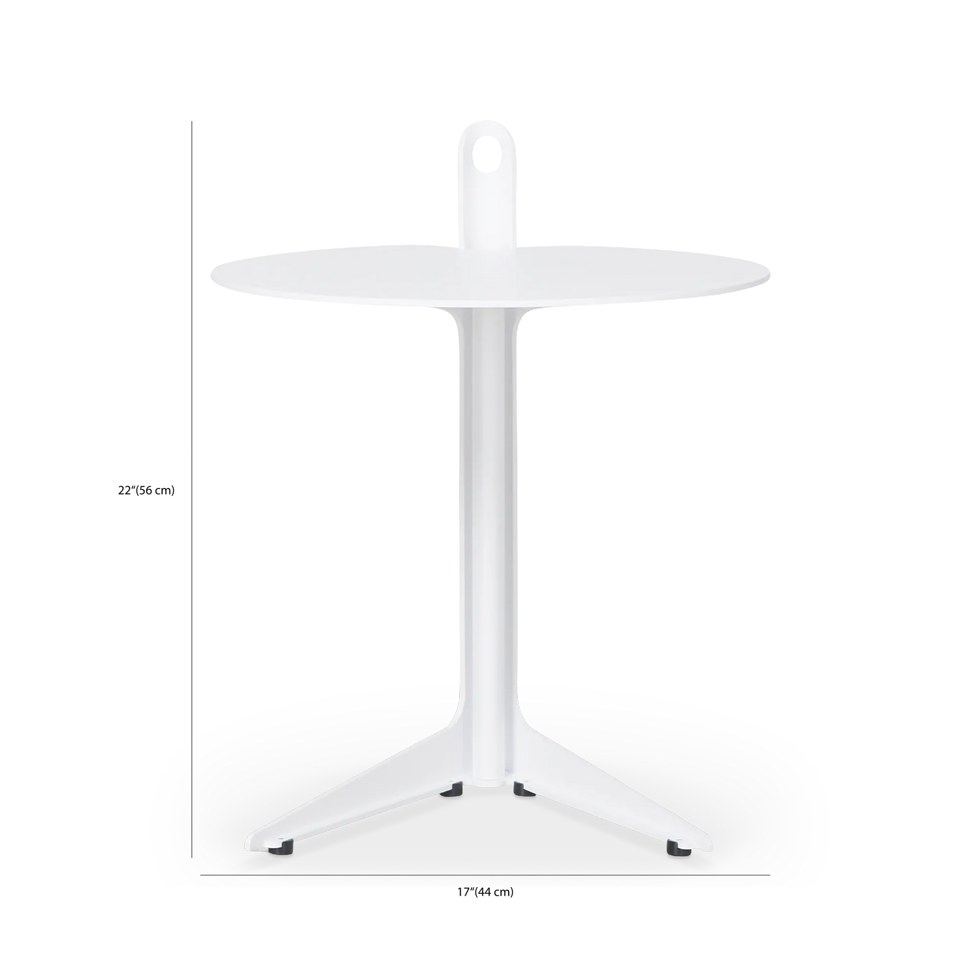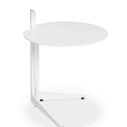 At once graphic and refined, this side table was designed by Mathias de Ferm for the Belgian manufacturer of high-end furniture Joli. Its practical V-shaped base slides easily beneath a lounge chair or low-profile sofa. Made entirely from lacquered aluminum, it is easy to maintain and available in two heights.