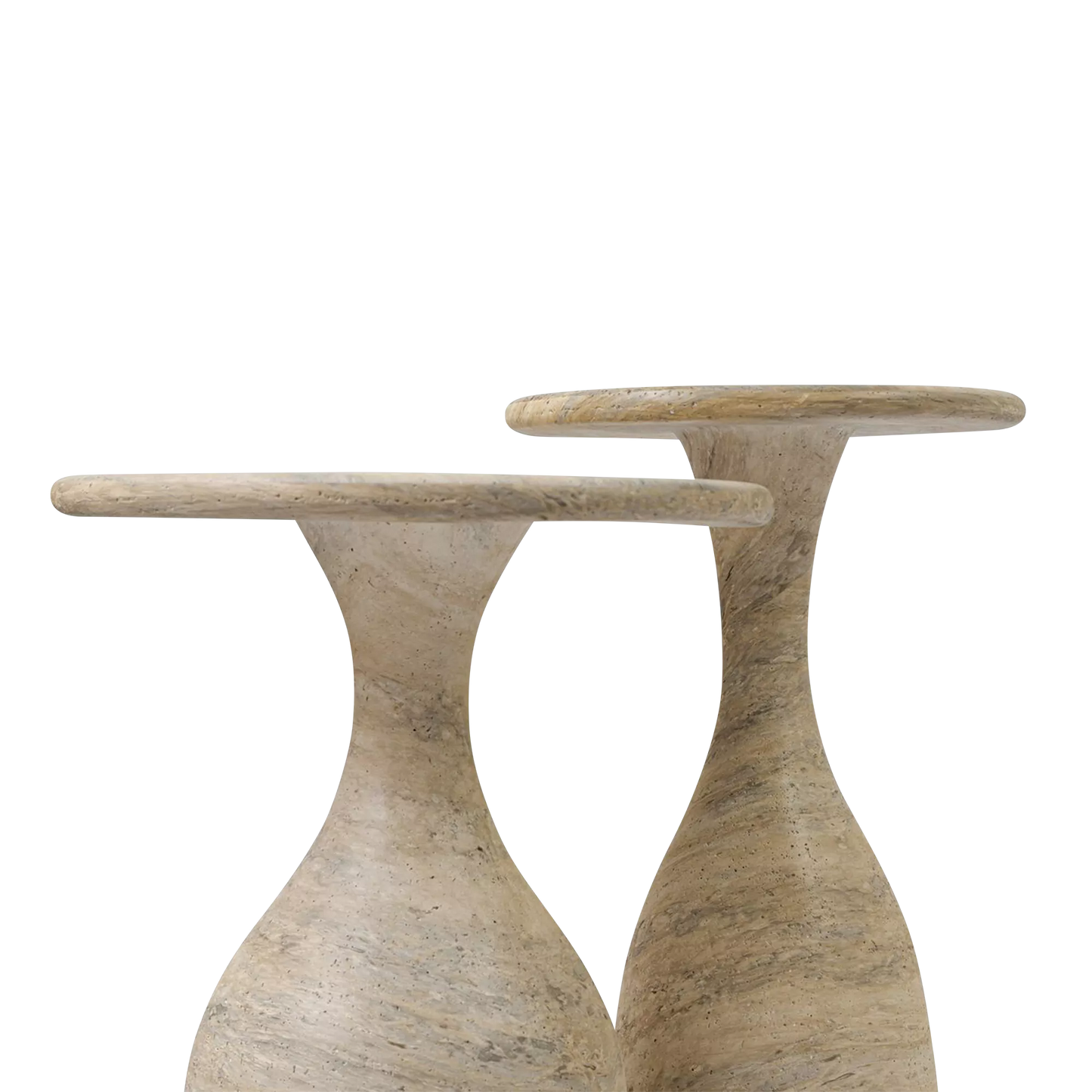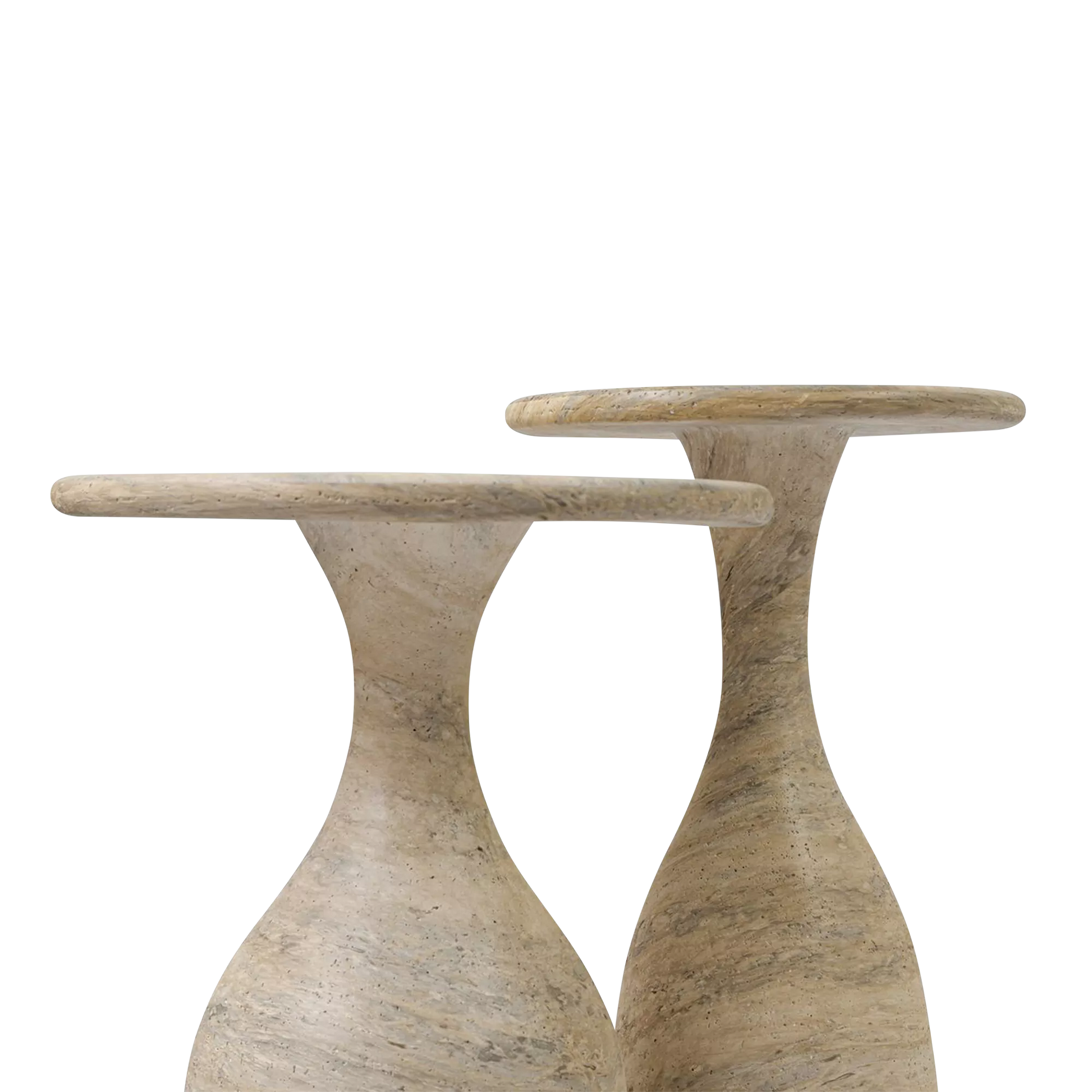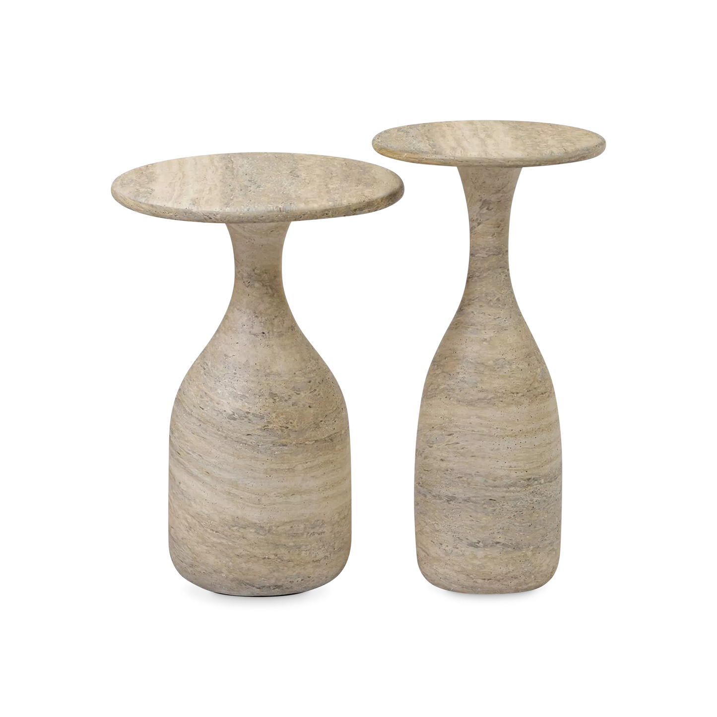 The Cora nesting tables reinterpret antique vessel shapes through a sculptural, contemporary lens. Crafted in concrete and finished with a stone-effect water transfer technique, each piece showcases organic texture and visual depth. Their fluid, stacked silhouettes add an artful presence to any room, while the versatile nesting design offers flexible surface space wherever it’s needed.