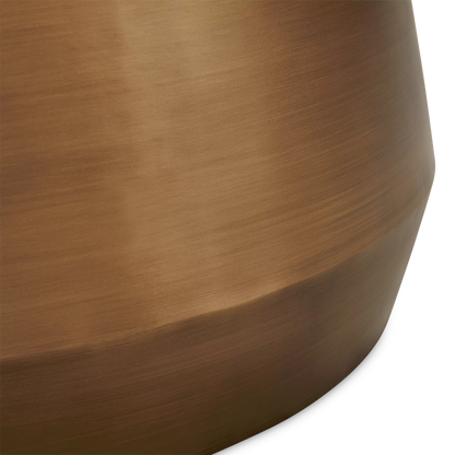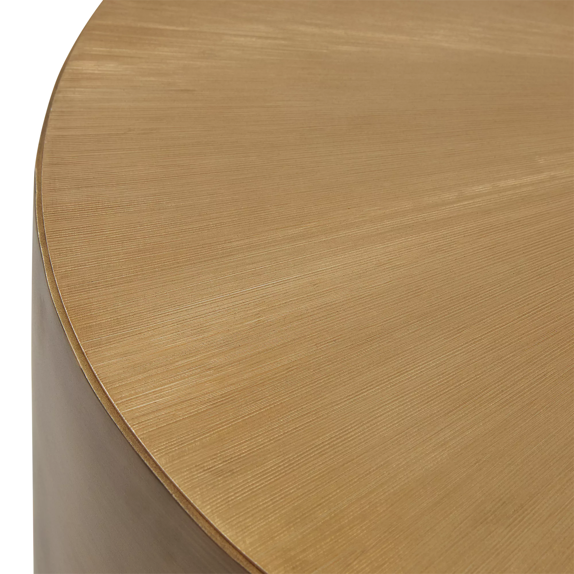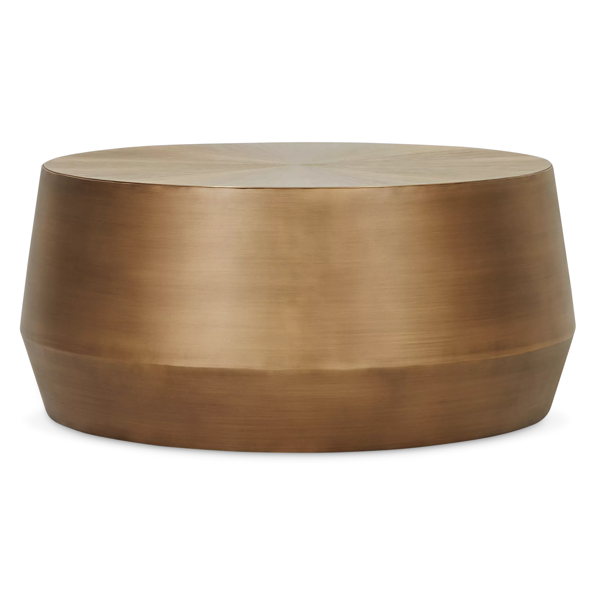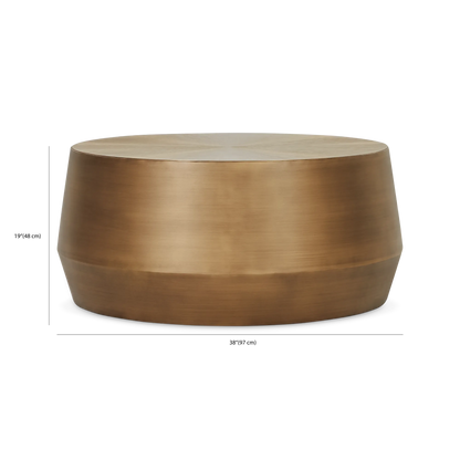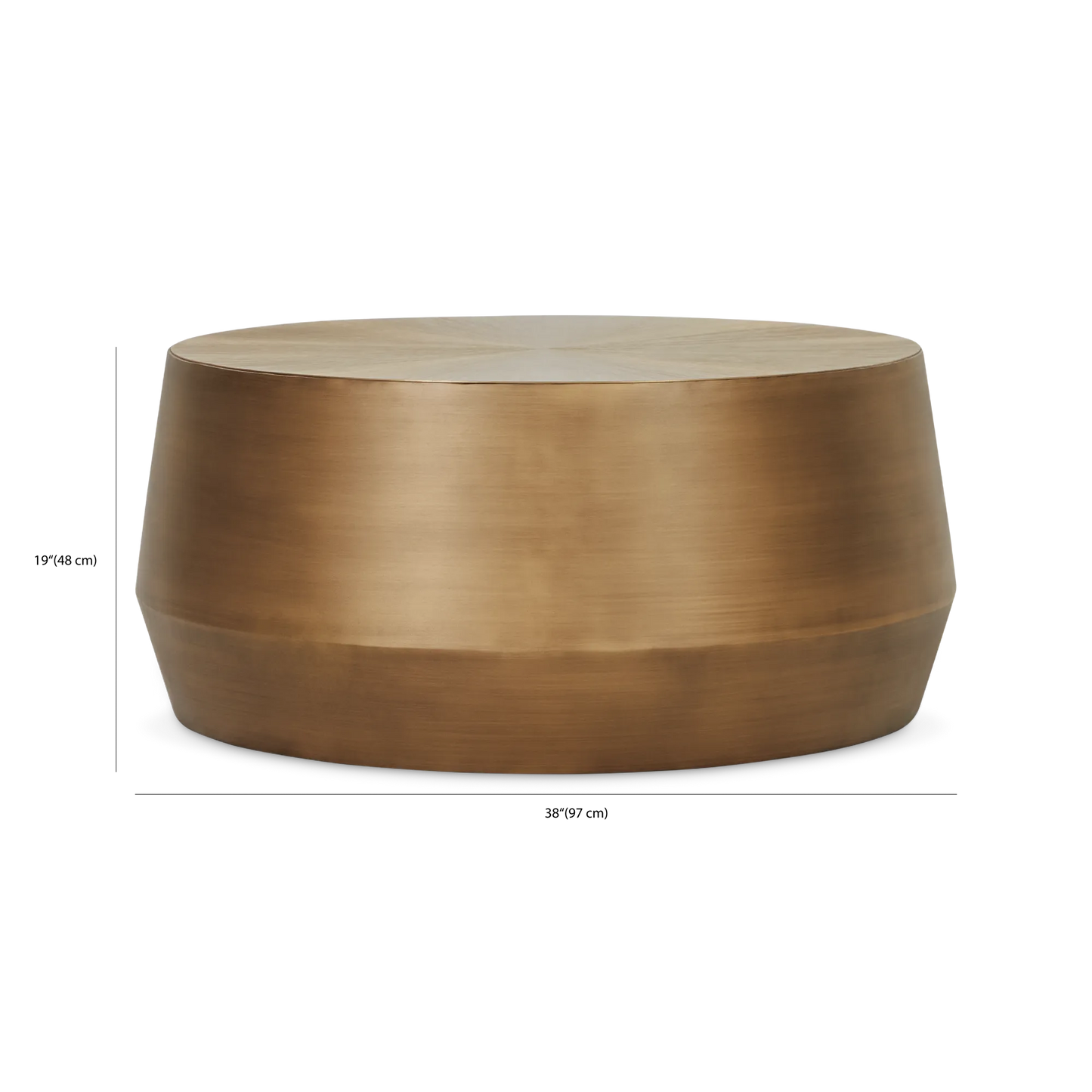 An exceptional creation, the Creed coffee table stands out with its hand-engraved and hammered top and drum-inspired base. Its antique gold finish brightens its surrounding space while it brims with rare elegance.