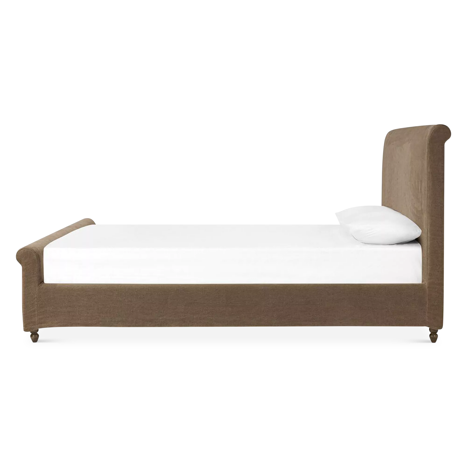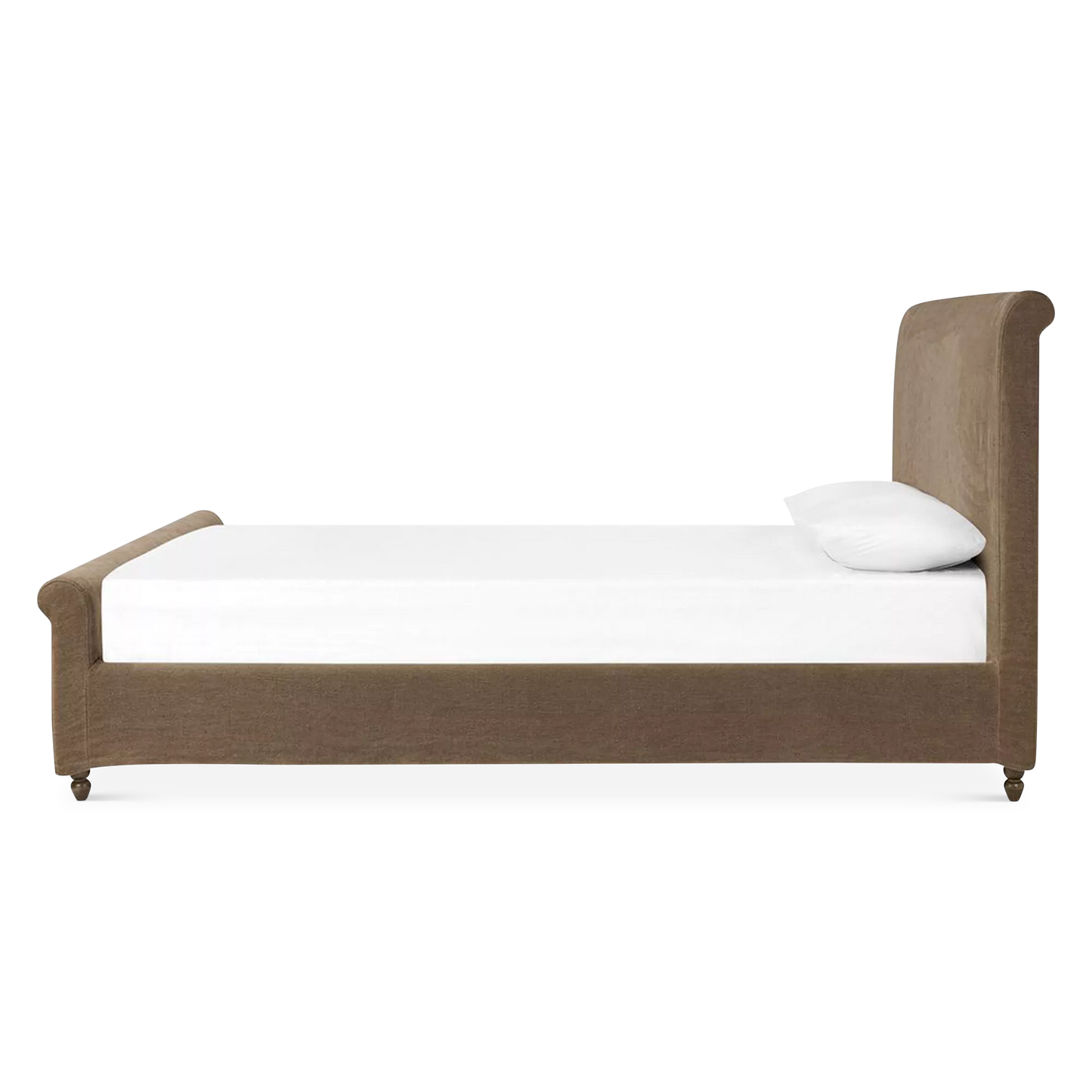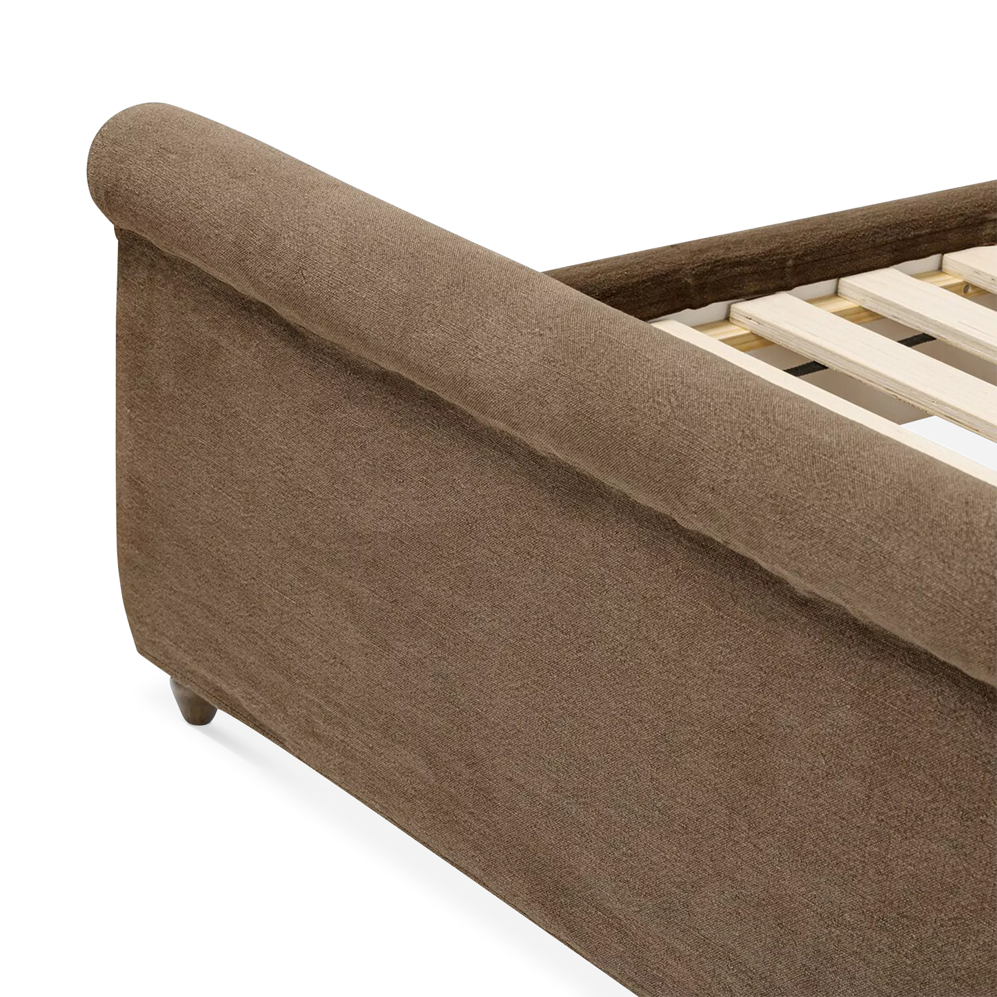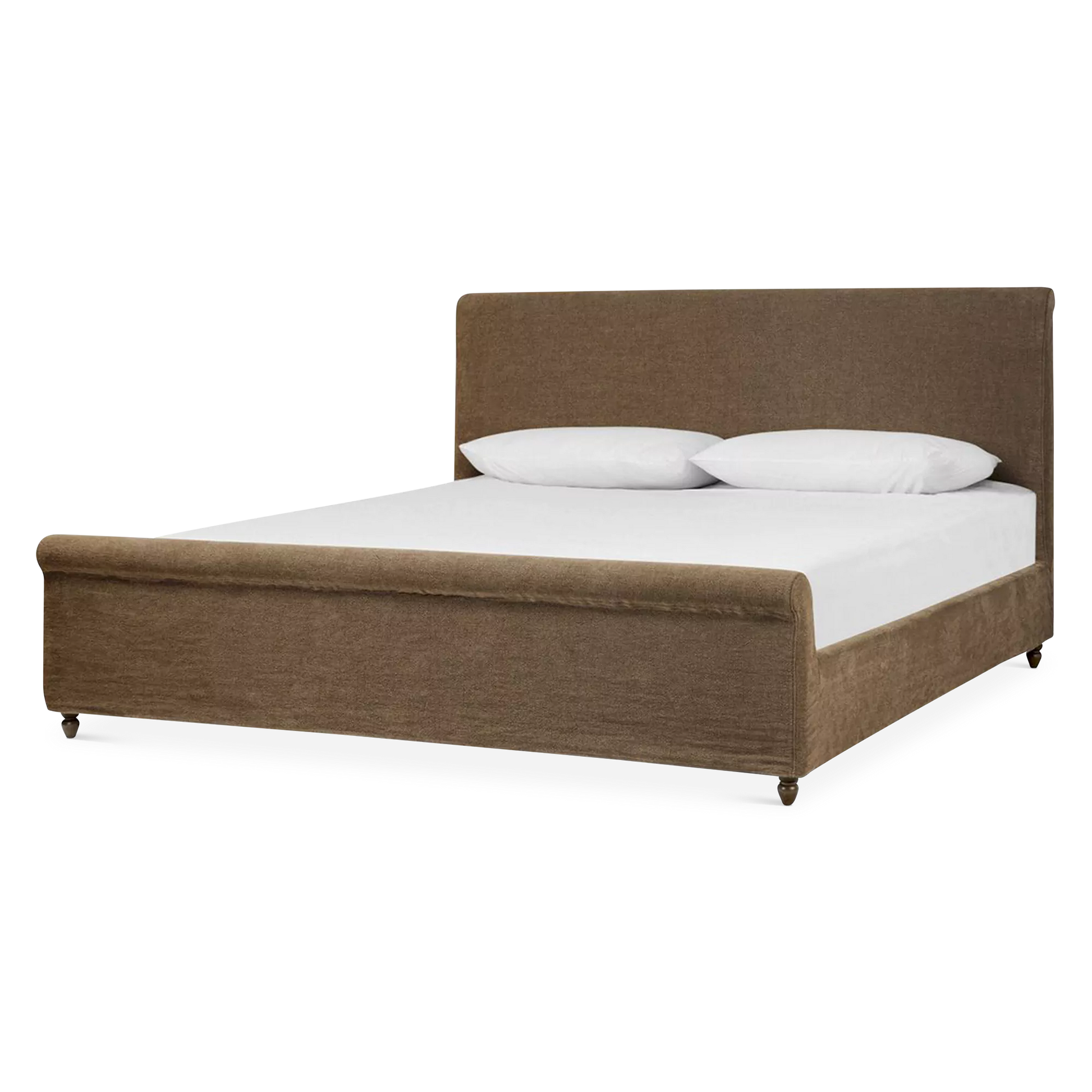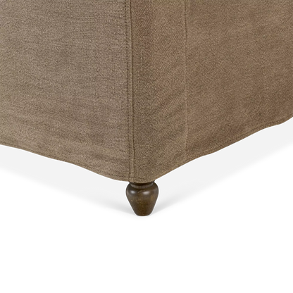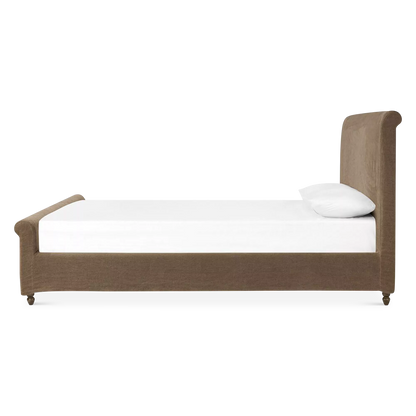 The Dalia bed updates a timeless sleigh silhouette with a relaxed, modern sensibility. Both removable and washable, its coffee-brown, linen-like slipcover brings effortless warmth and a practical touch. Turned parawood legs subtly elevate the look, balancing heritage charm with everyday ease. A design collaboration by Amber Lewis and Four Hands.