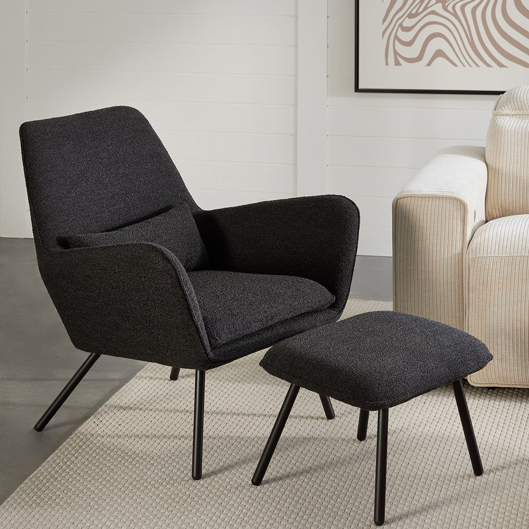 Meet Danny, an all-black armchair with matching footstool in bouclé upholstery. This duo offers a modern style with clean lines and an enveloping silhouette designed for relaxation. The ergonomic shape of the chair and ottoman ensures optimal comfort, while its bouclé fabric adds texture that’s rich and visually chic. Count on both whether you want to read a book, watch a movie or simply sit back and unwind.