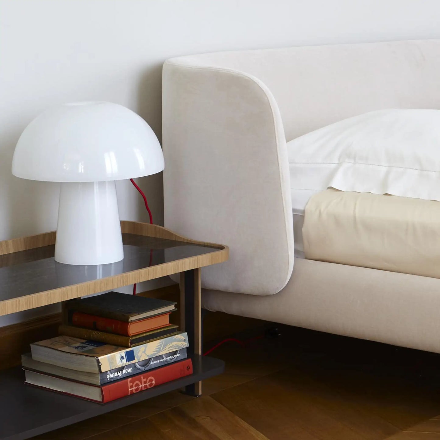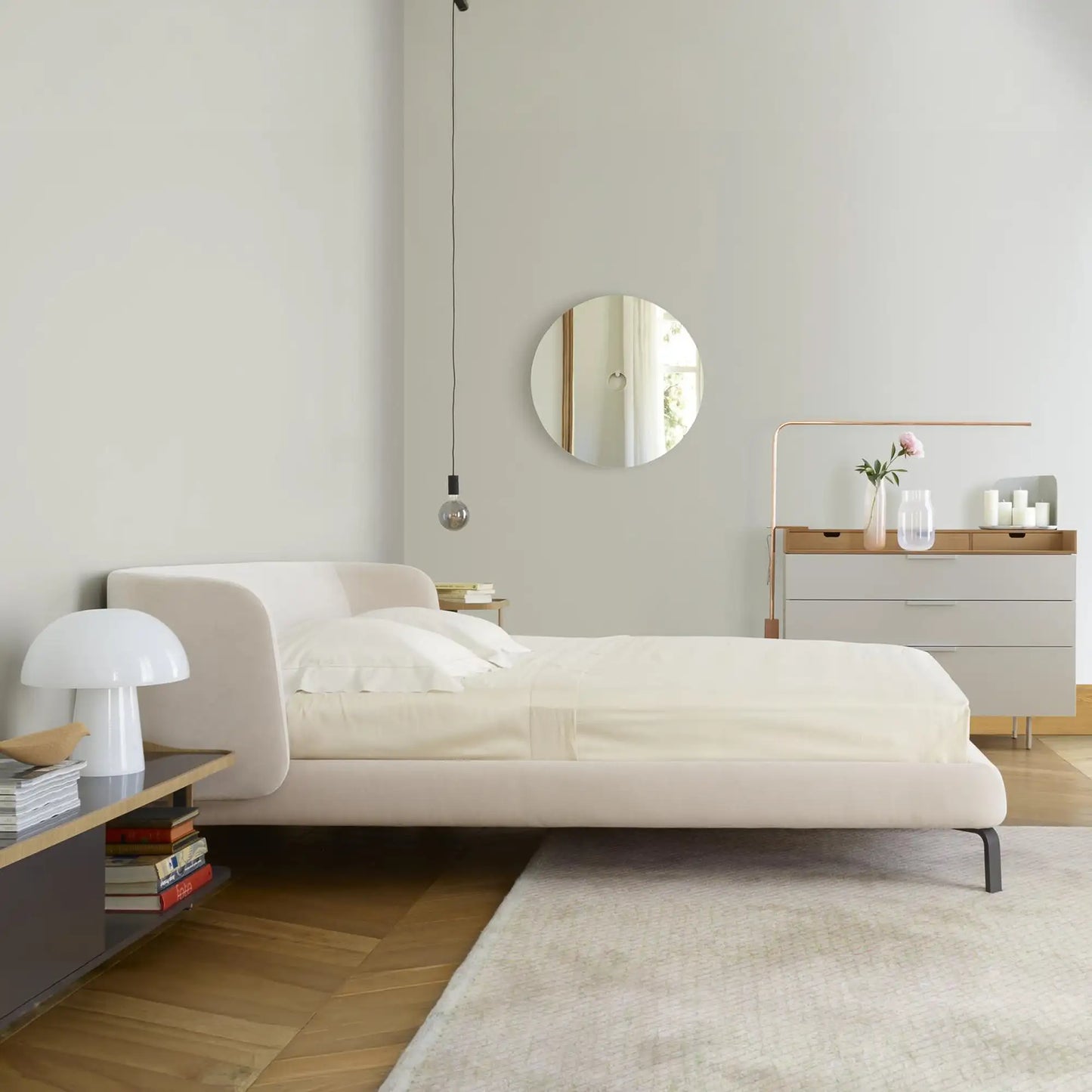 Designers Nasrallah and Hornel imagined the Desdemone bed as a cocoon that provides the ultimate escape for moments of rest. Its padded headboard and frame are arranged on a set of elegant, airy legs. A design by Ligne Roset.
