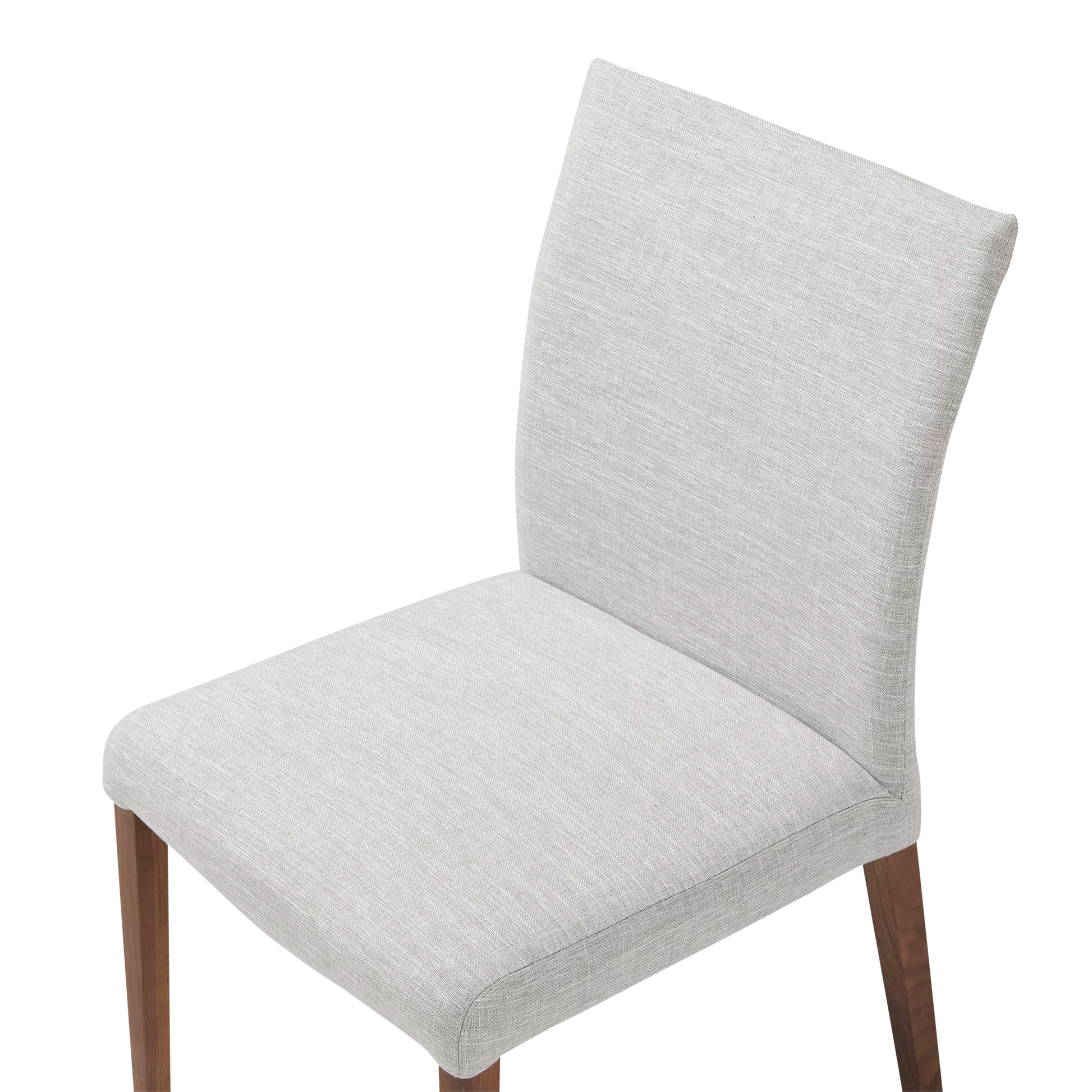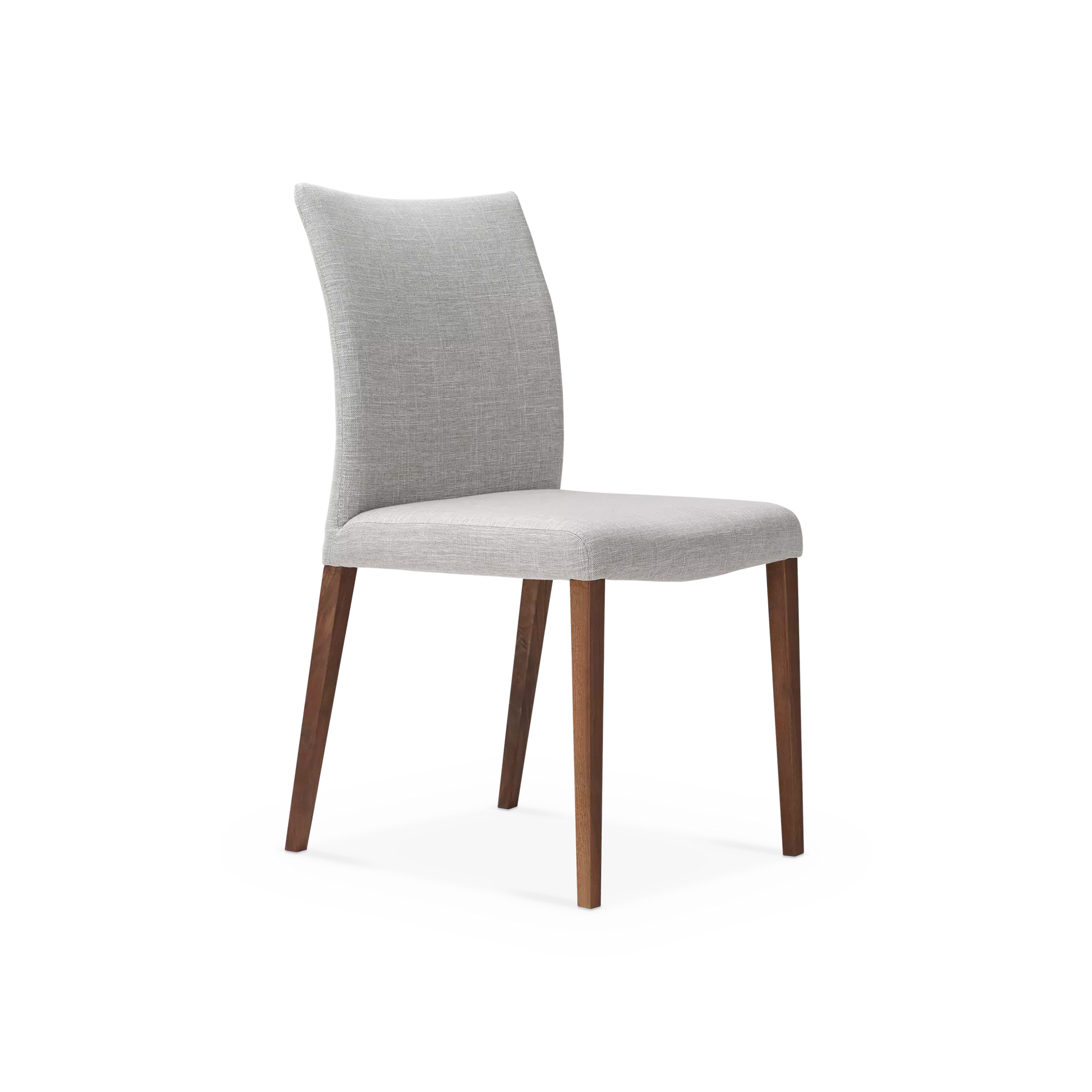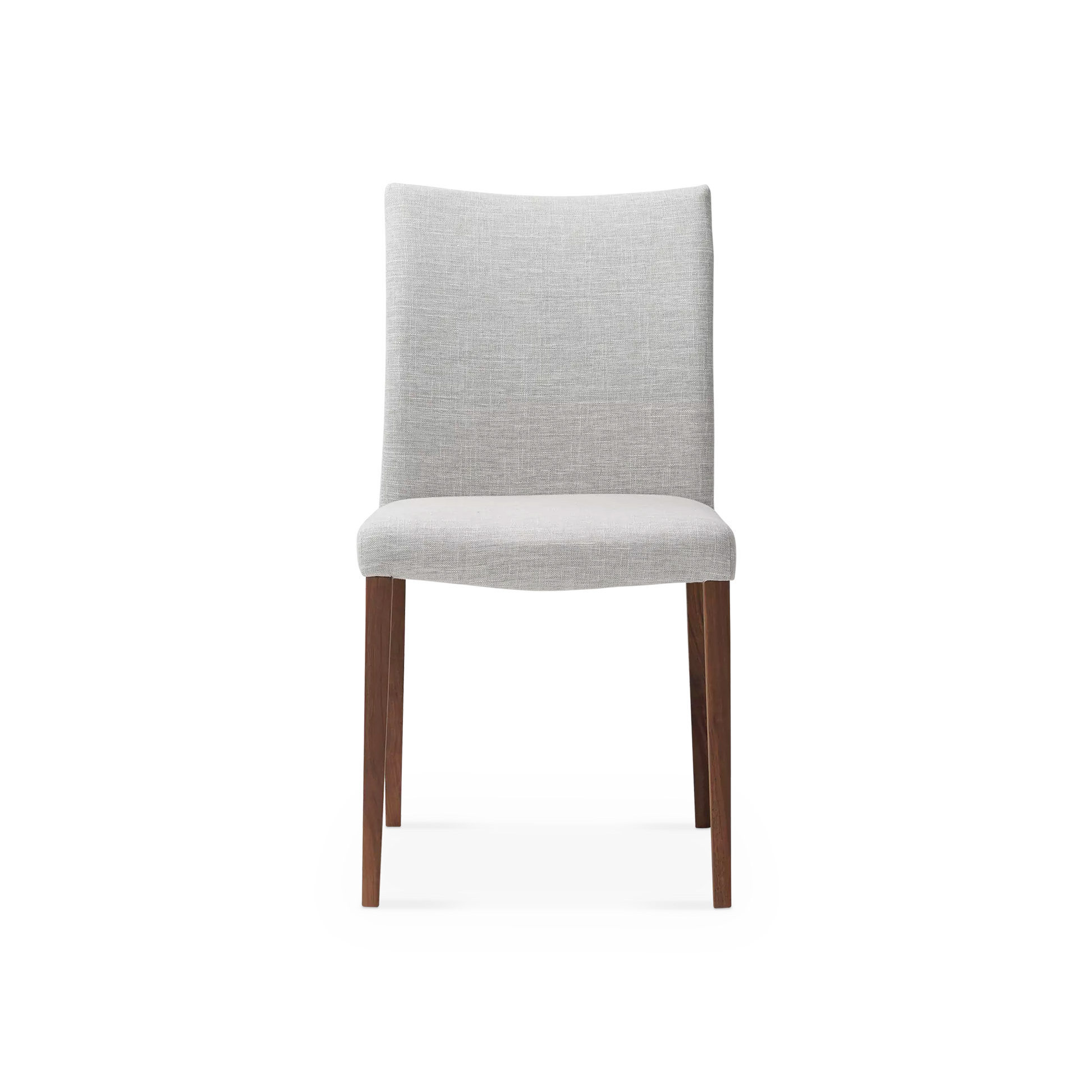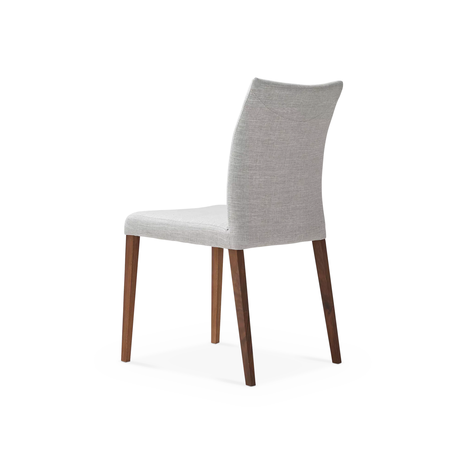 Upholstered in plush stone-coloured chenille fabric, it features smoked walnut tapered legs. The Dali chair comes with a modern-style low backrest that hugs the posture, elegantly curved all the way down to its base.