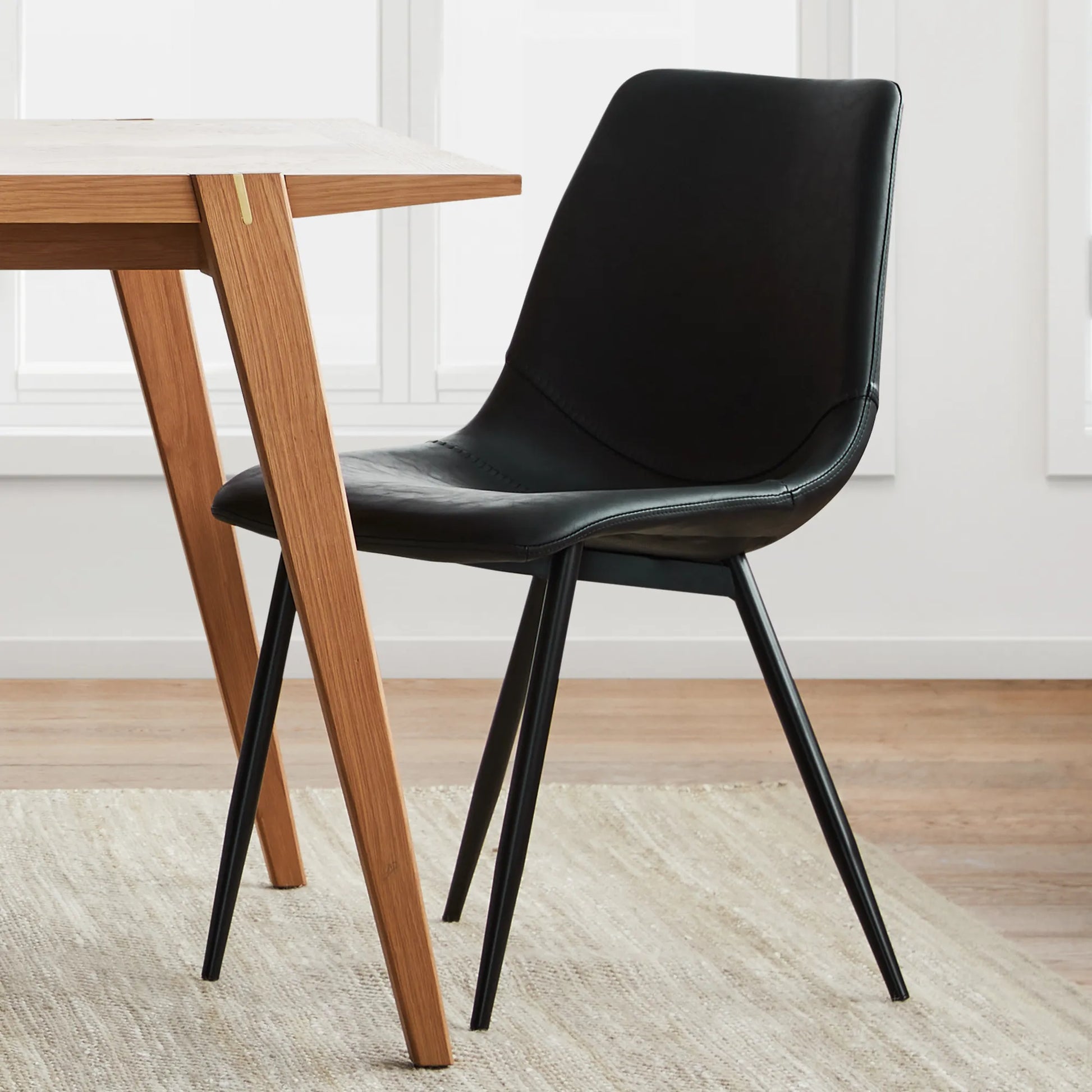 Design: Streamlined silhouette with slim black metal legs and decorative topstitching that highlights its soft, curved seat.