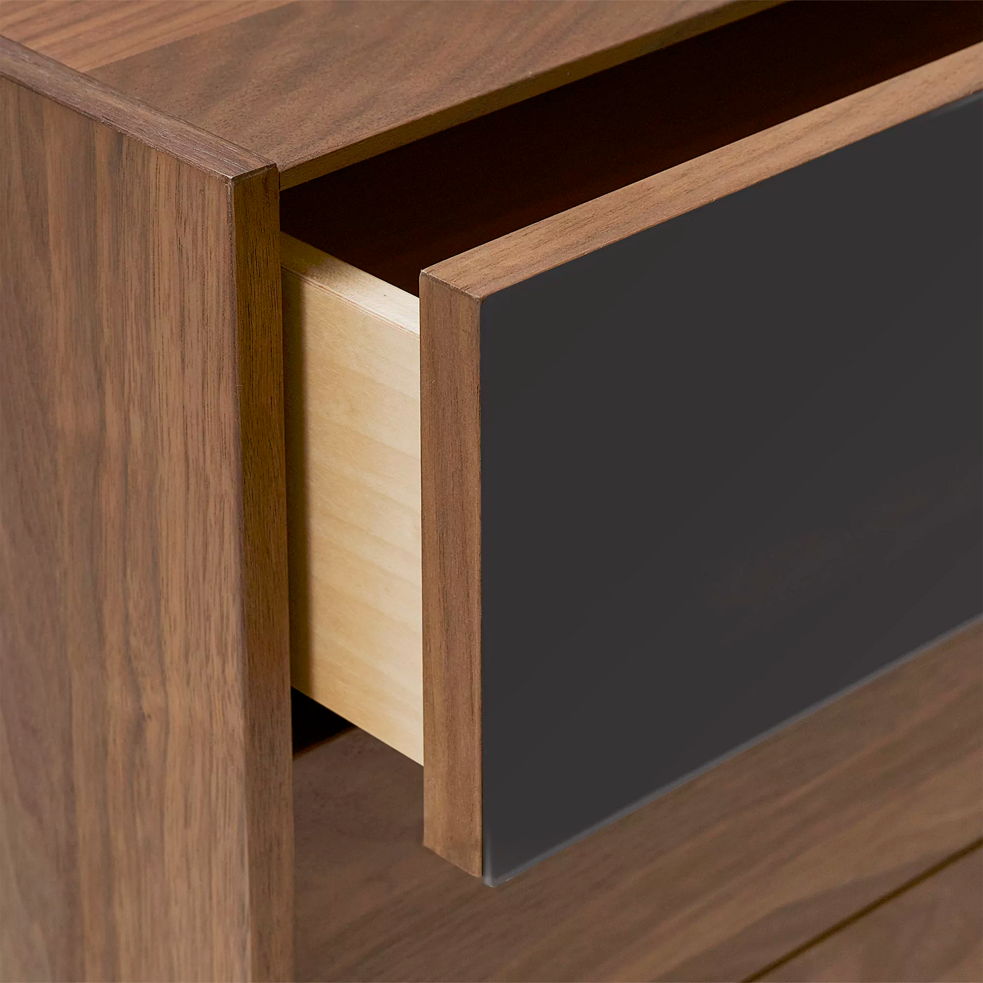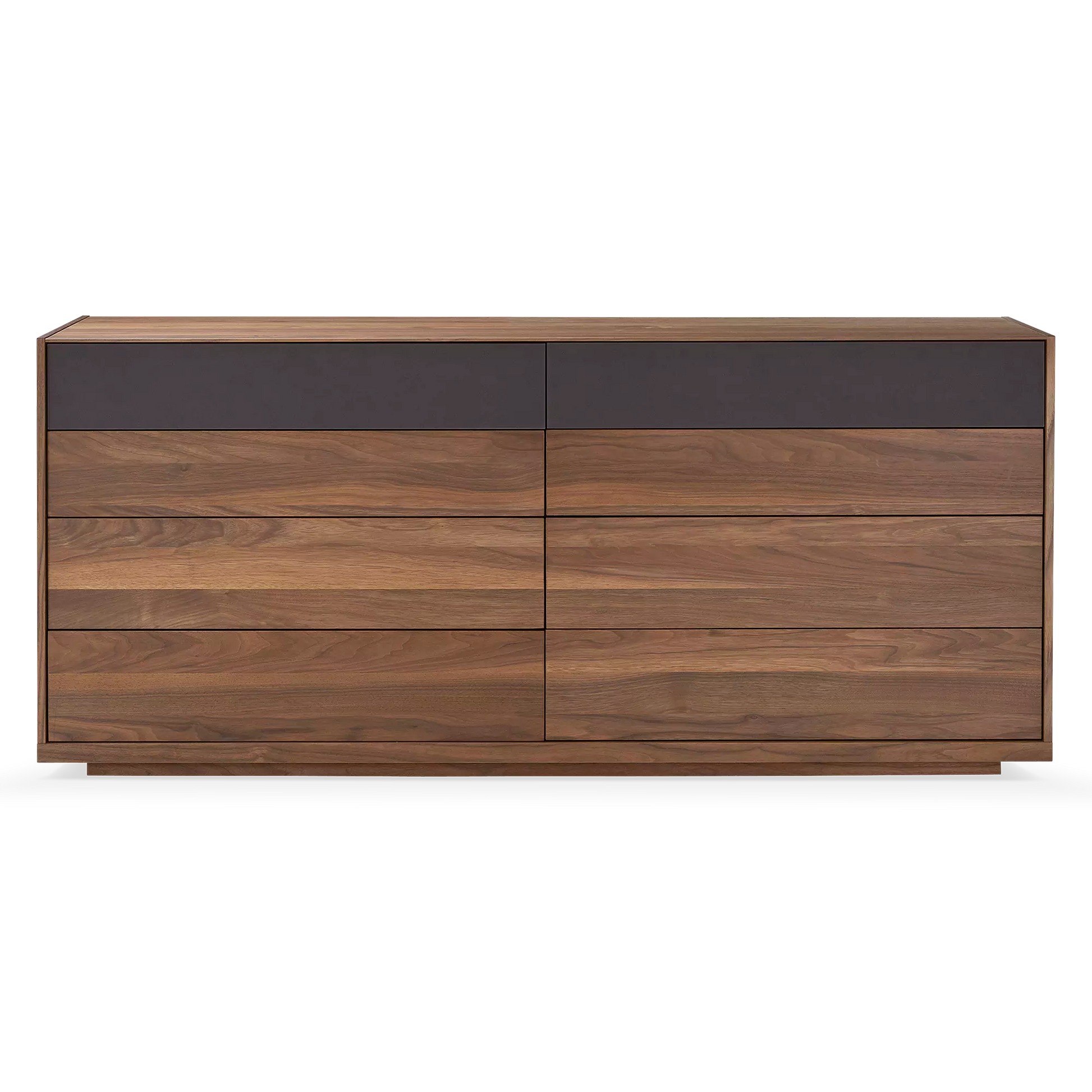 Made in Canada, the Mimosa wooden dresser has drawers that open and close with a single push. Its facade features a combination of 8 drawers, with two on top in black glass.