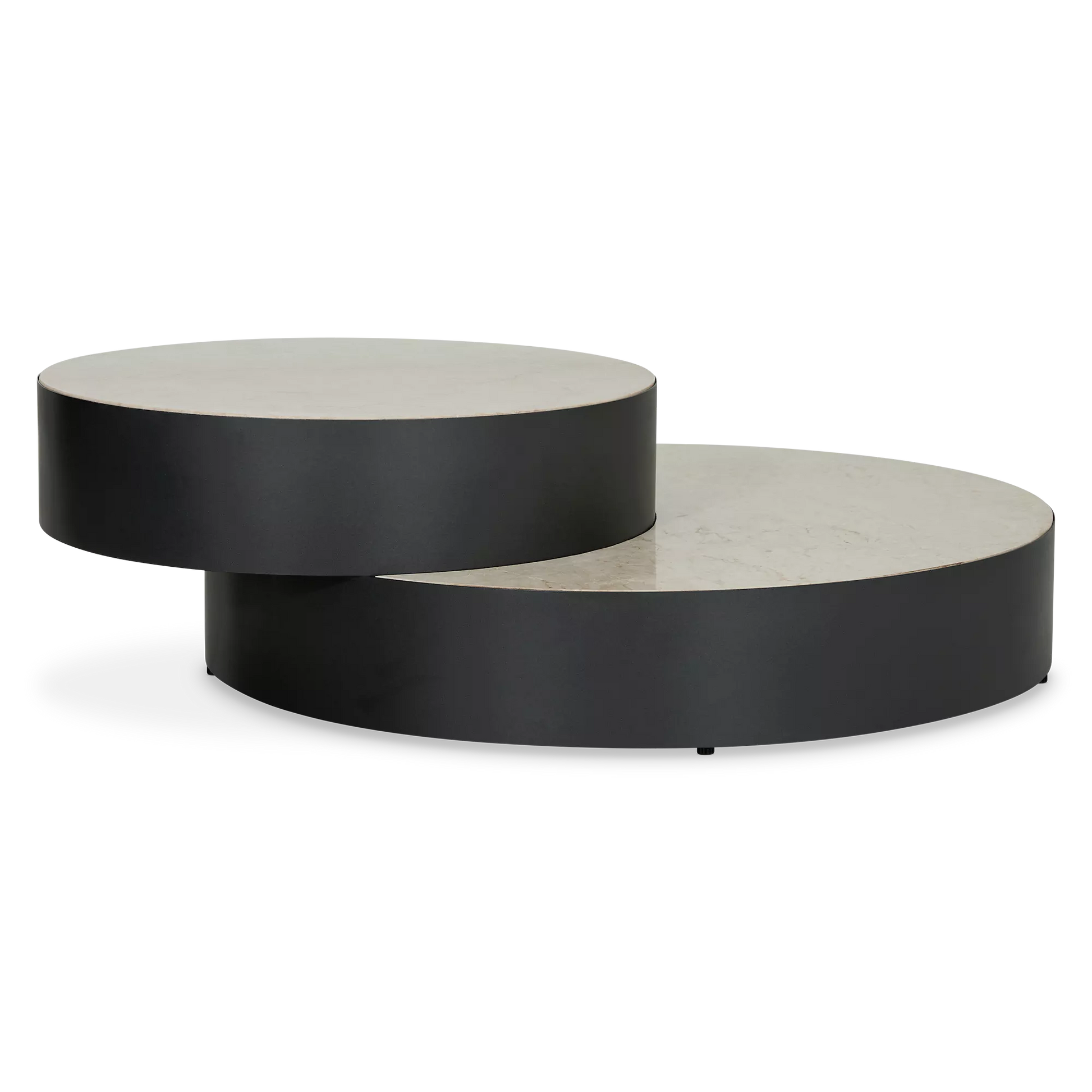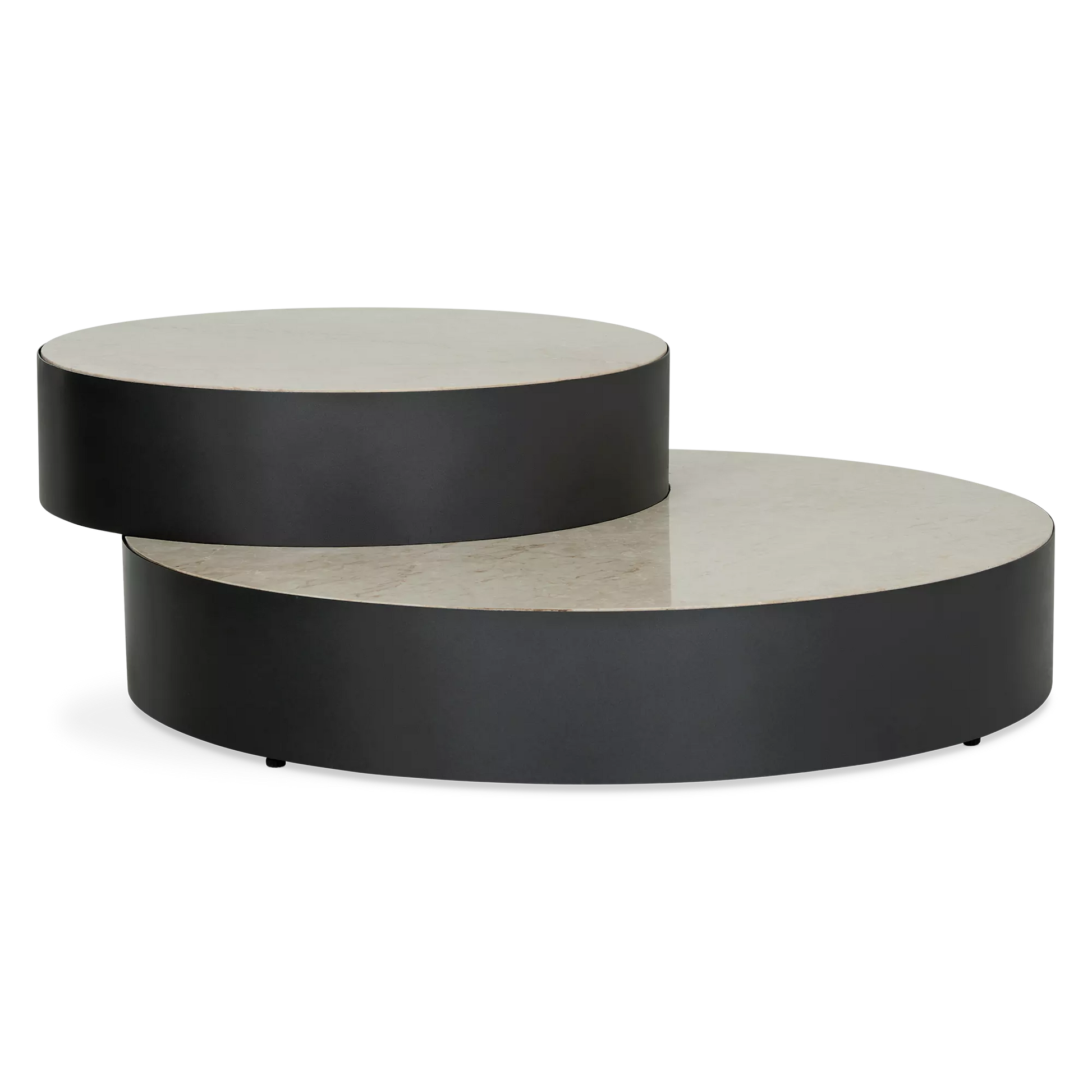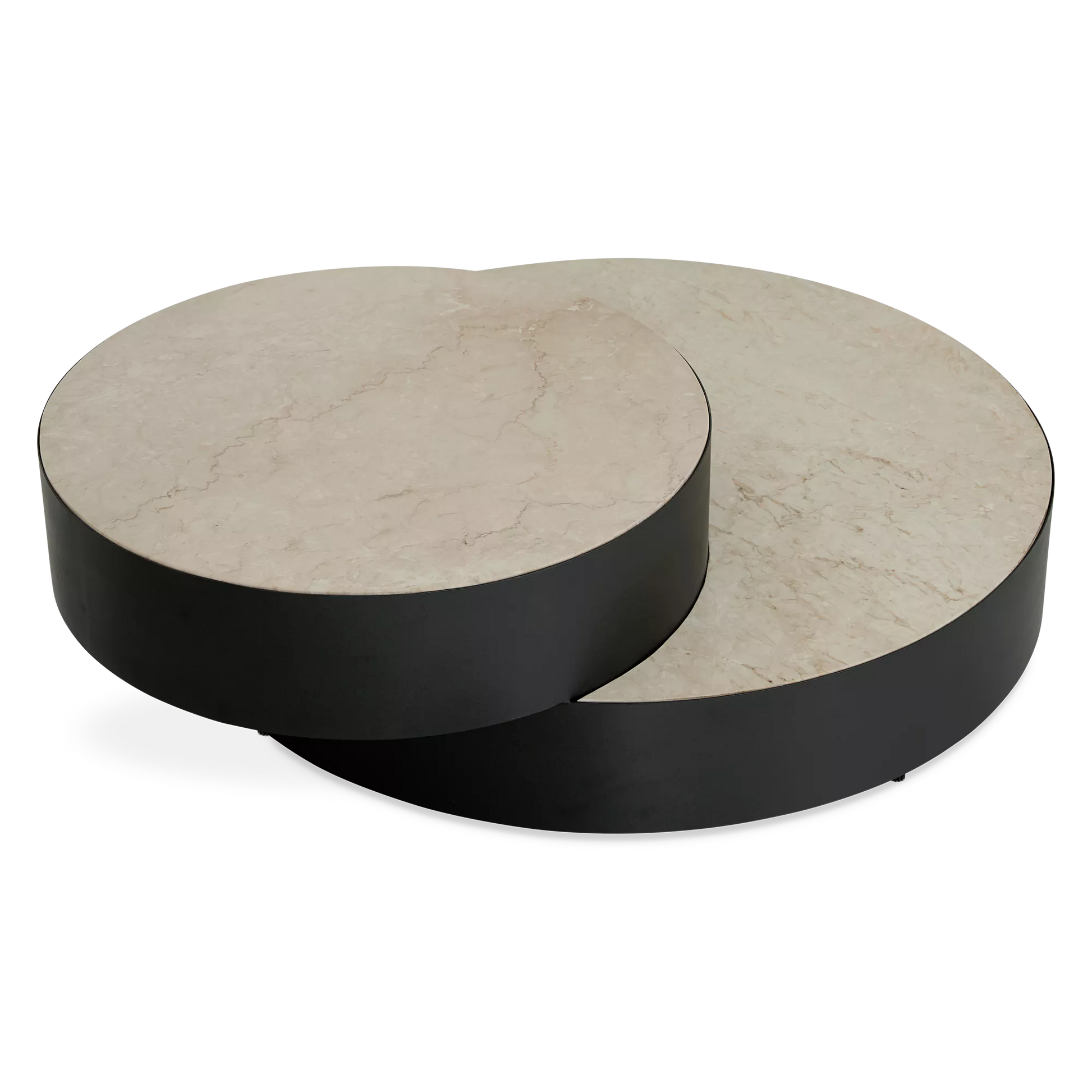 Spectacular without being over the top, the Dva coffee table boasts a sleek, sculptural look. Its two travertine-effect tops, set in a black frame, overlap slightly to create a sloped effect that will bring a modern and unique touch to any living room.