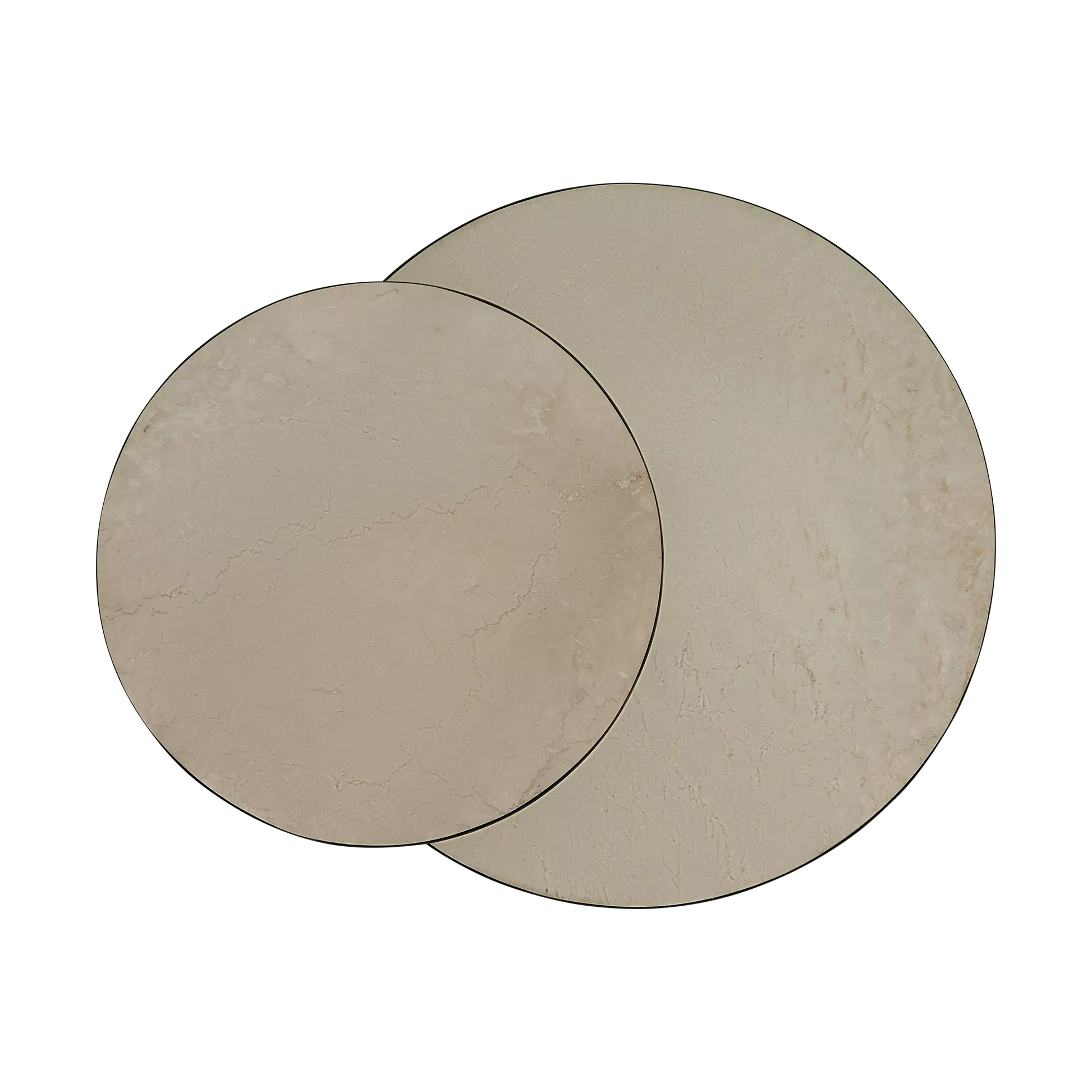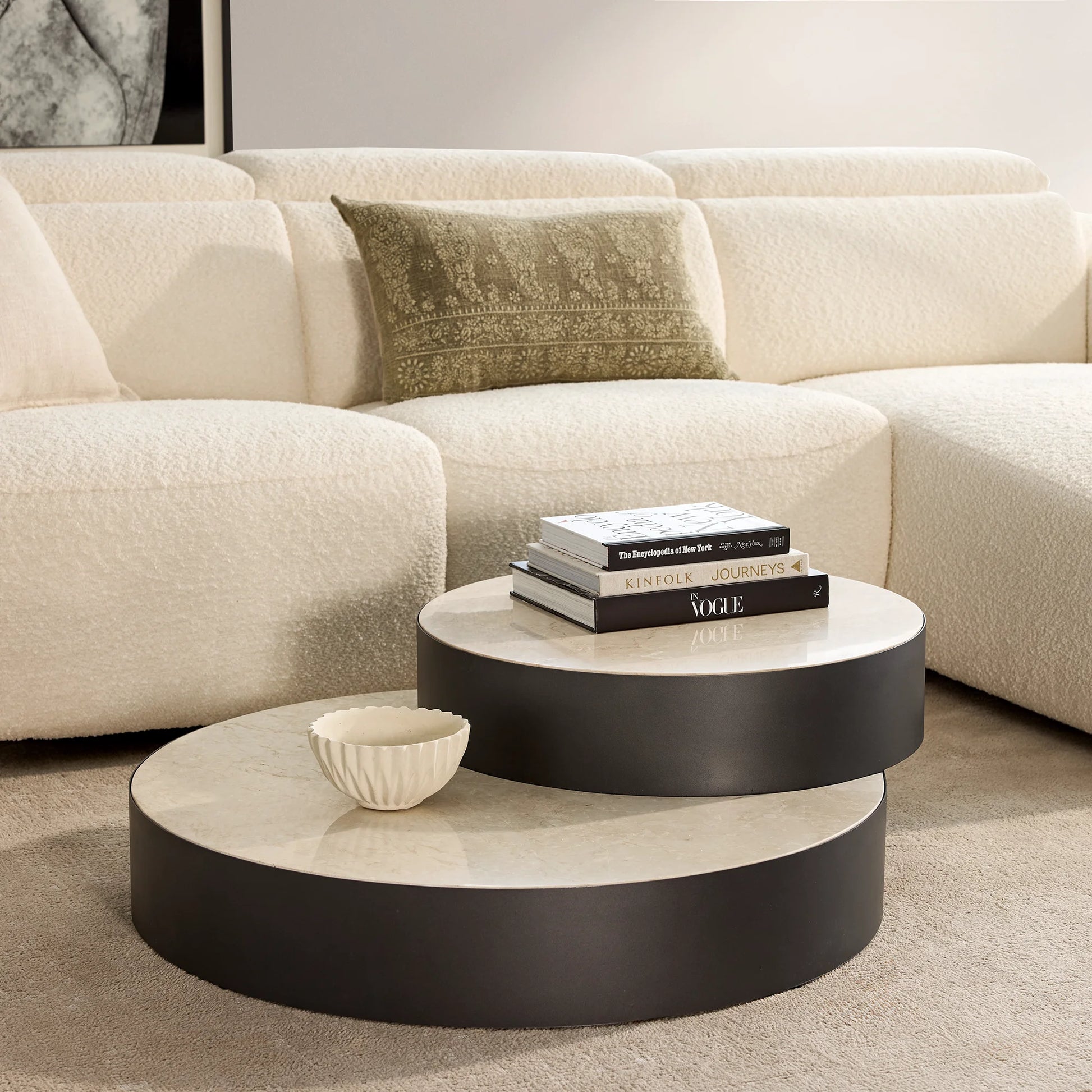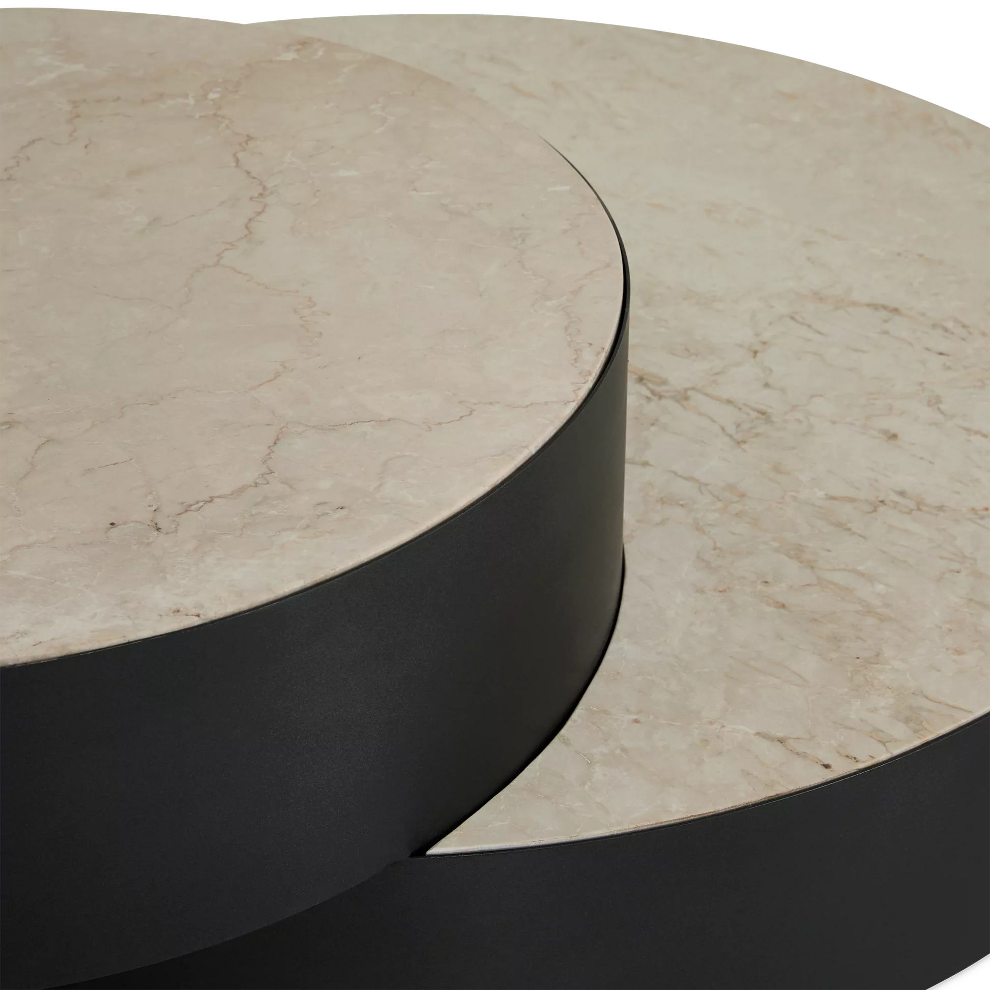 Spectacular without being over the top, the Dva coffee table boasts a sleek, sculptural look. Its two travertine-effect tops, set in a black frame, overlap slightly to create a sloped effect that will bring a modern and unique touch to any living room.