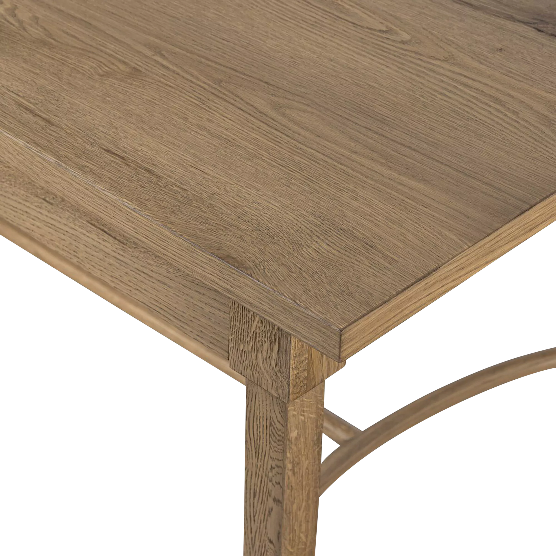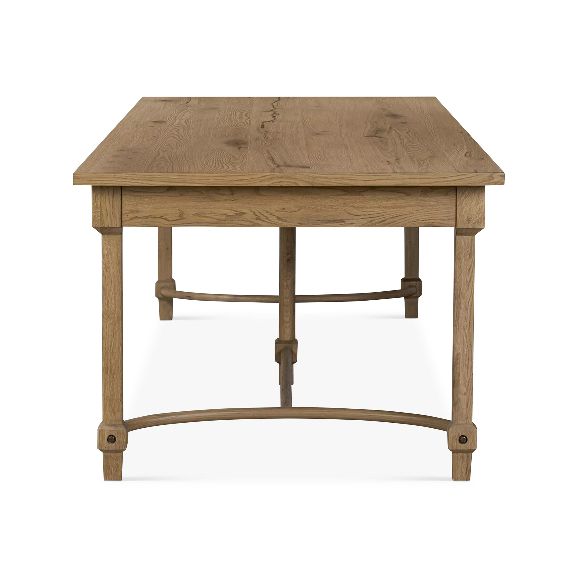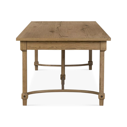 The Edison dining table unites grandeur and time-worn charm. Crafted from worn oak, its generous scale is balanced by subtle detailing and a quietly commanding presence. Naturally occurring cracks and visible graining highlight the character of the wood, lending an antique-inspired feel with a lived-in sensibility. Thoughtfully shaped legs and curved stretchers finish the look with structural elegance. A design collaboration by Amber Lewis and Four Hands.