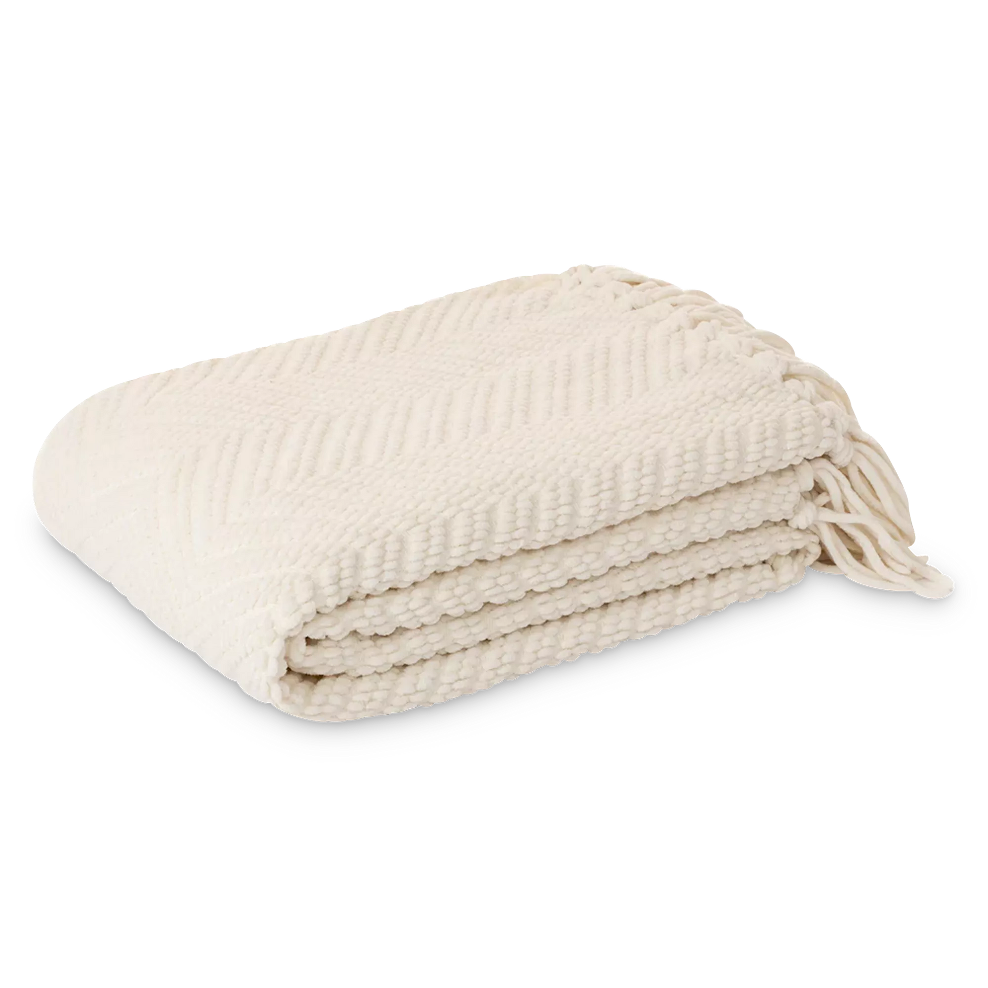 This ivory chenille throw with a chevron pattern and delicate fringes brings softness and style to any space. Perfect for cozy moments and easy to care for, it’s machine washable, combining comfort, elegance, and practicality.
