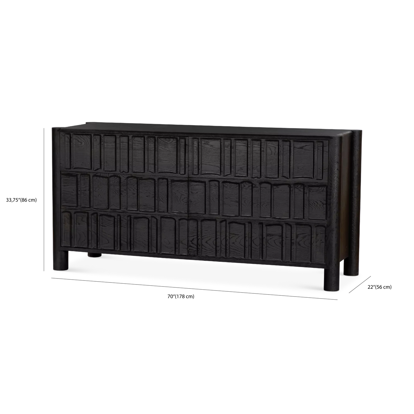 The Ezri dresser by Four Hands, in solid black or brown oak, is a statement piece featuring organic patterns and cylindrical legs that run from top to floor to create a primitive look. Natural variations in the wood grain add unique character to each piece.