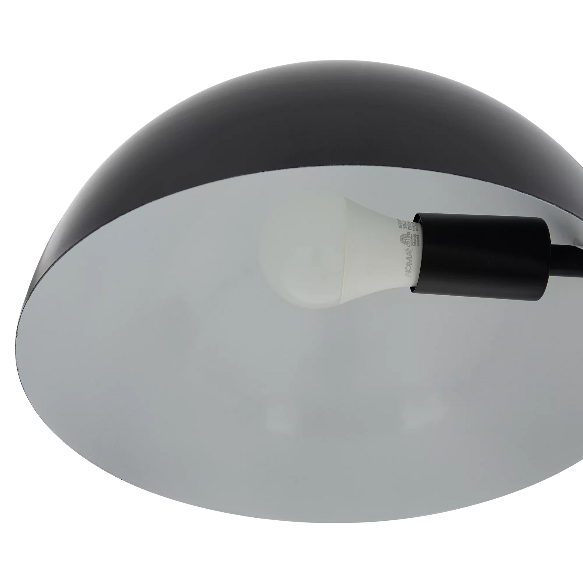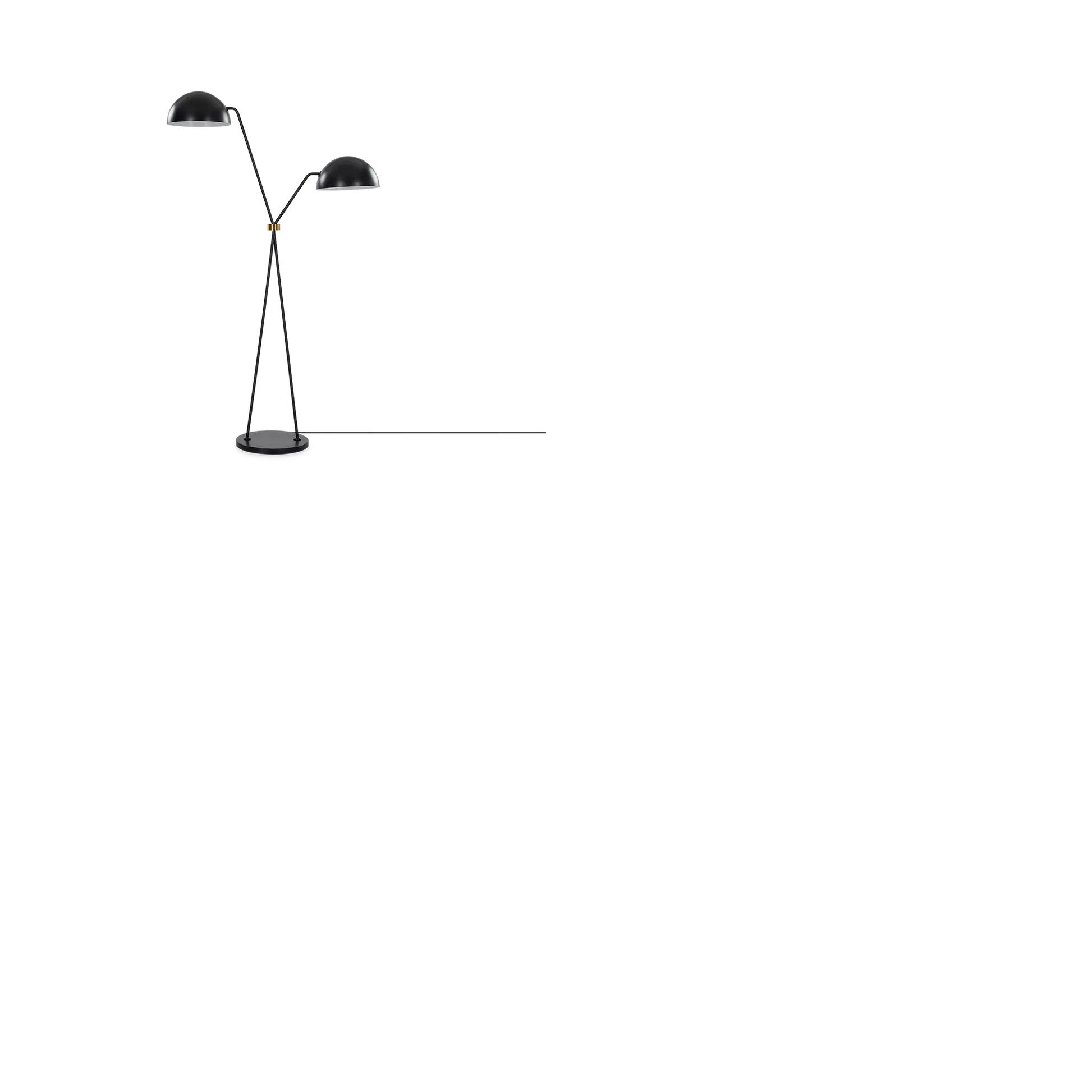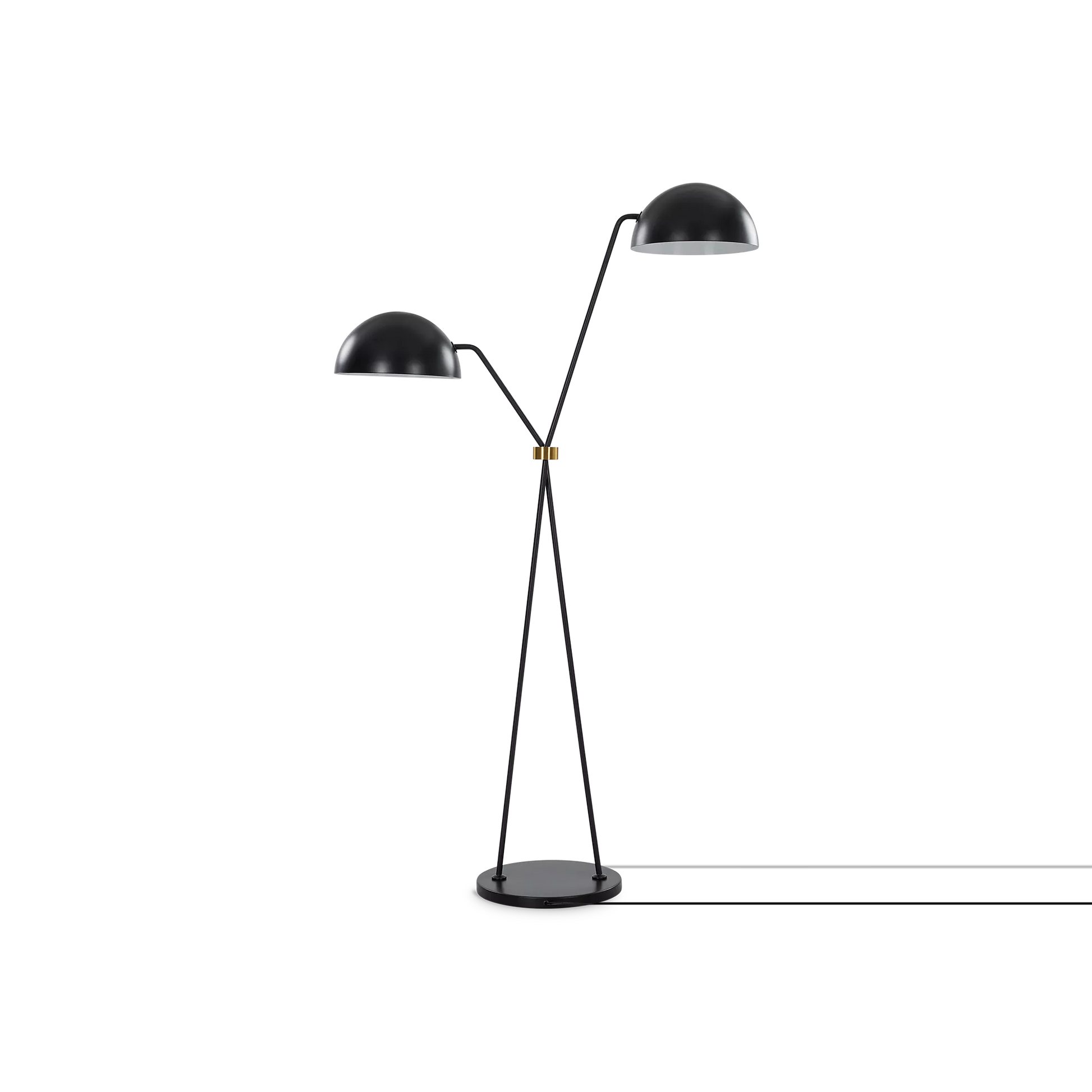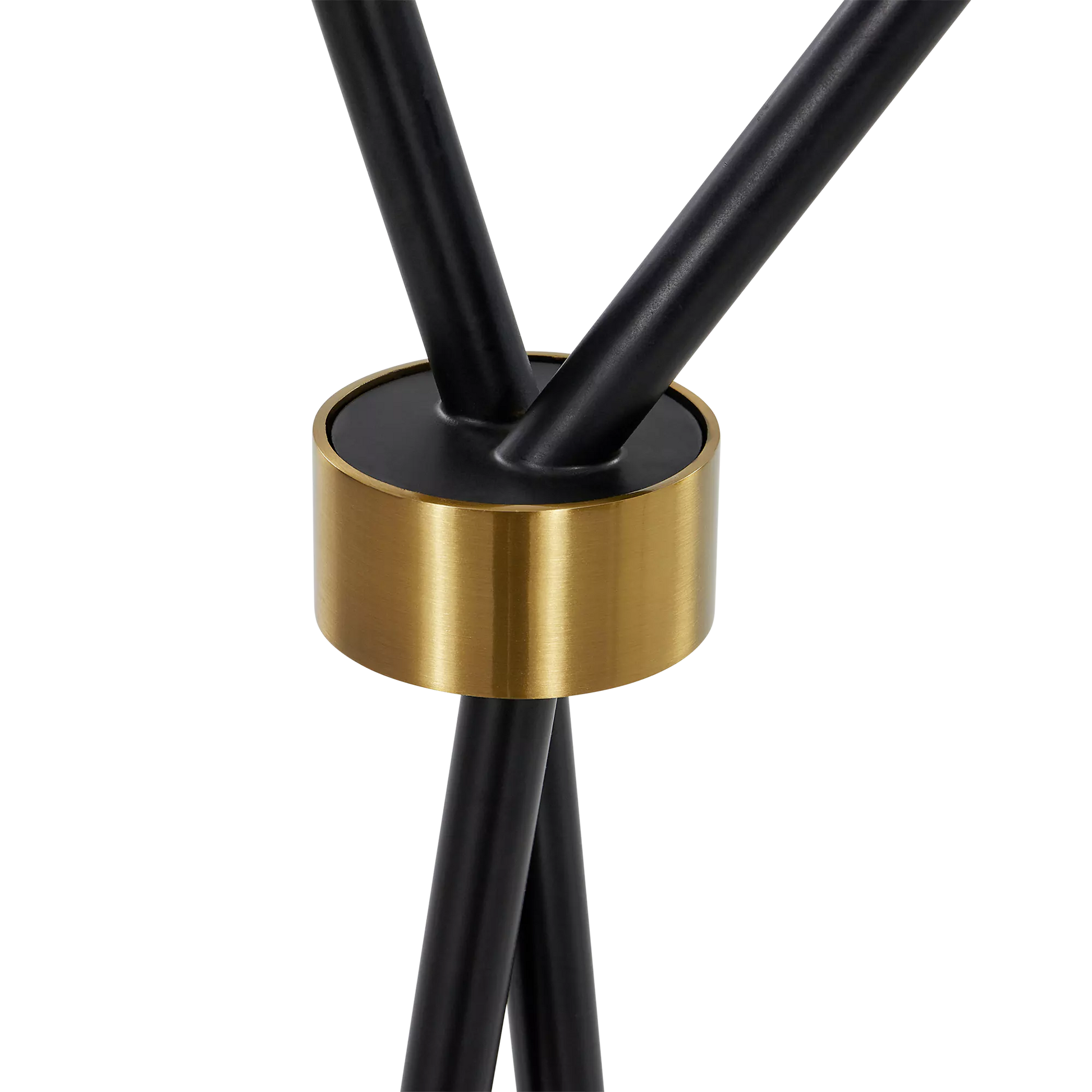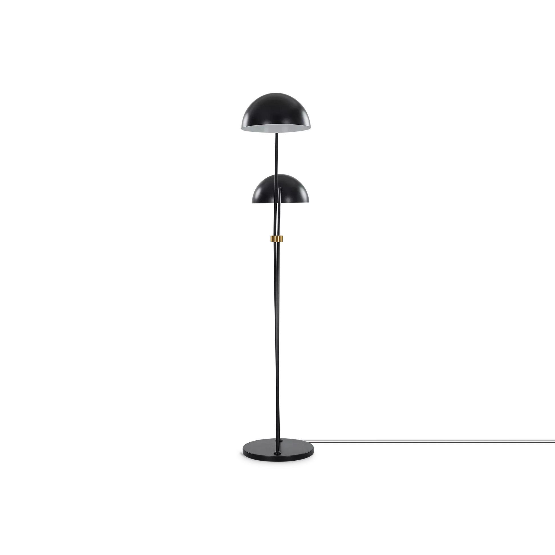 The Faven lamp features an eclectic look with its unique mix of materials and shapes. It stands out with retro-style, dome-shaped lampshades at different heights, industrial-chic metal poles and base, and a striking brass iron ring at centre that creates an intriguing contrast.