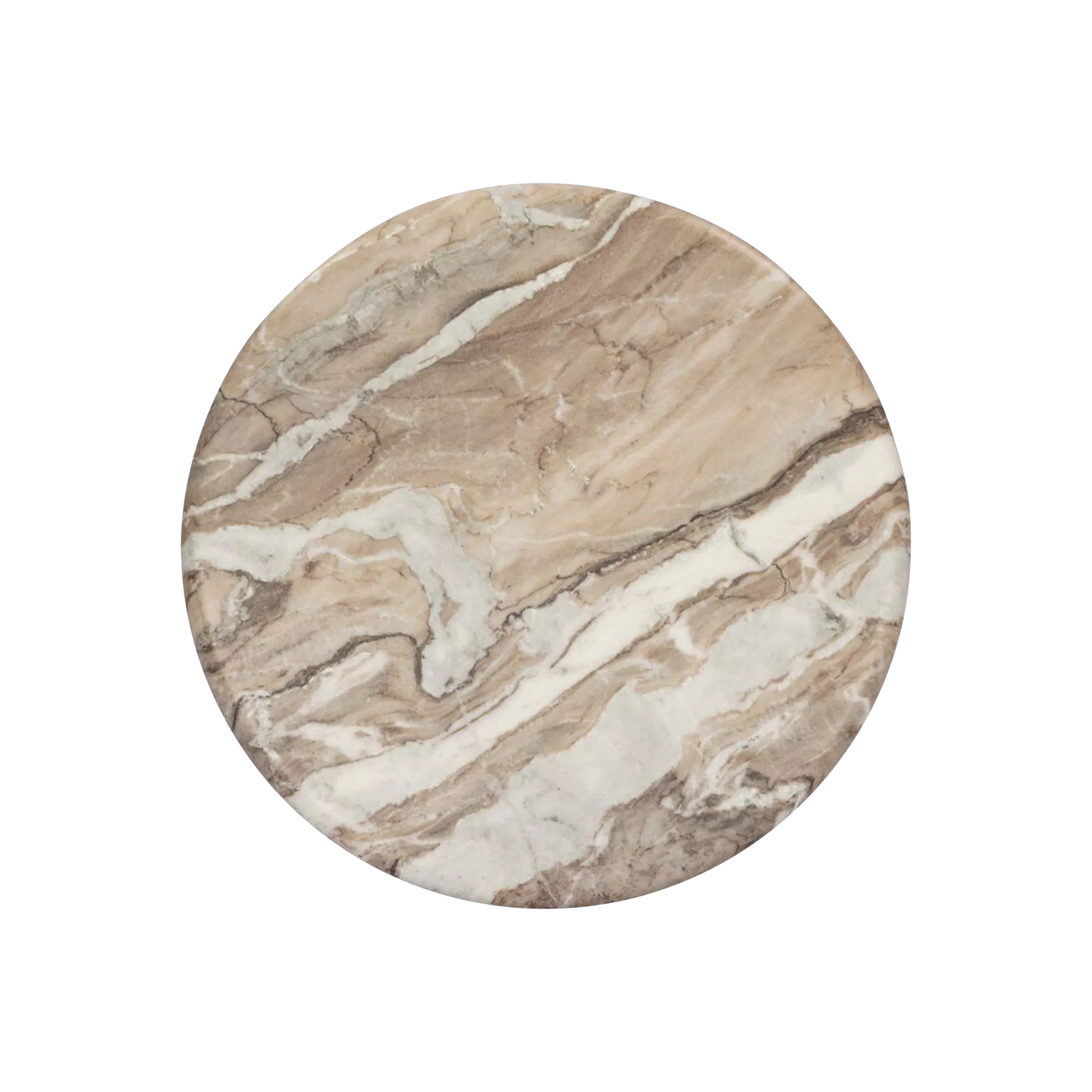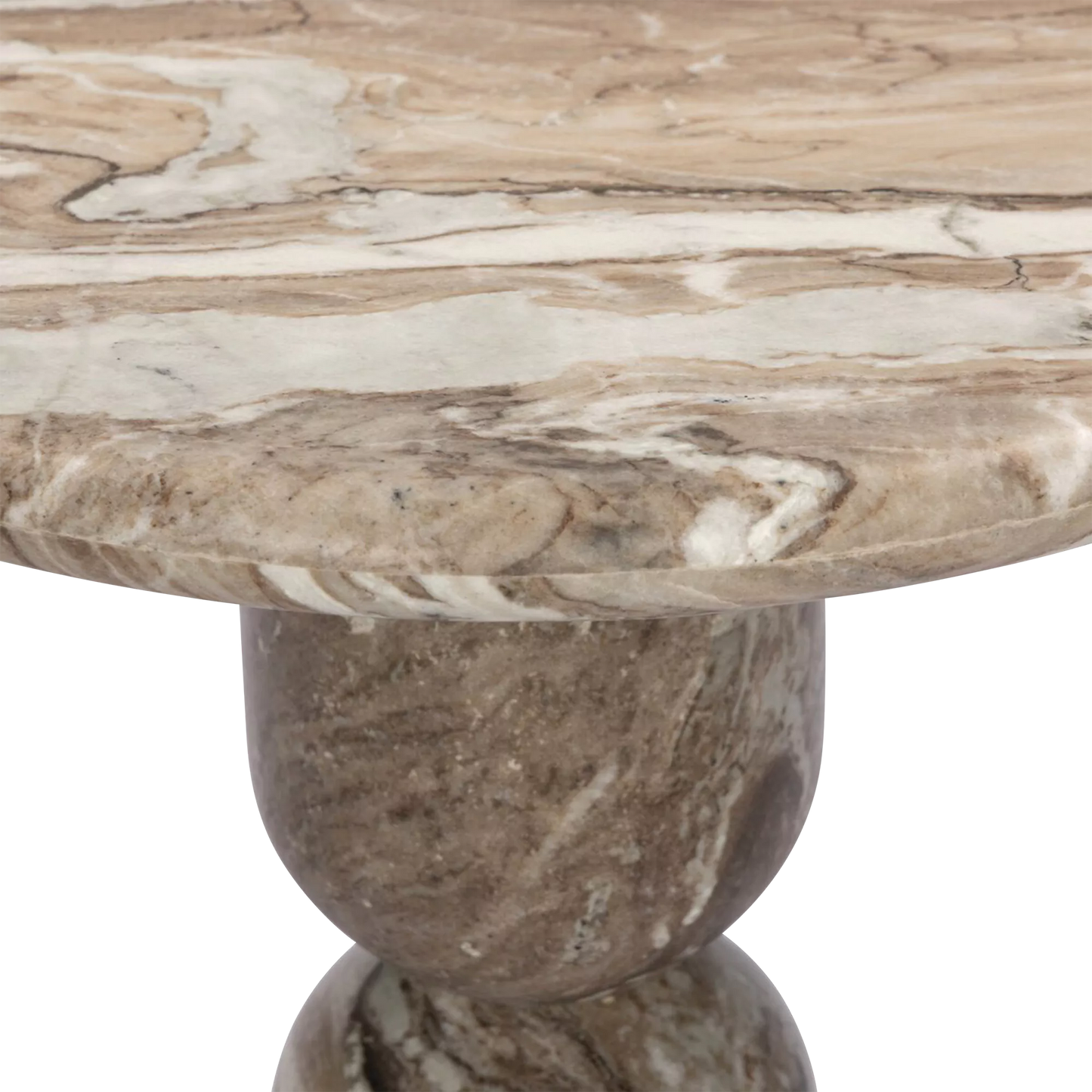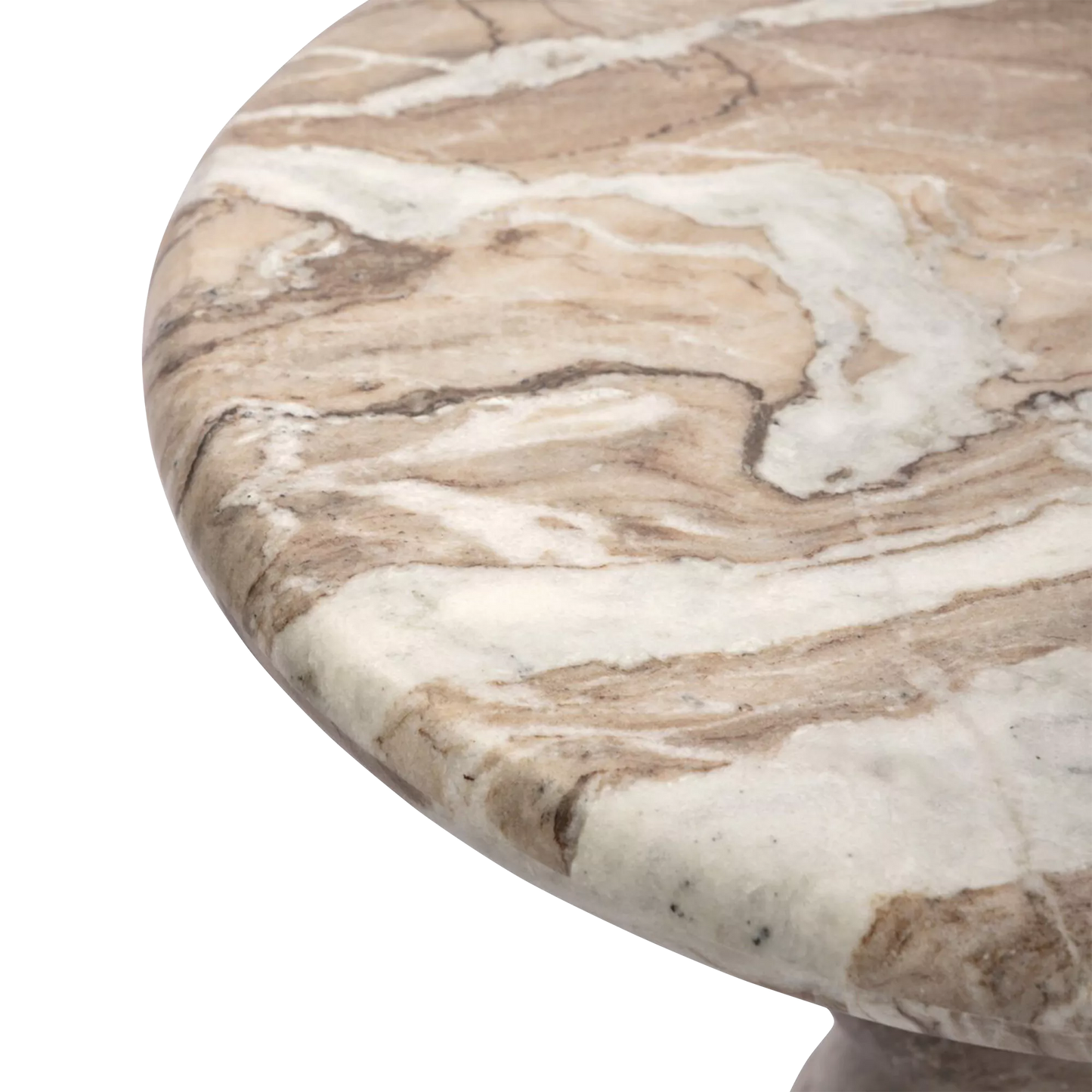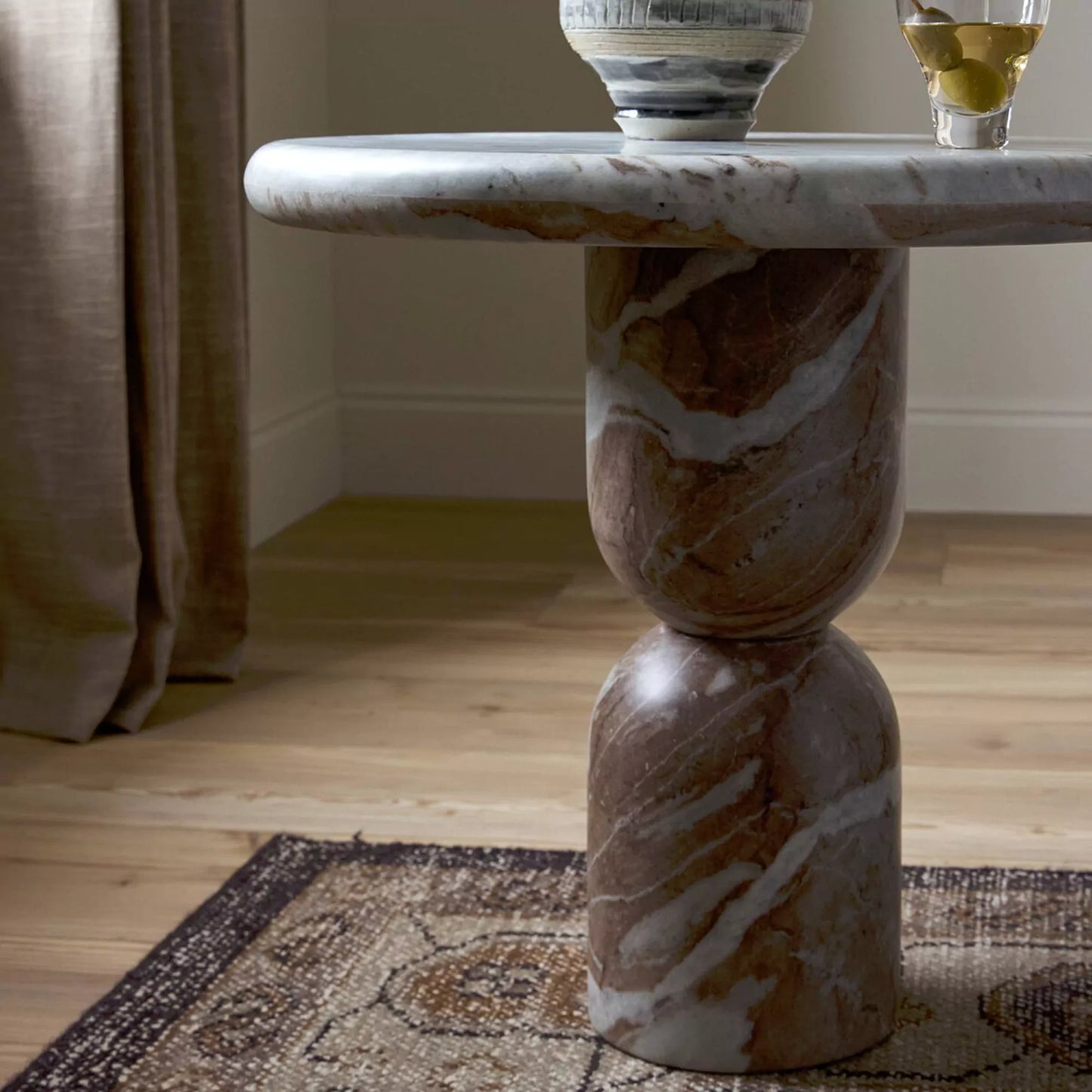 The Figueroa side table pairs clean geometry with the rich character of solid Sawar marble. Its sculptural silhouette is shaped by soft, continuous curves, allowing the natural veining and warm light-brown tones to take centre stage. Each piece highlights the organic variation of the stone, bringing subtle movement and refined presence to any space. A design collaboration by Amber Lewis and Four Hands.