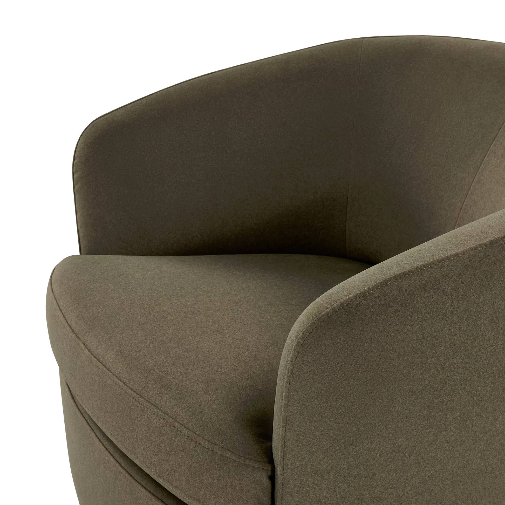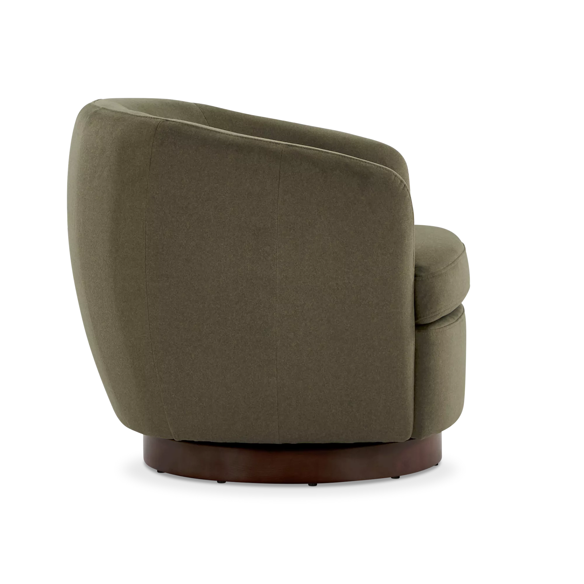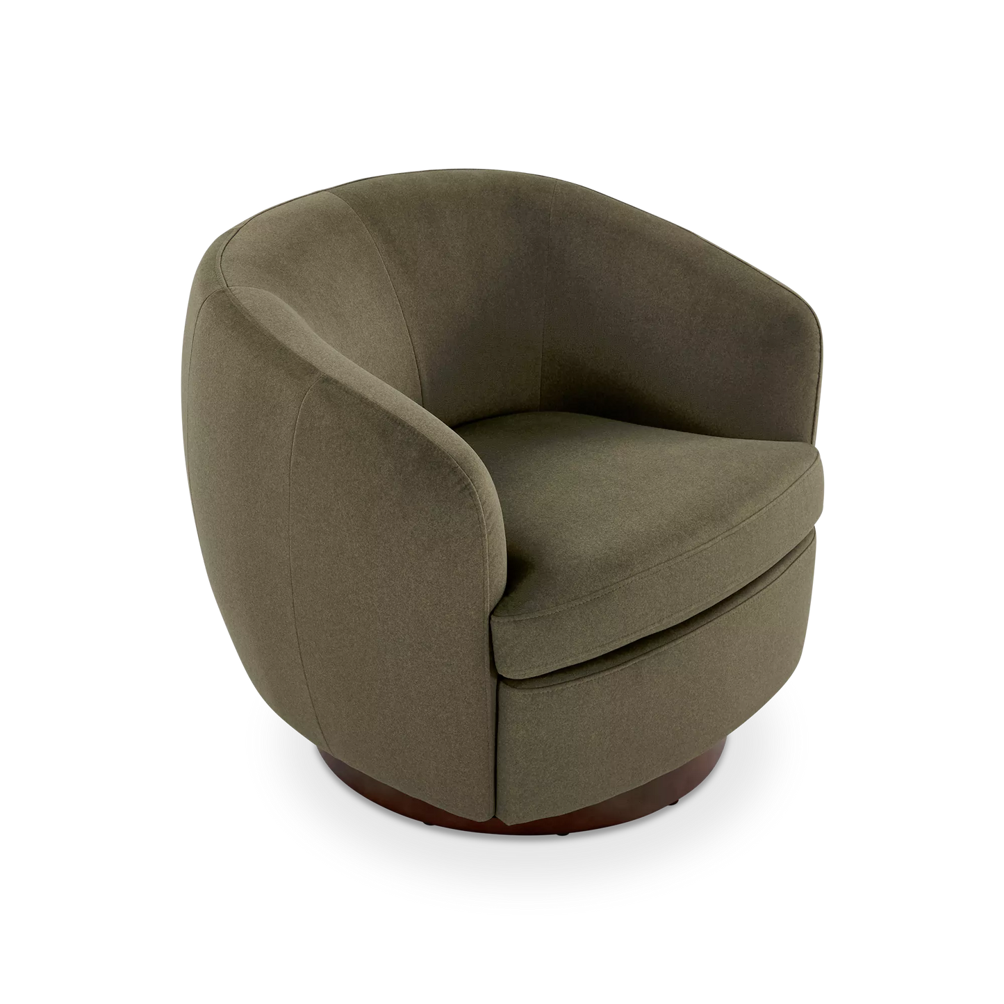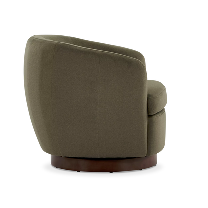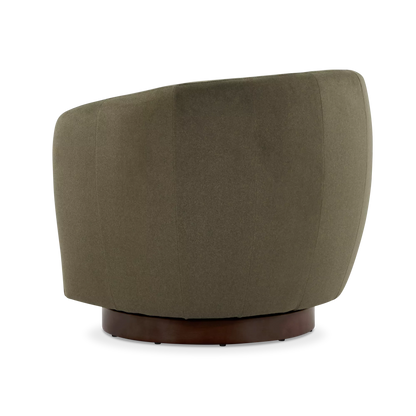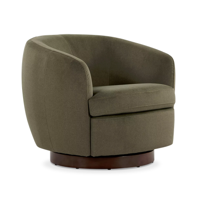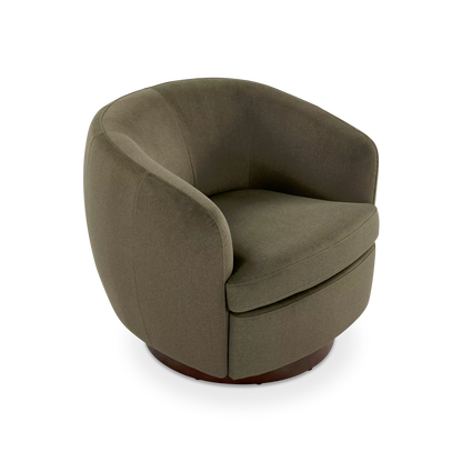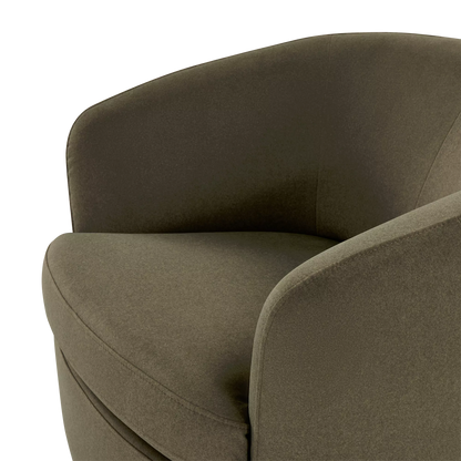 The Flora armchair outlines an enveloping form with soft lines, where the textile material dialogues with a dark wooden base. Its design prioritizes the balance between visual comfort and functionality, notably through its swivel mechanism that integrates modernity into daily use.