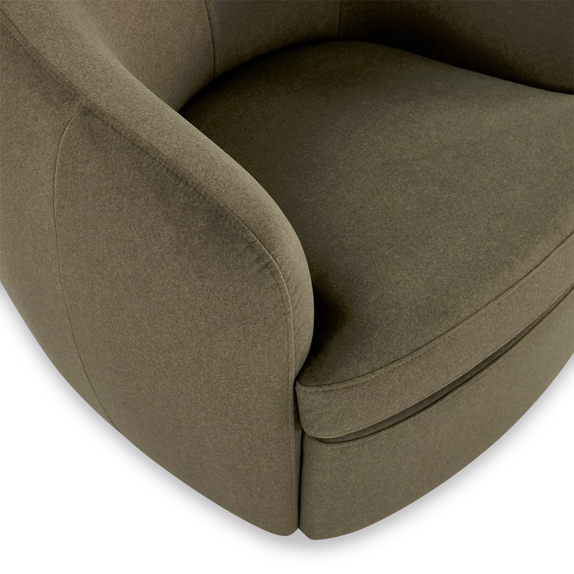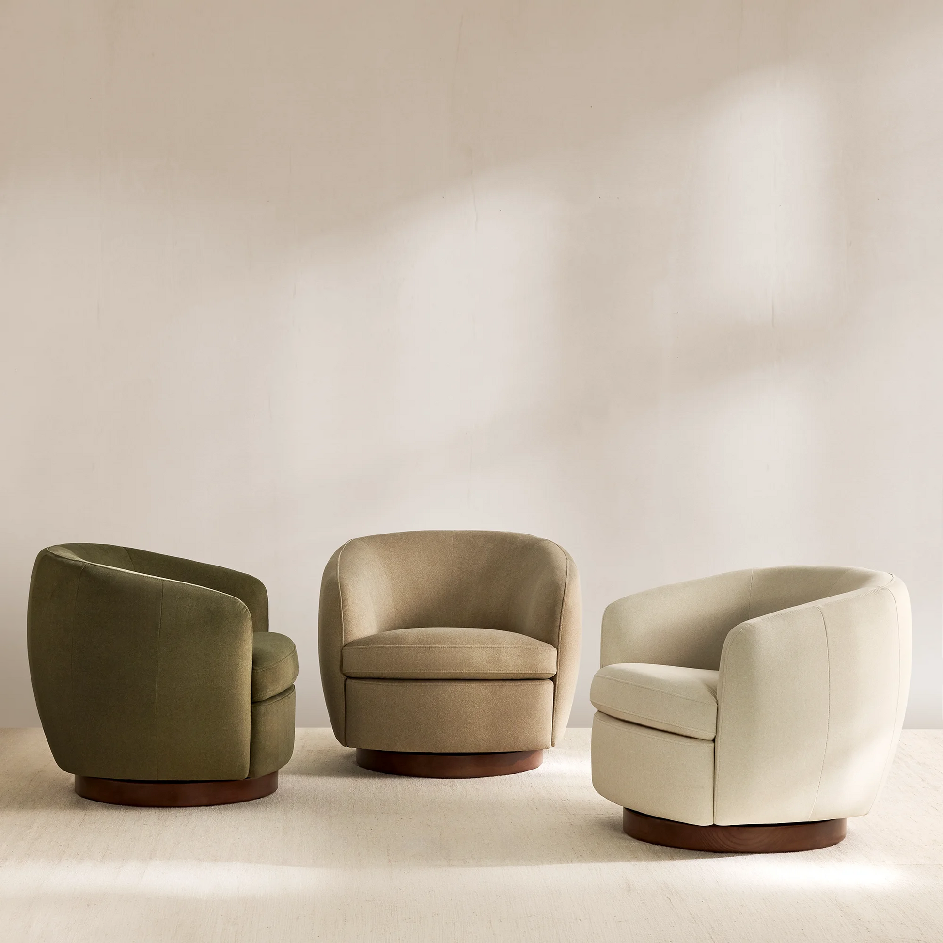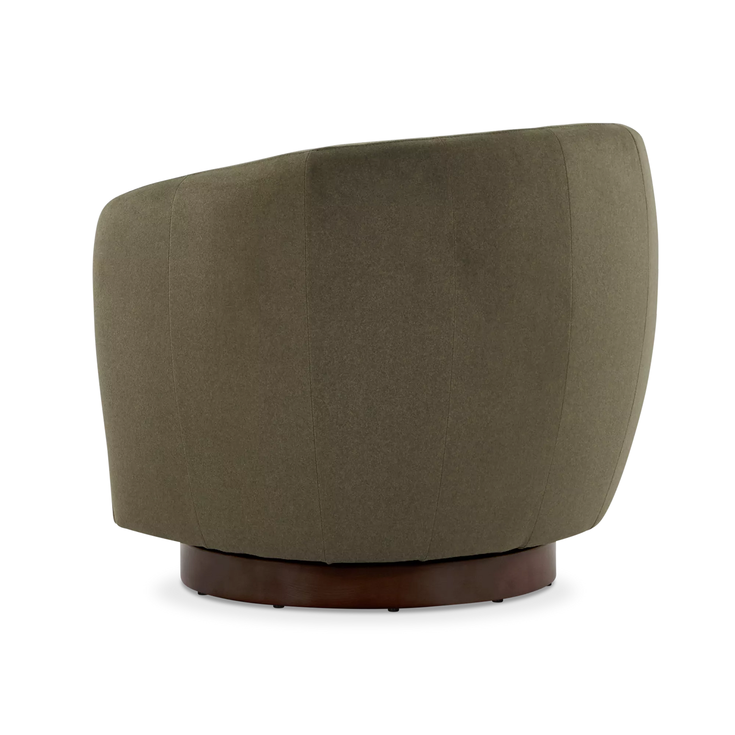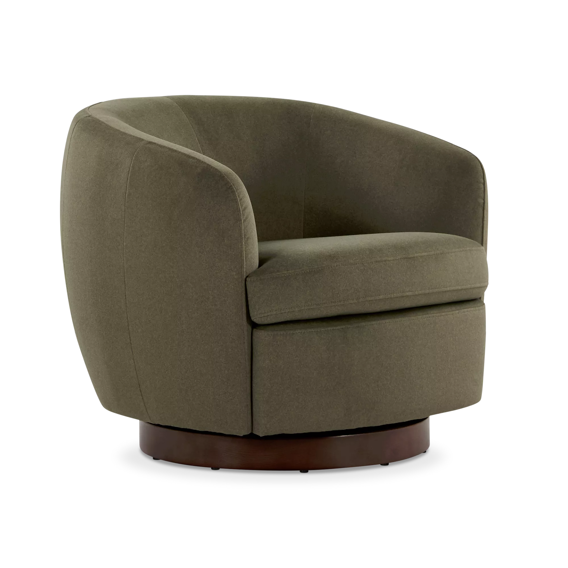 The Flora armchair outlines an enveloping form with soft lines, where the textile material dialogues with a dark wooden base. Its design prioritizes the balance between visual comfort and functionality, notably through its swivel mechanism that integrates modernity into daily use.