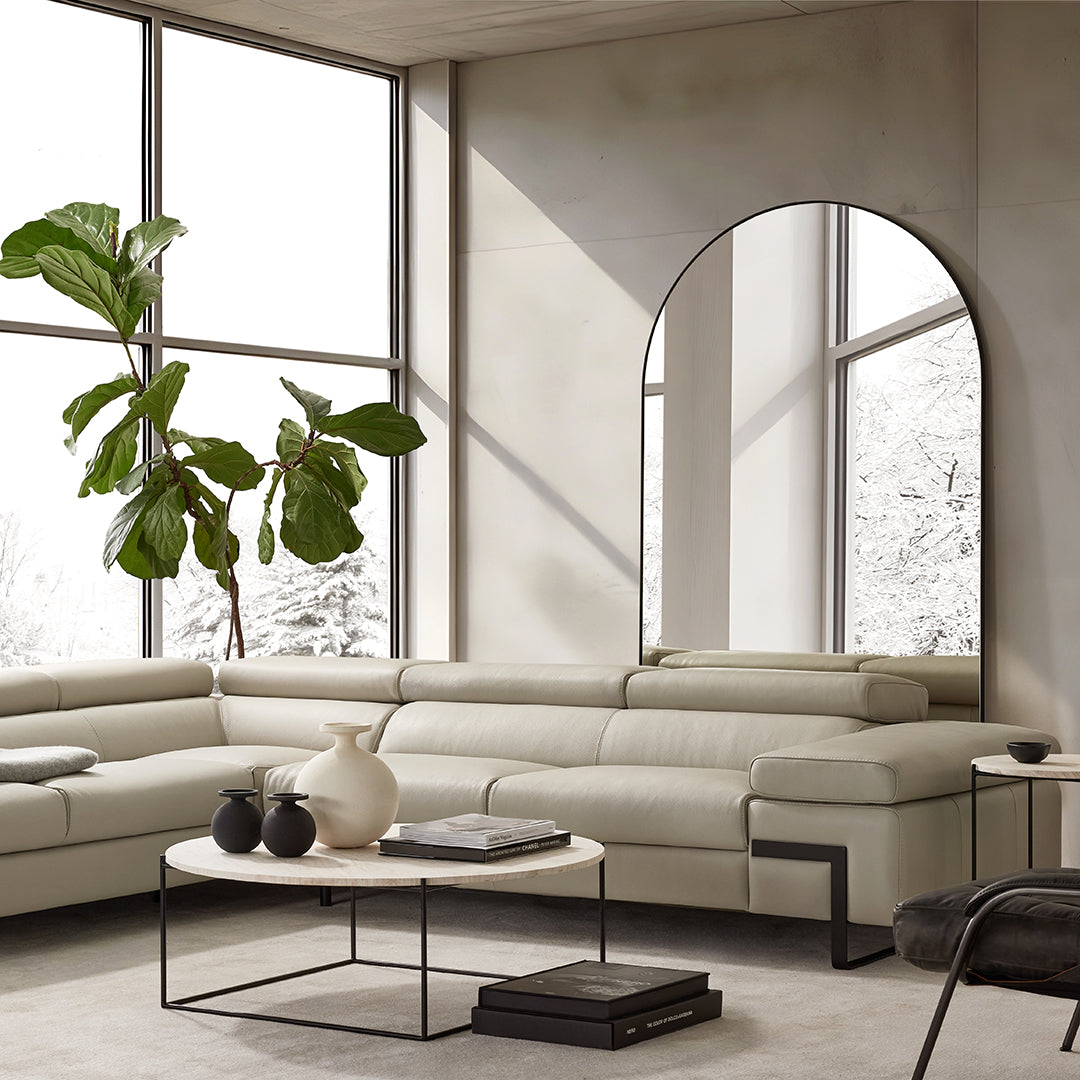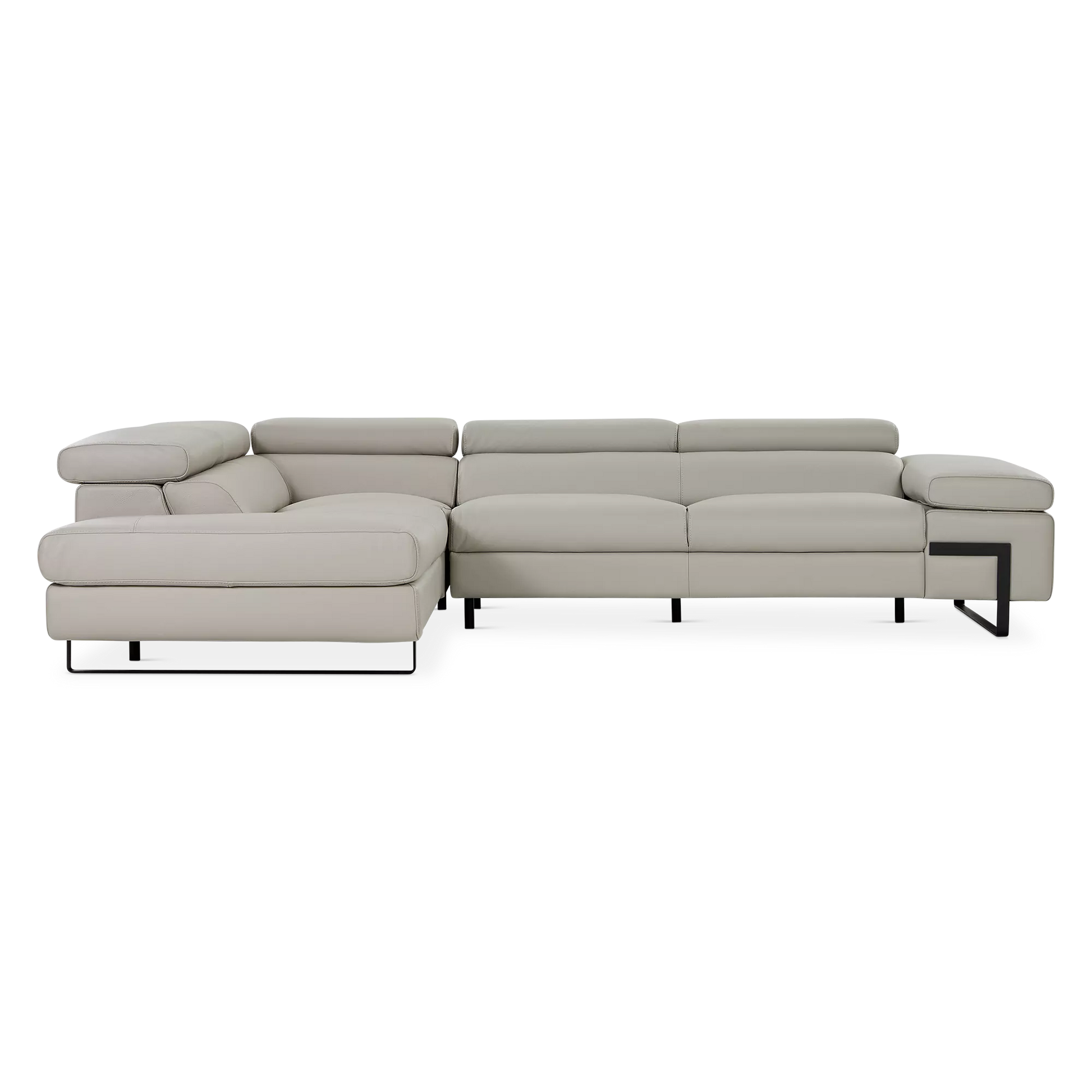 The Foulds sectional sofa adapts to your needs with its ample seating and adjustable head- and armrests. Upholstered in luminous, light-grey leather, generously padded and set on a slender metal frame, this modern seating solution marries customizable comfort and sleek sophistication to perfection.