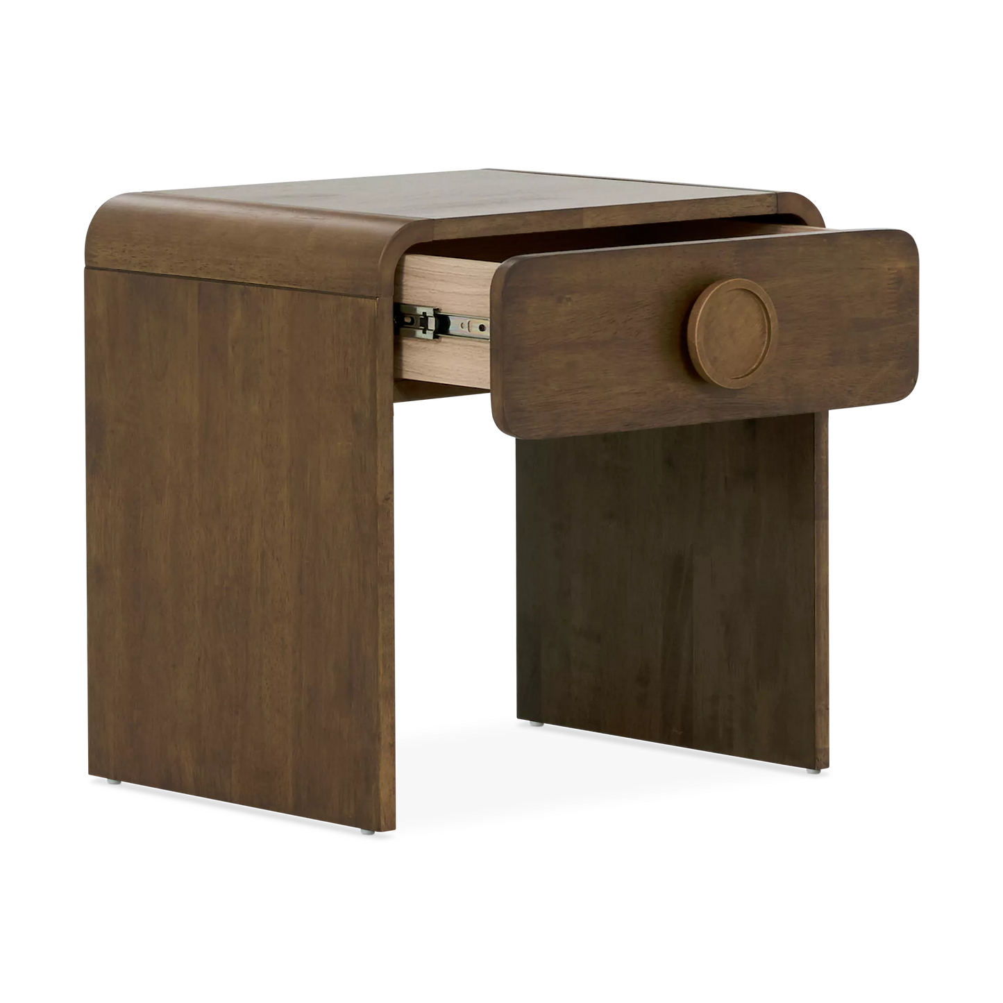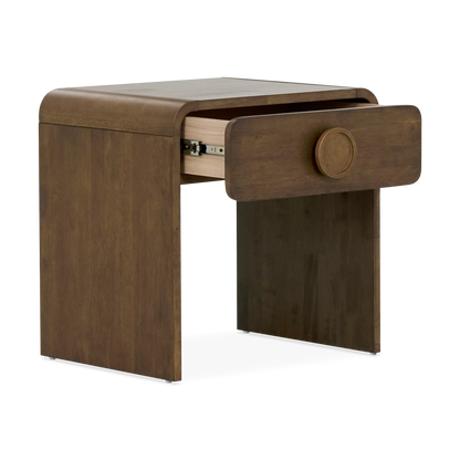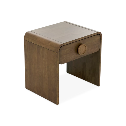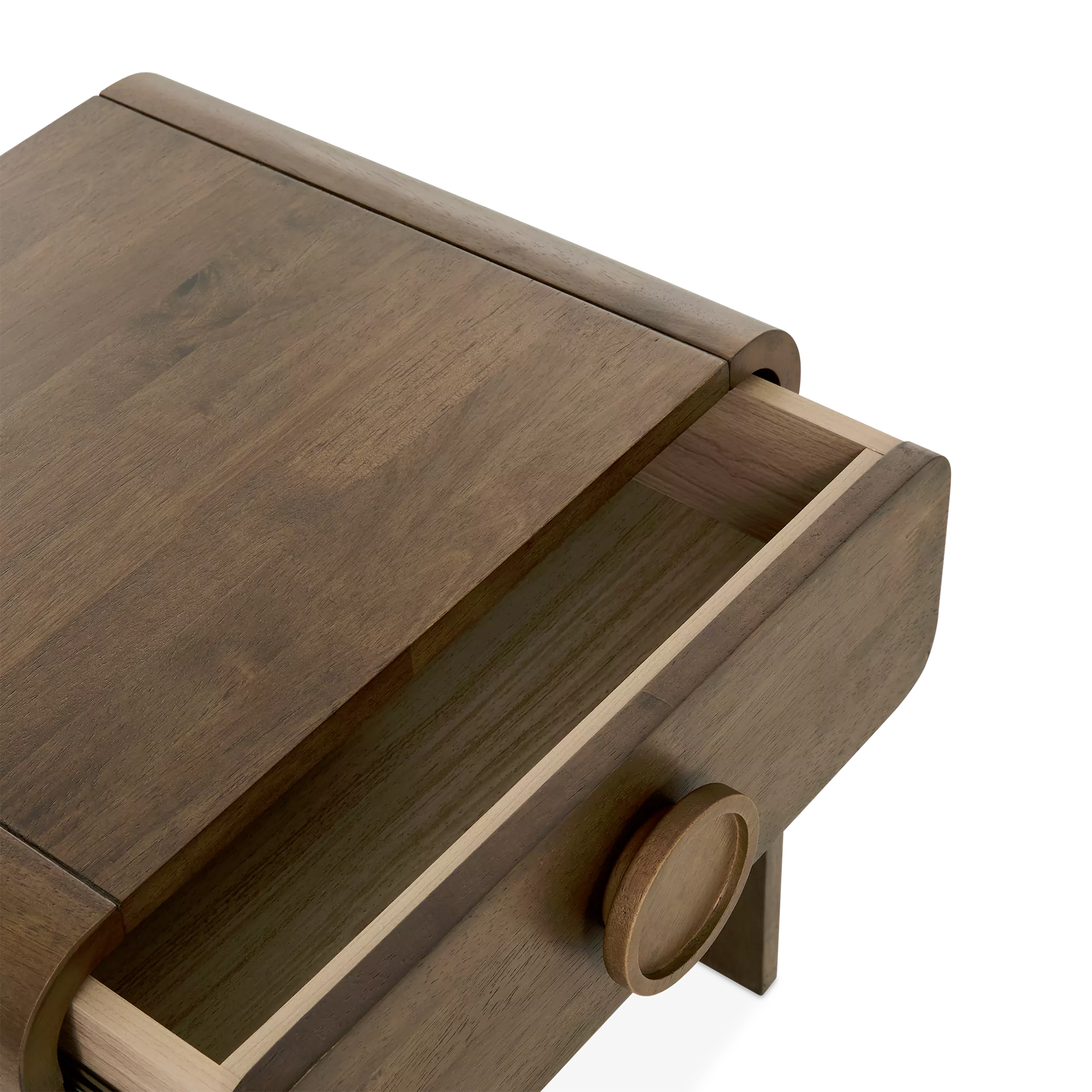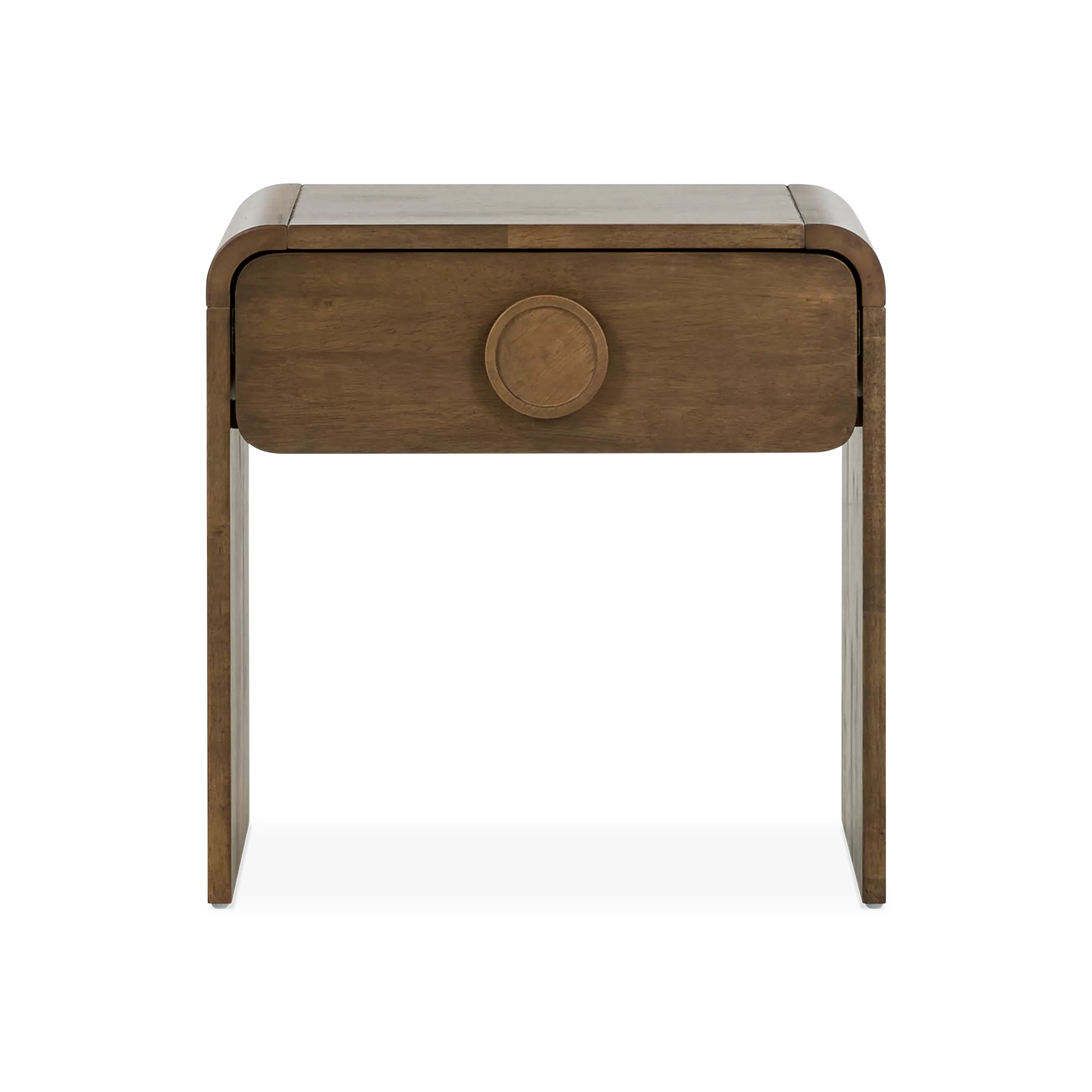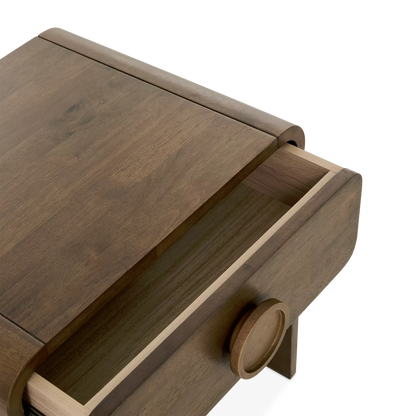 The François nightstand puts a fresh twist on 1960s style with its curved lines and distinctive circular handles. Crafted entirely from walnut veneer, it strikes the perfect balance between retro charm and modern design. With its central drawer and rounded countours, it will add a refined touch to any bedroom arrangement.