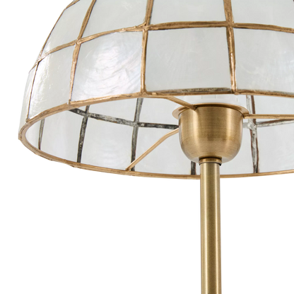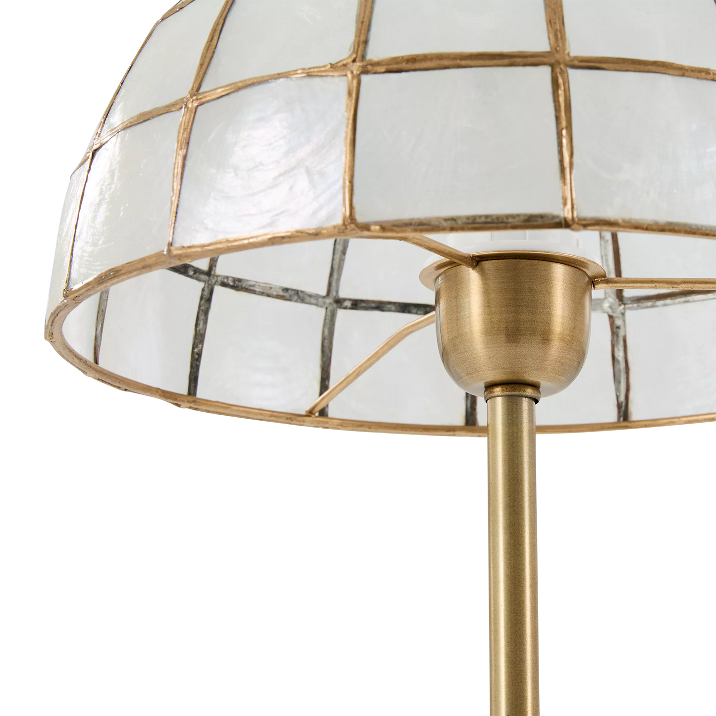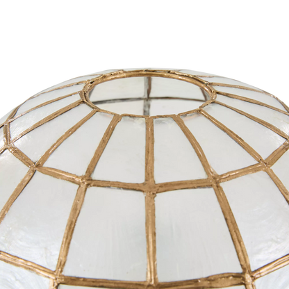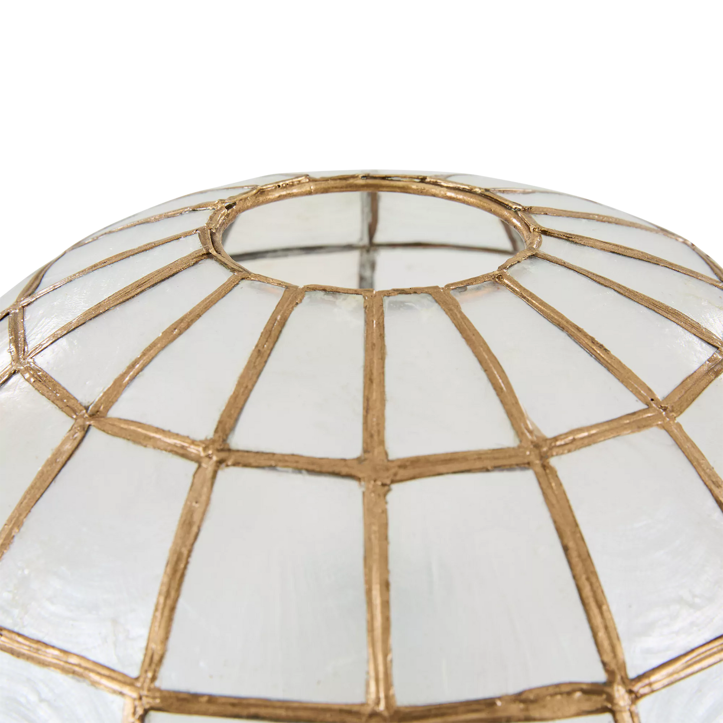 The Freedom lamp combines a round metal base with a gold finish and a dome-shaped shade made of natural capiz shells edged with a delicate gold trim. Its subtle reflections create a soft, sparkling light, ideal for adding a refined and luminous touch to a side table, console table, or bedroom.