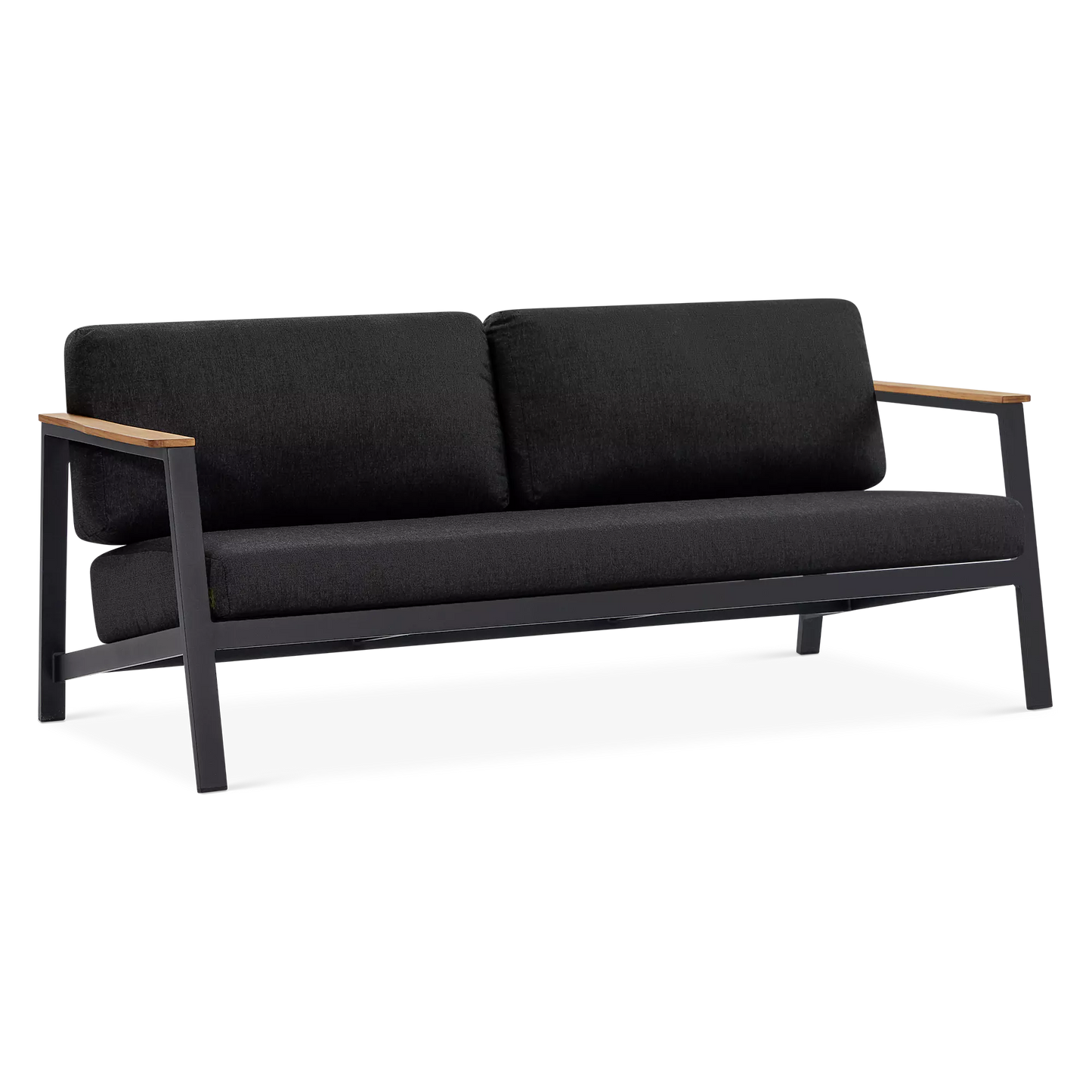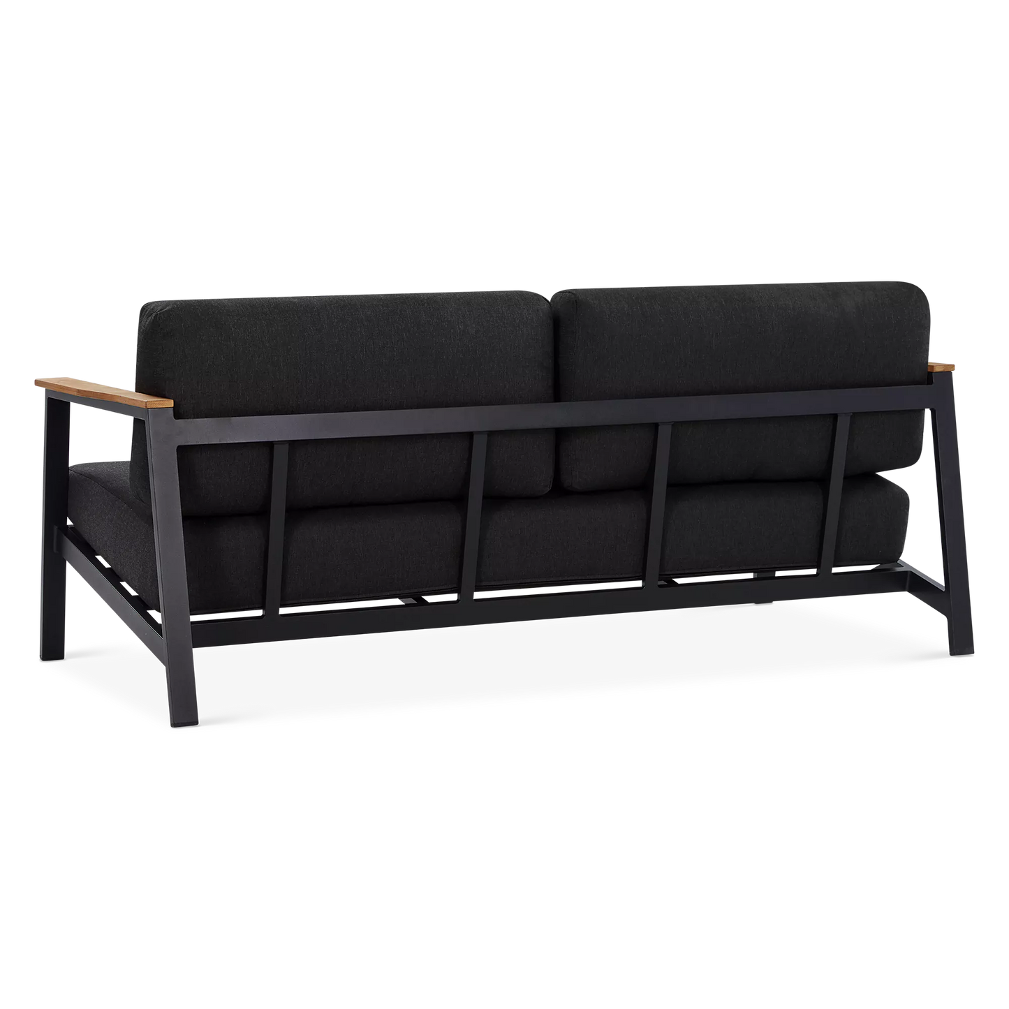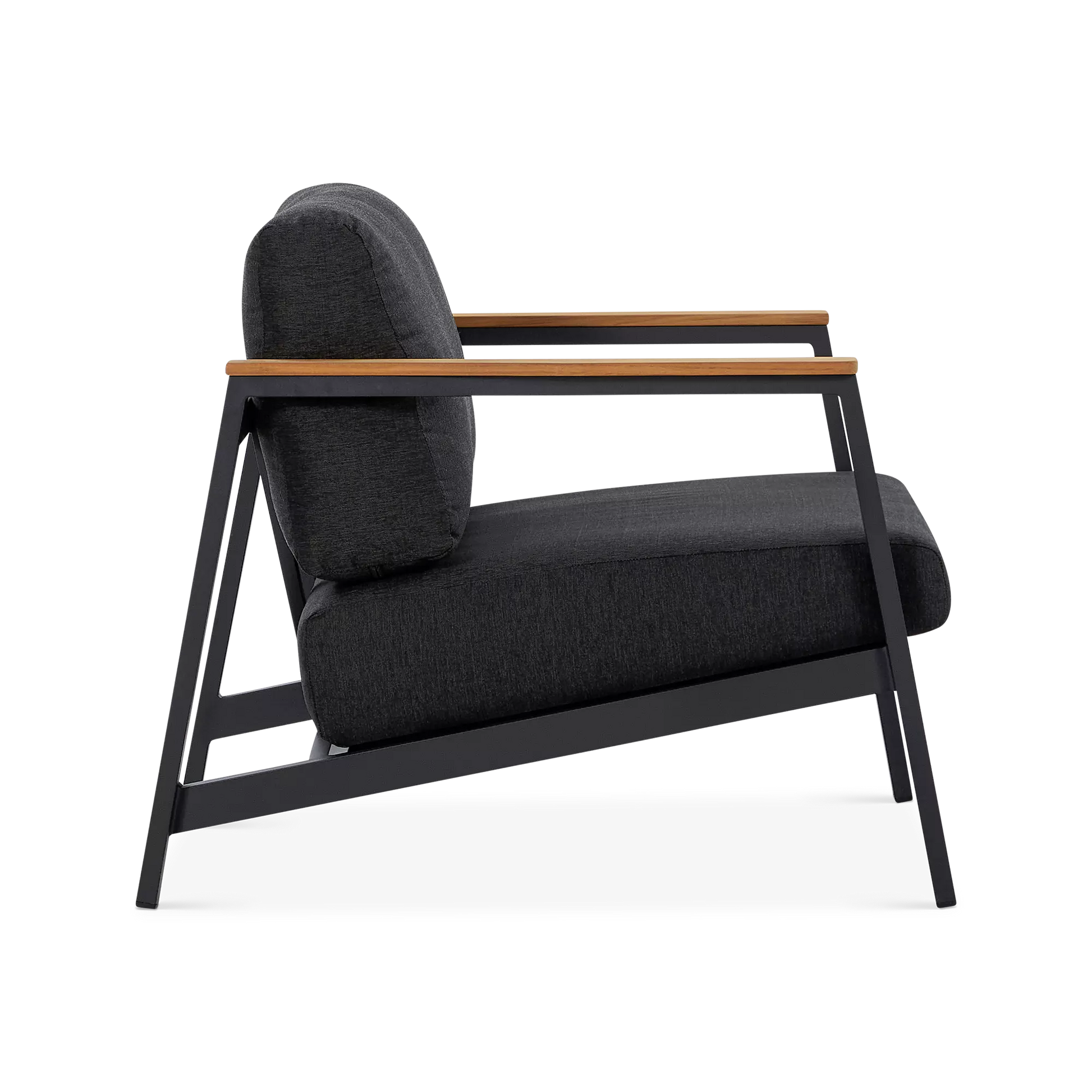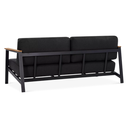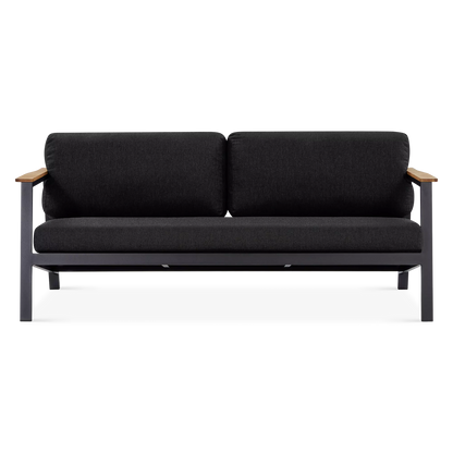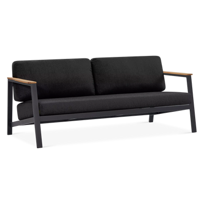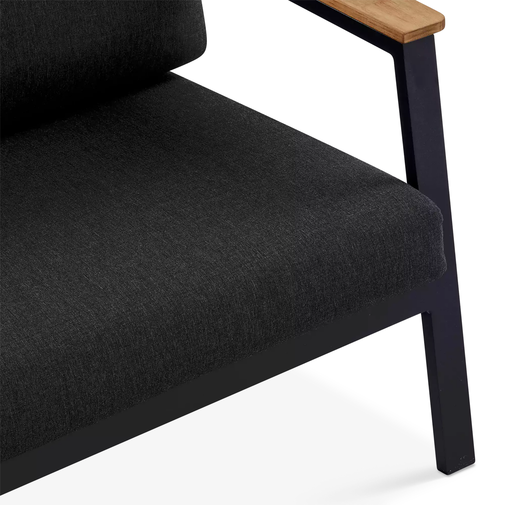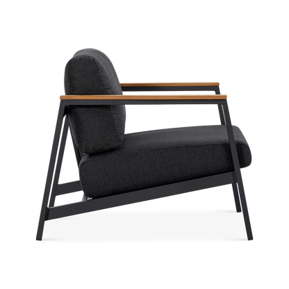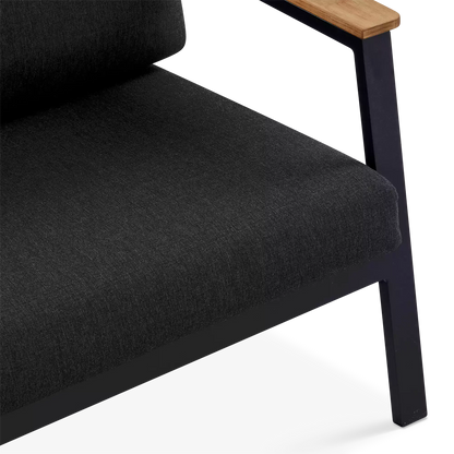 On a veranda in the country or a balcony in the city, the Geo sofa and armchair set will enhance smaller spaces to perfection with its modern design and compact size. Mounted on an aluminium frame, topped with plump cushions upholstered in acrylic fabric and adorned with elegant teak inserts, the Geo sofa and armchair set is designed to brave the elements while lending comfort and a modern look to your outdoor space.