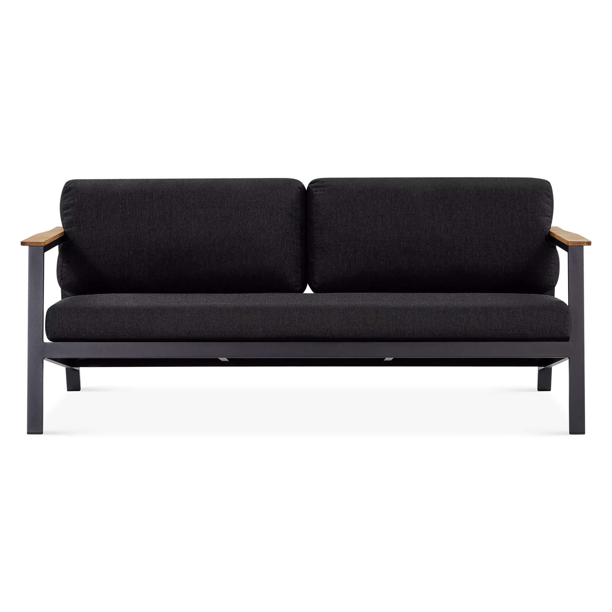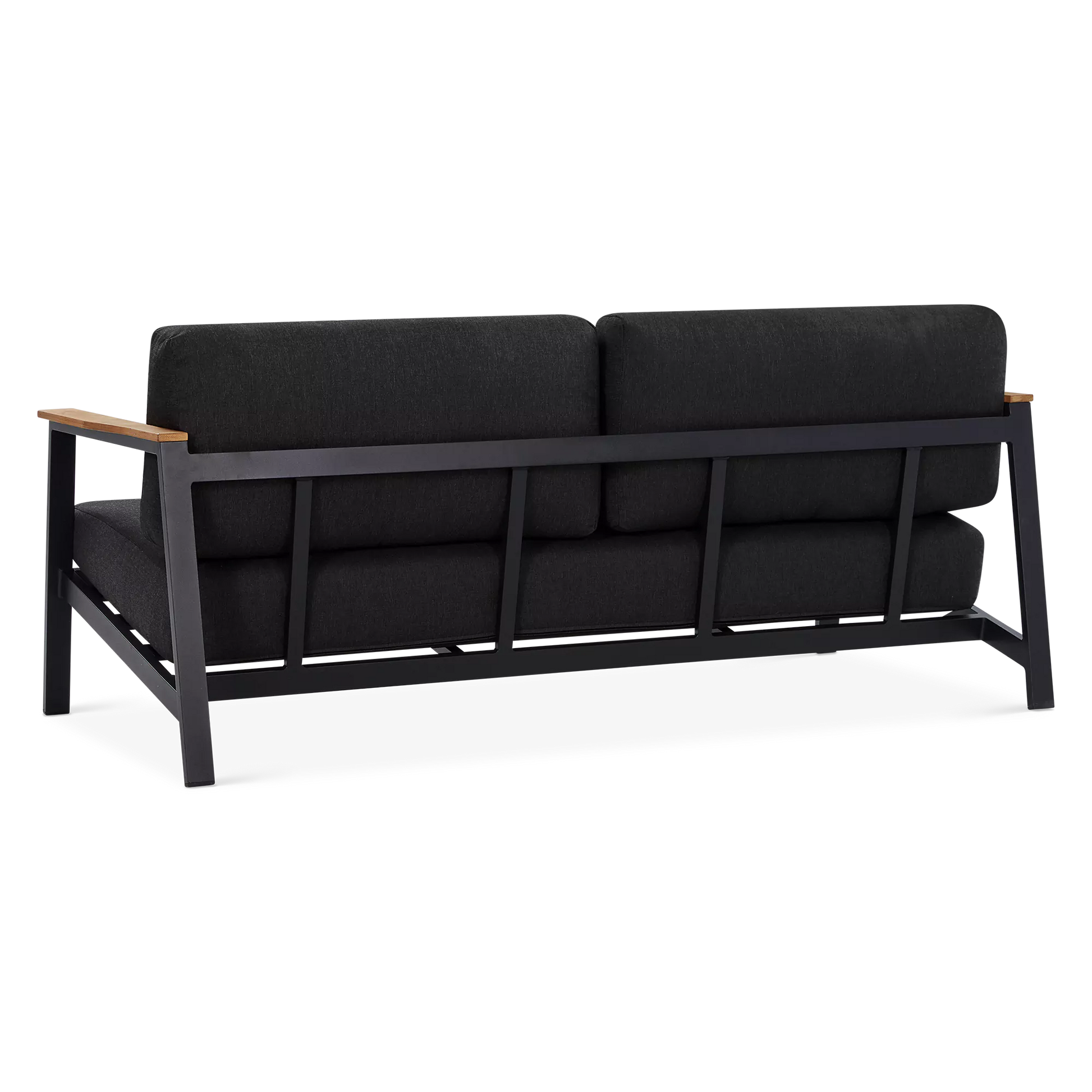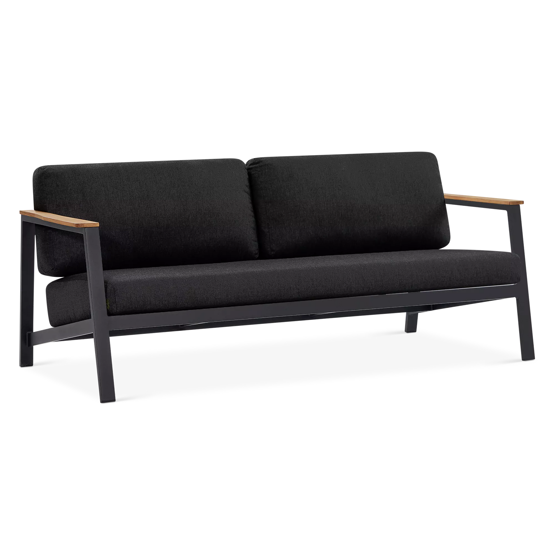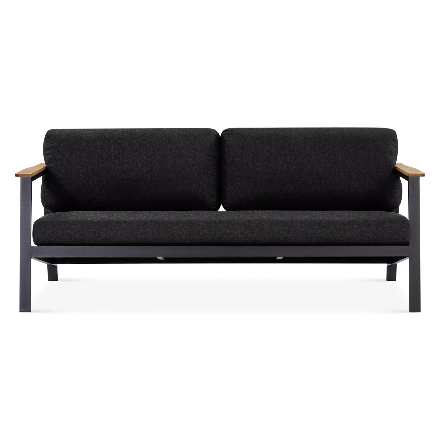 On a veranda in the country or a balcony in the city, the Geo sofa and armchair set will enhance smaller spaces to perfection with its modern design and compact size. Mounted on an aluminium frame, topped with plump cushions upholstered in acrylic fabric and adorned with elegant teak inserts, the Geo sofa and armchair set is designed to brave the elements while lending comfort and a modern look to your outdoor space.
