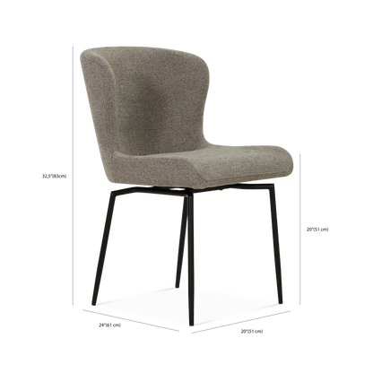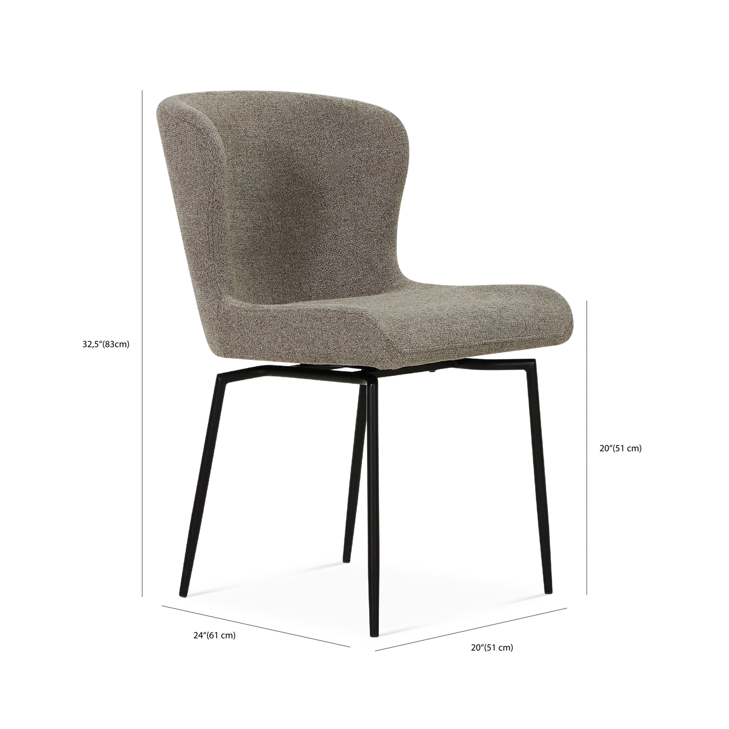 The Glam dining chair embodies sophistication with its sculpted silhouette and effortlessly chic look. Designed for both comfort and style, it features a gently contoured seat covered in bouclé fabric for a lavish seating experience. Its gracefully angled, swivel base features a seamless auto-return function for ease of movement and a contrasting black finish for a modern effect.