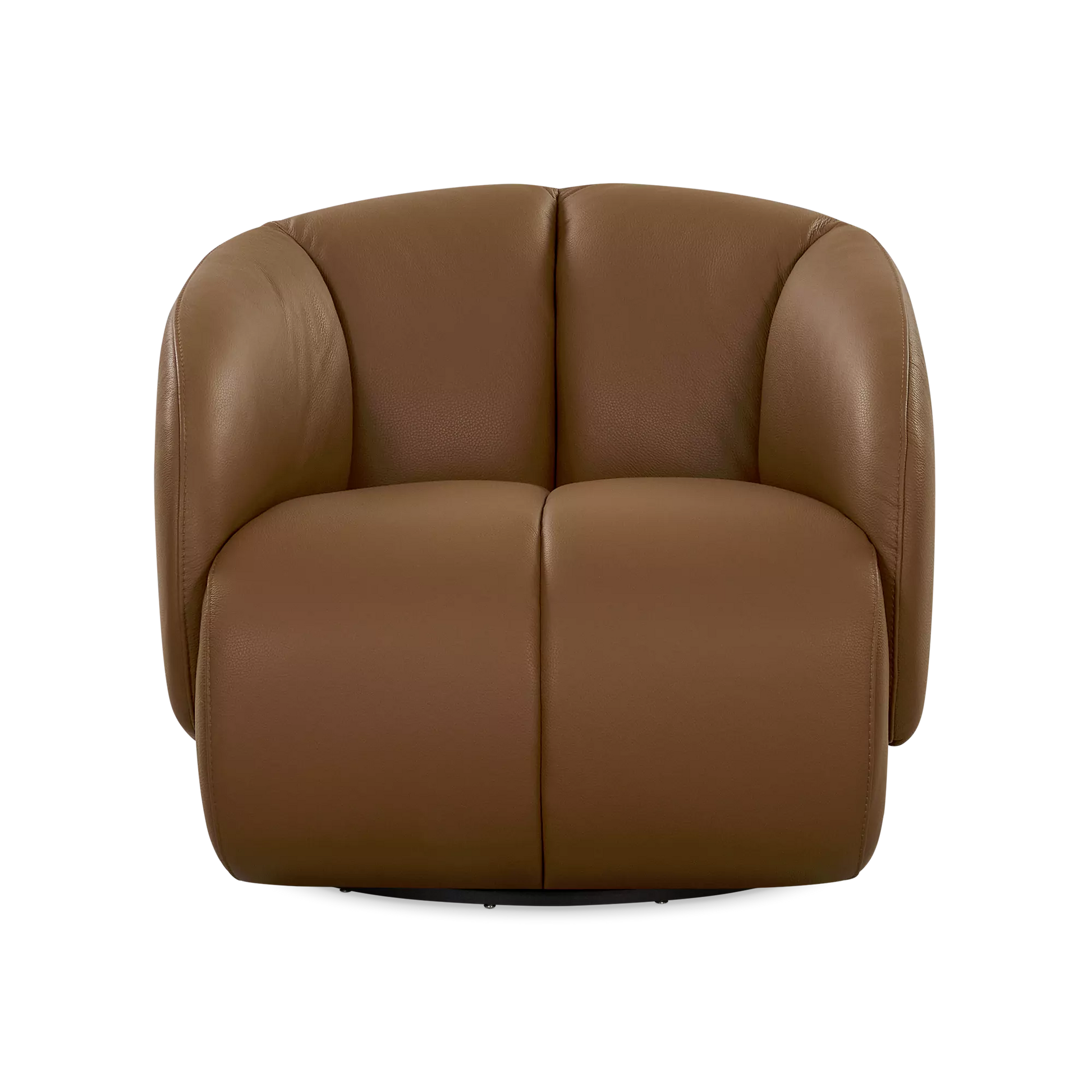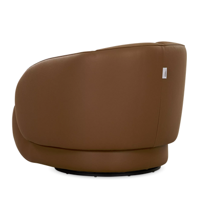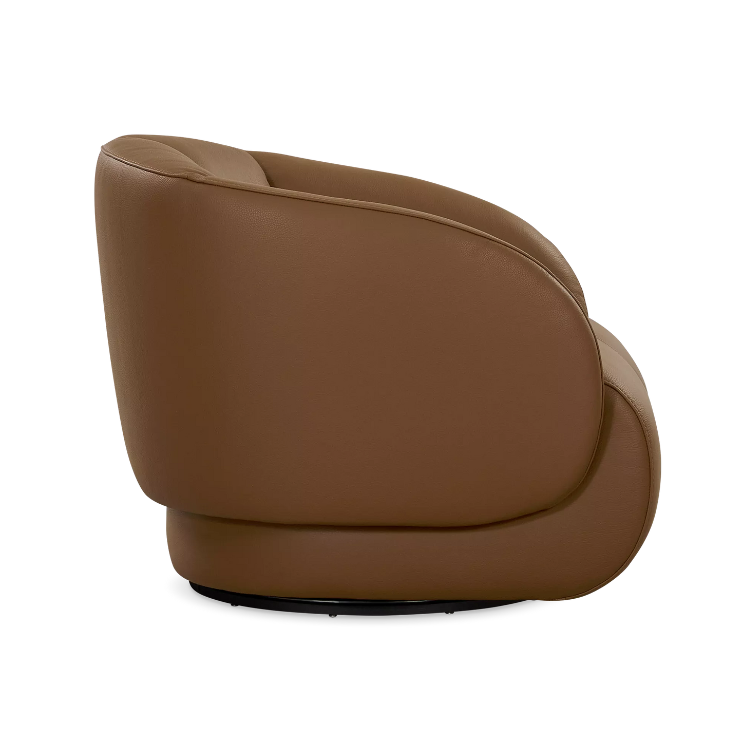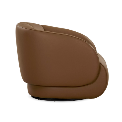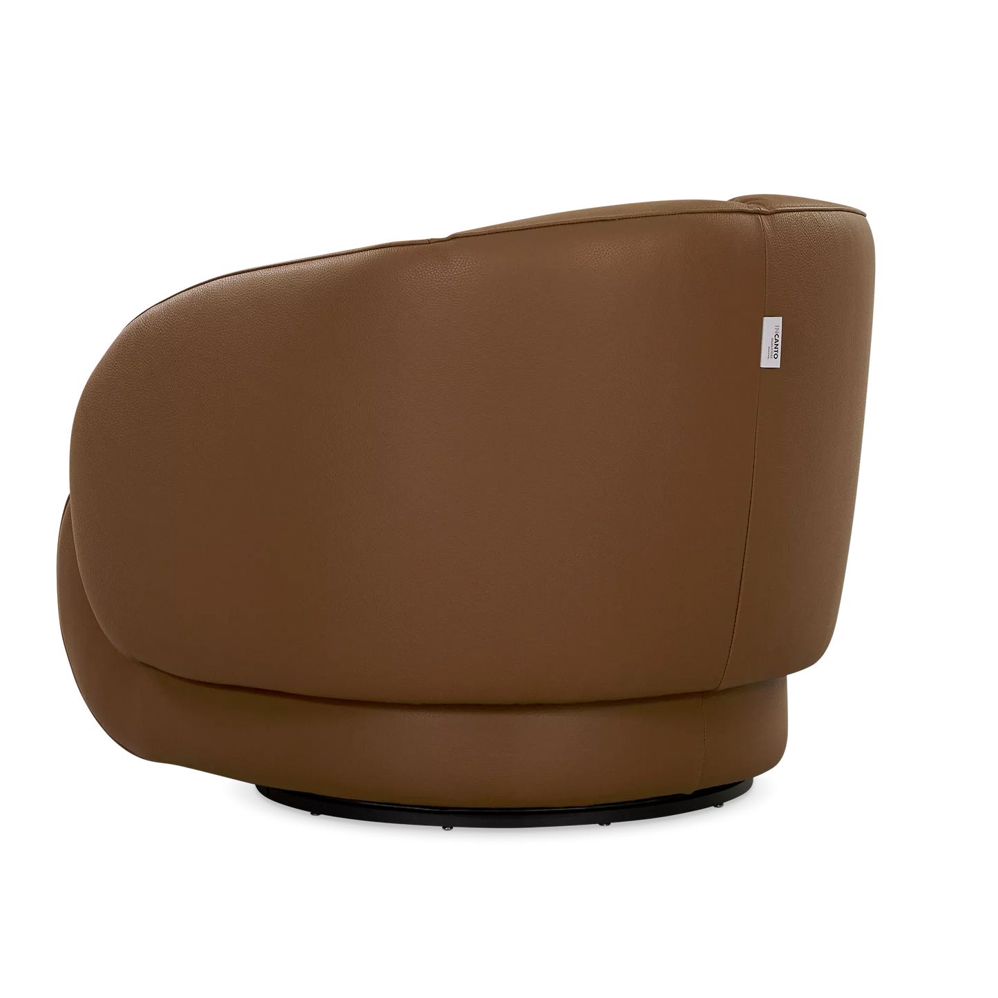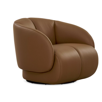 The Halo swivel chair it at once sculptural and inviting. Its continuous silhouette curves gracefully, enveloping the body in plush comfort and modern ease. Upholstered in sumptuous leather, it will bring a luxurious touch to any living space with its rich finish and refined tufting. A 360-degree swivel base enhances its dynamic presence, making it as functional as it is captivating. An artful addition that’s ready to anchor any living room or reading nook.